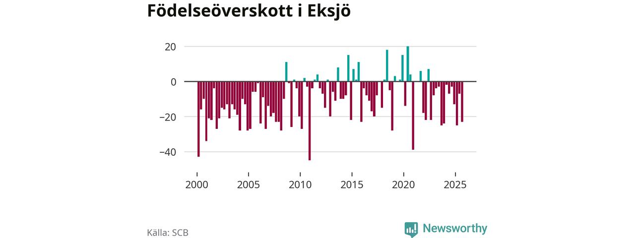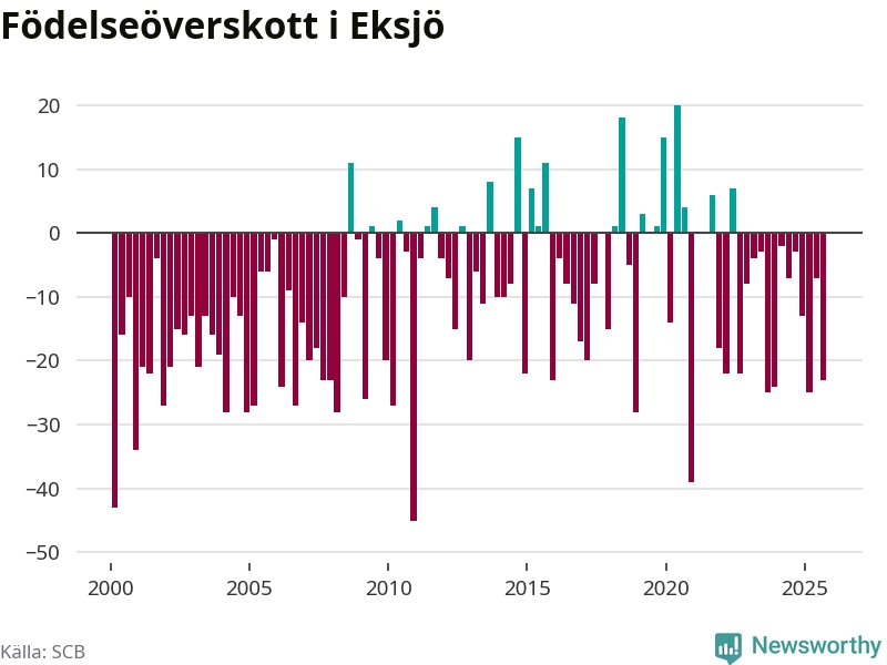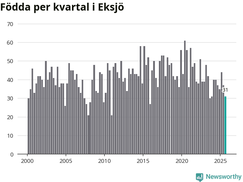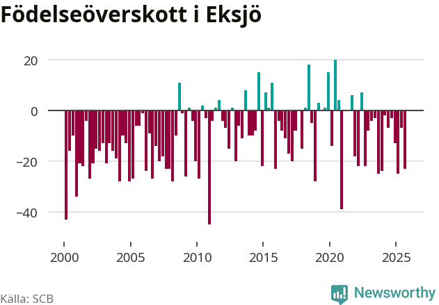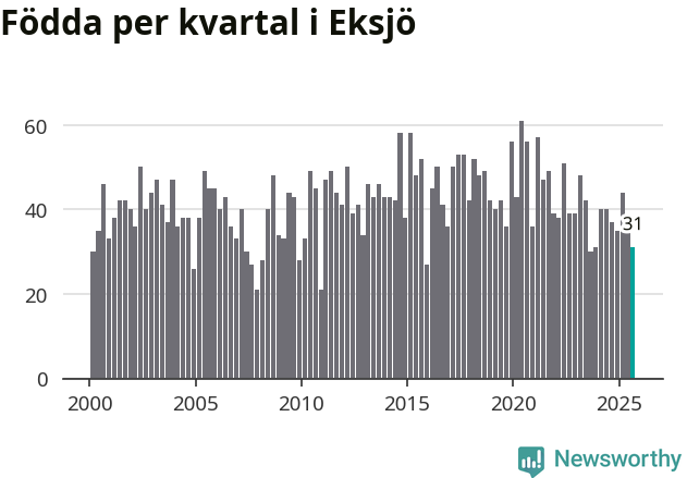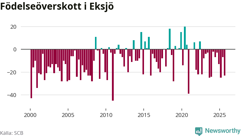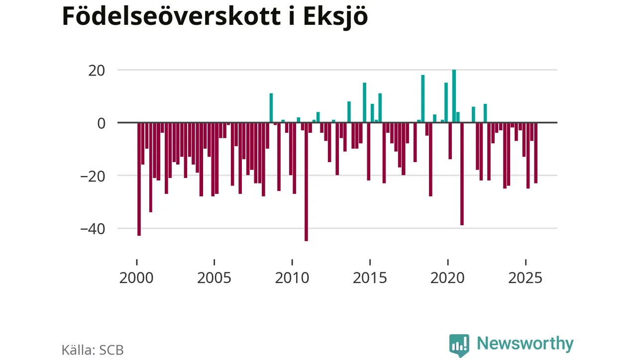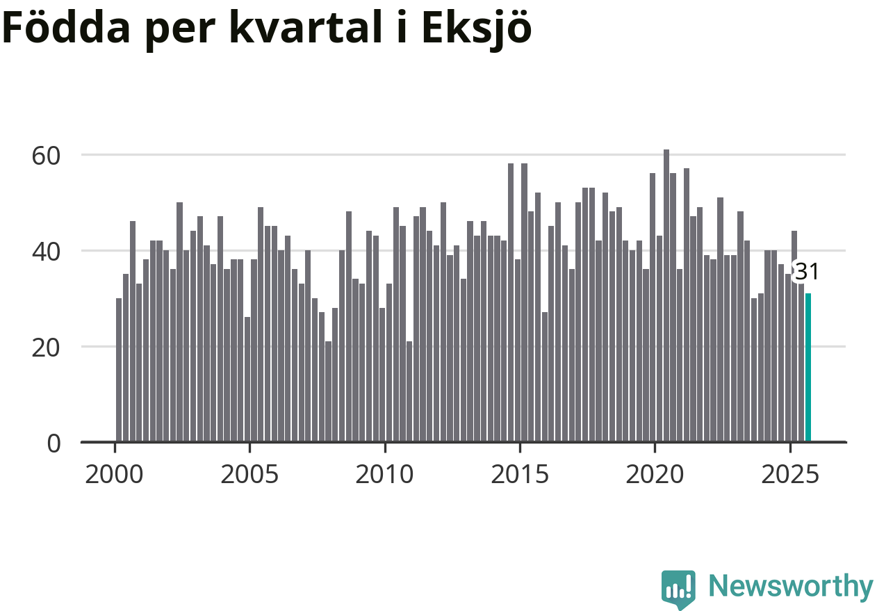 Enligt SCB:s siffror föddes 31 barn i Eksjö under det senaste kvartalet. Samtidigt avled 54 personer. Eksjö hade alltså ett negativt födelsenetto, vilket kommunen historiskt sett oftast har haft.