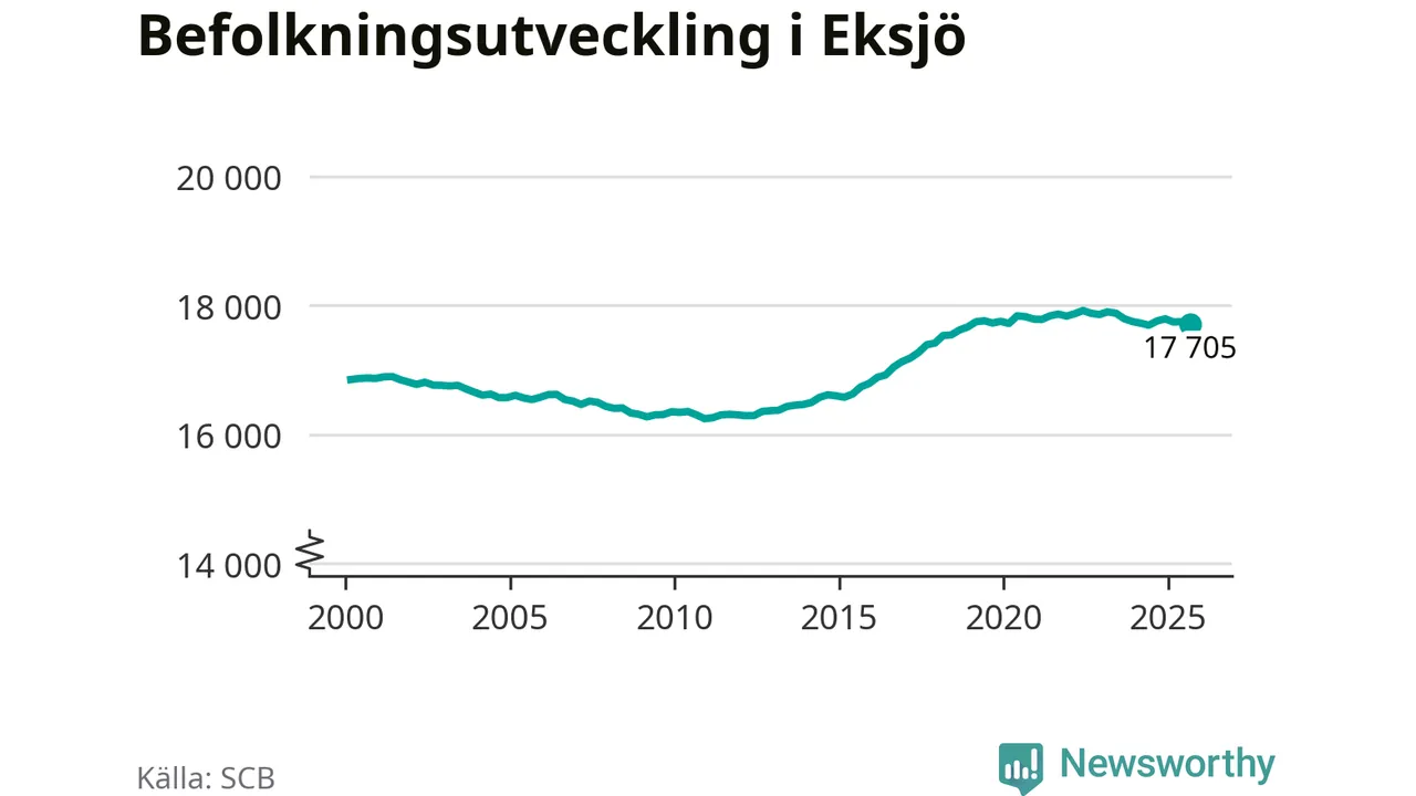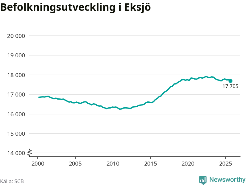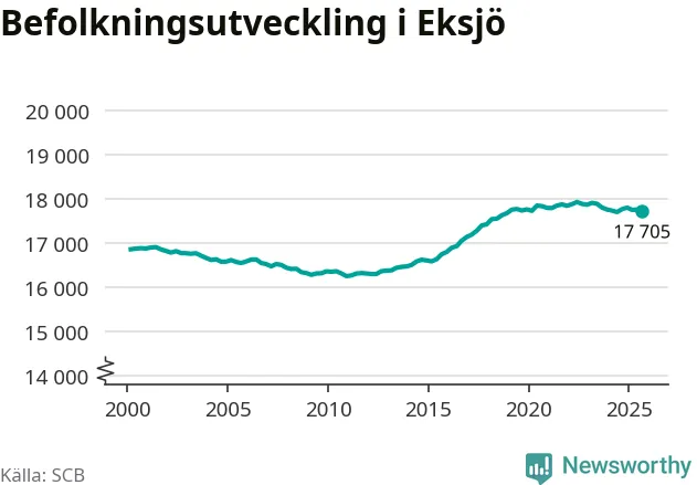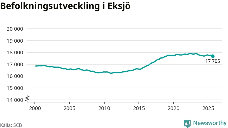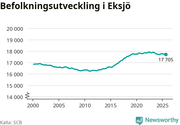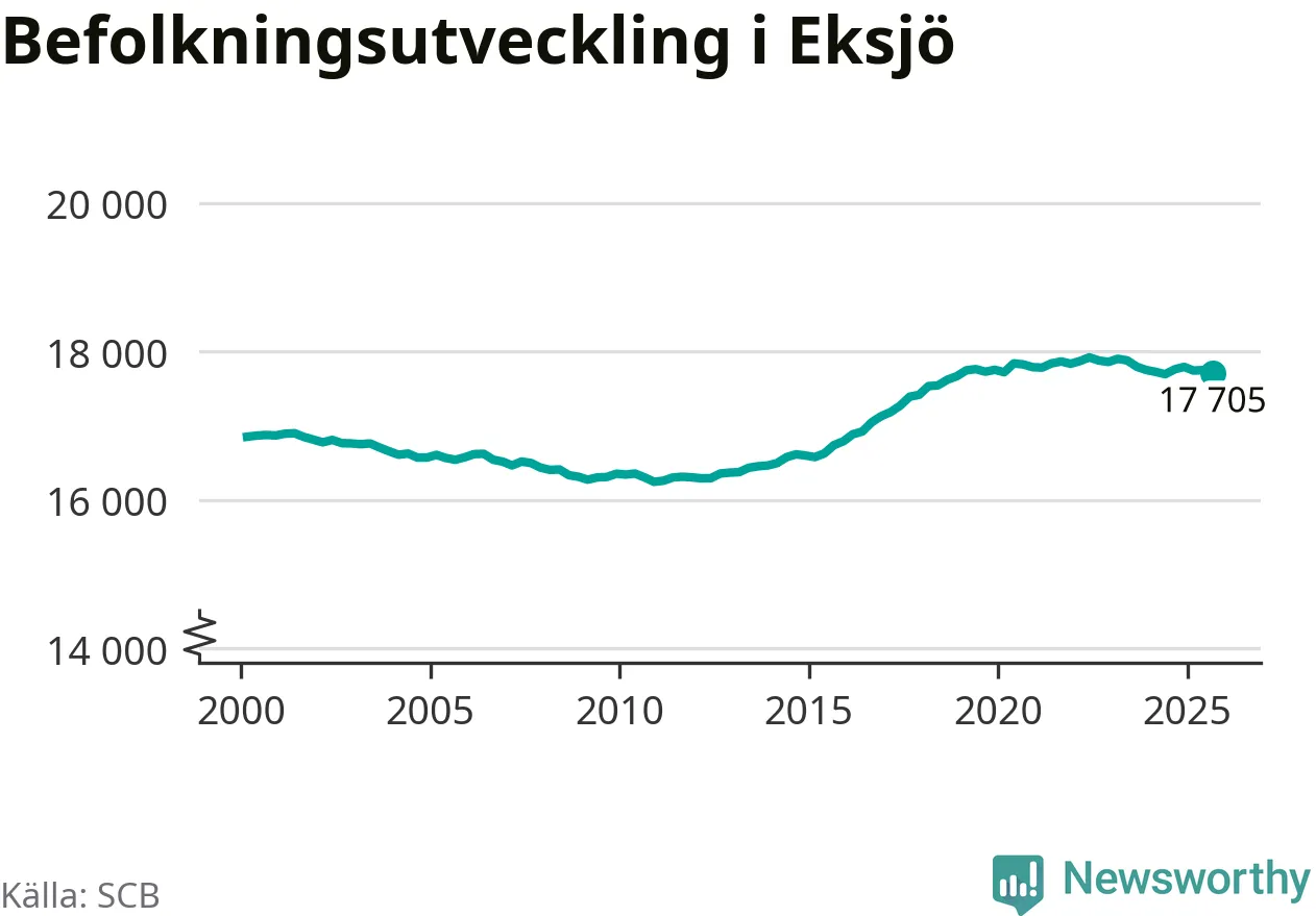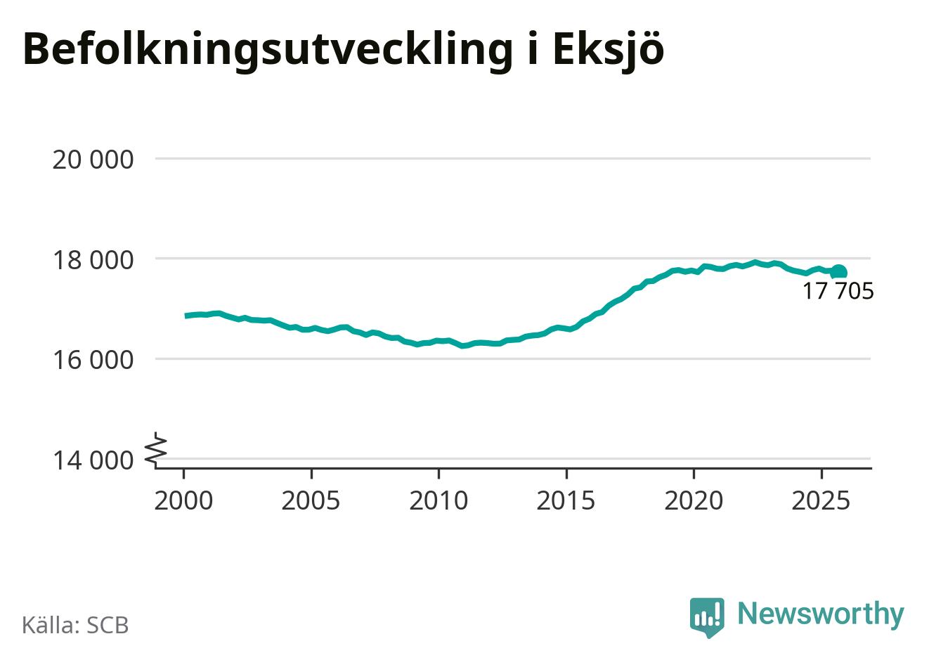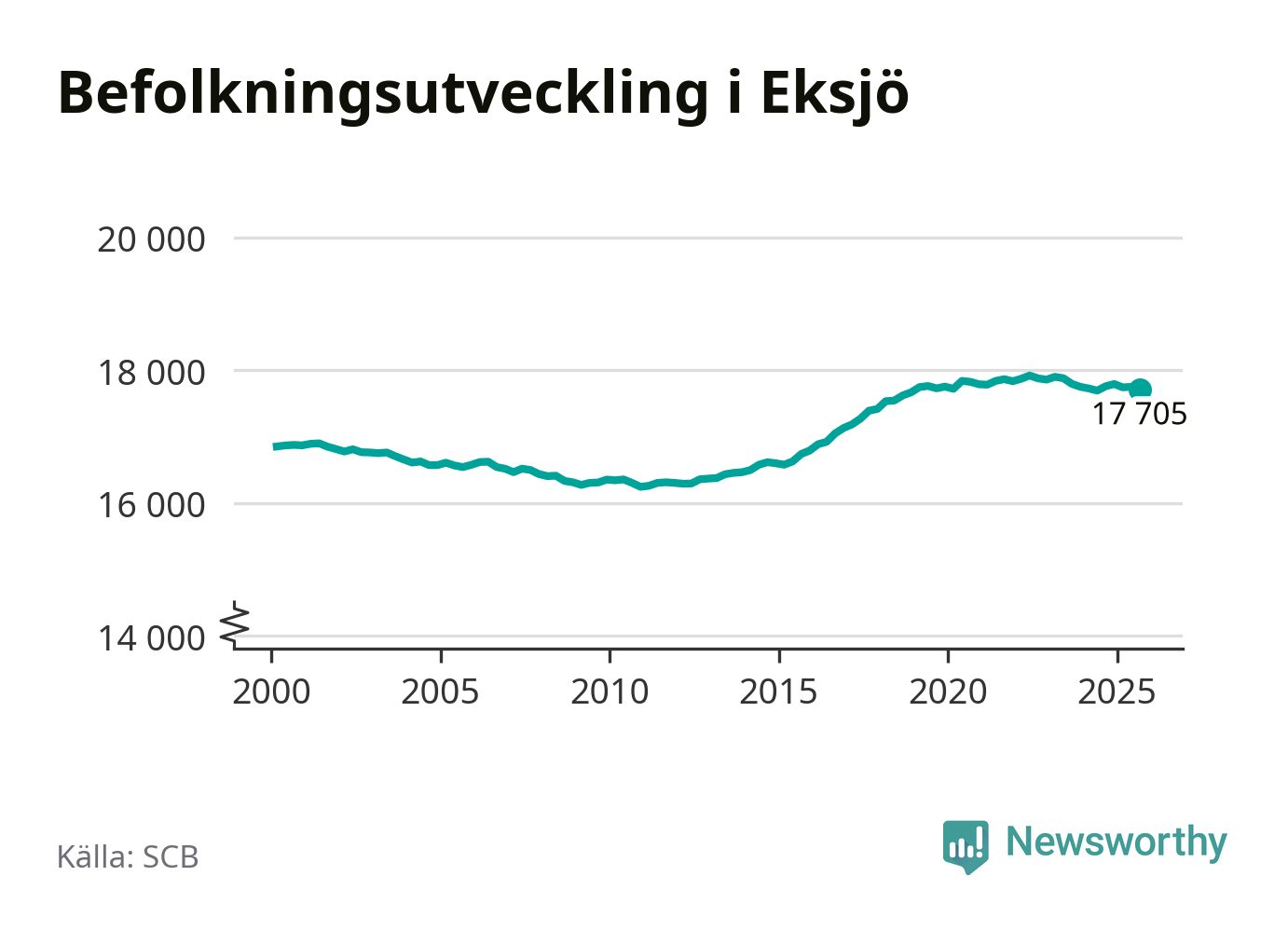 Jämfört med för ett år sedan har befolkningen i Eksjö minskat med drygt 50 personer. Sedan millennieskiftet har folkmängden ökat med runt 850 personer, eller 5 procent.