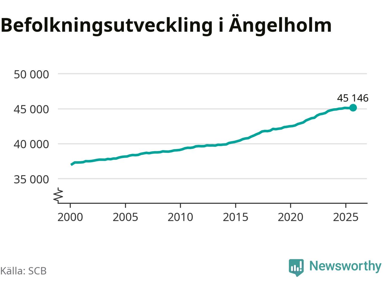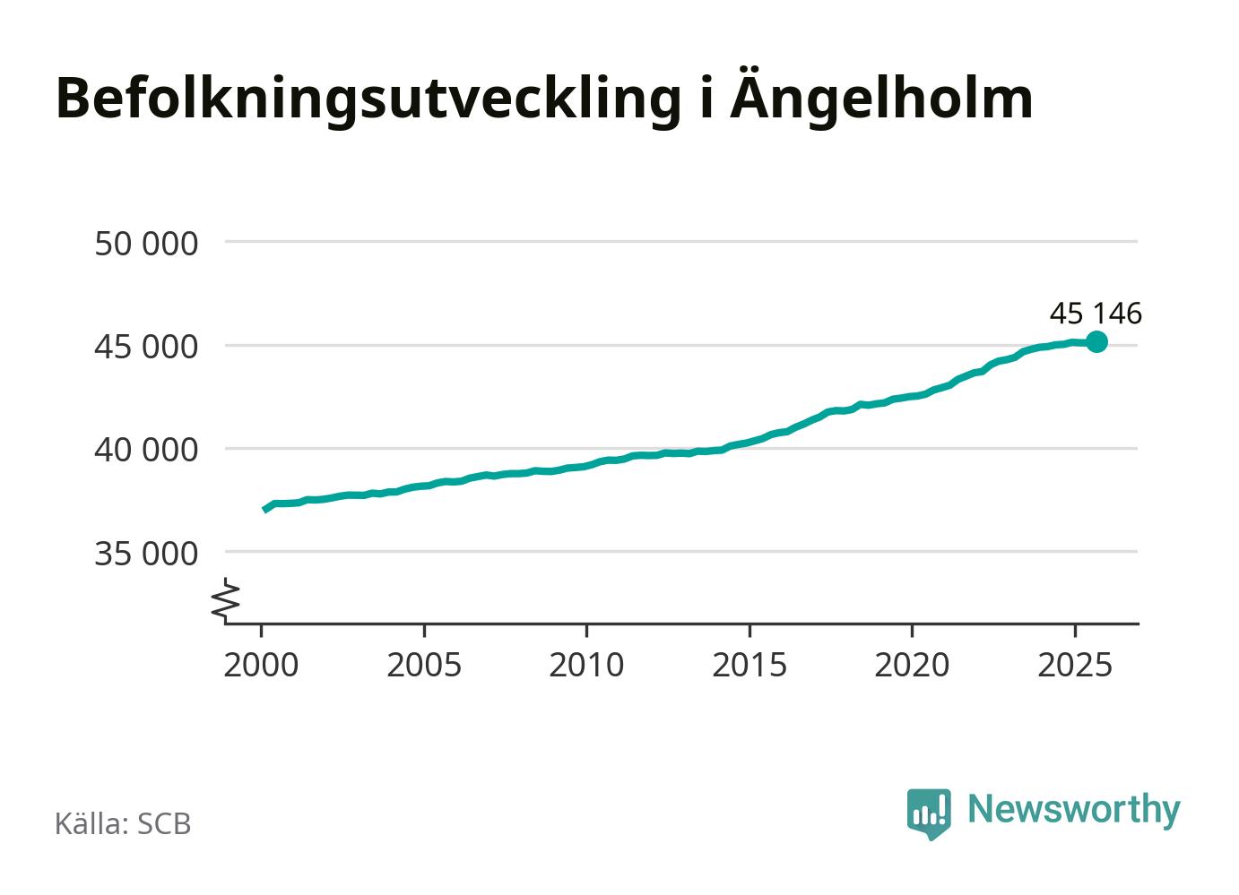 Jämfört med för ett år sedan har befolkningen i Ängelholm ökat med ungefär 140 personer. Sedan millennieskiftet har folkmängden ökat med runt 8 100 personer, eller 22 procent.