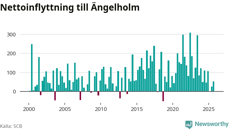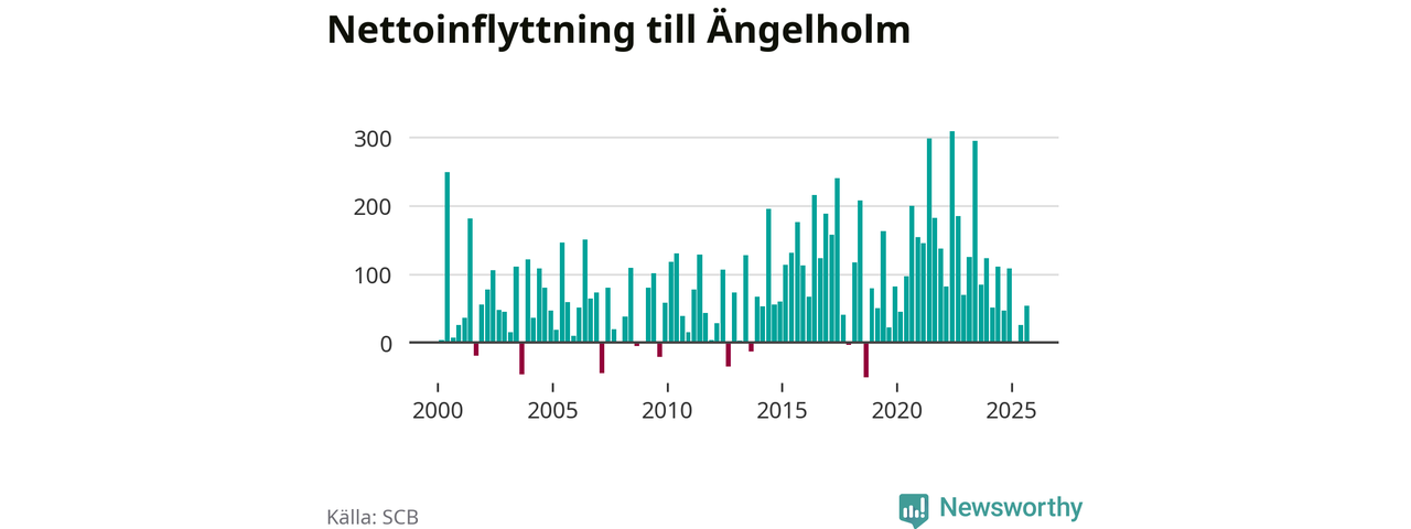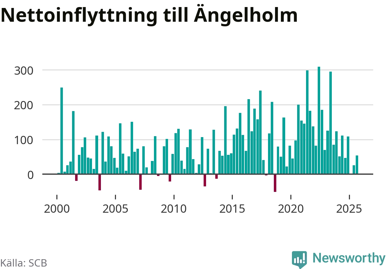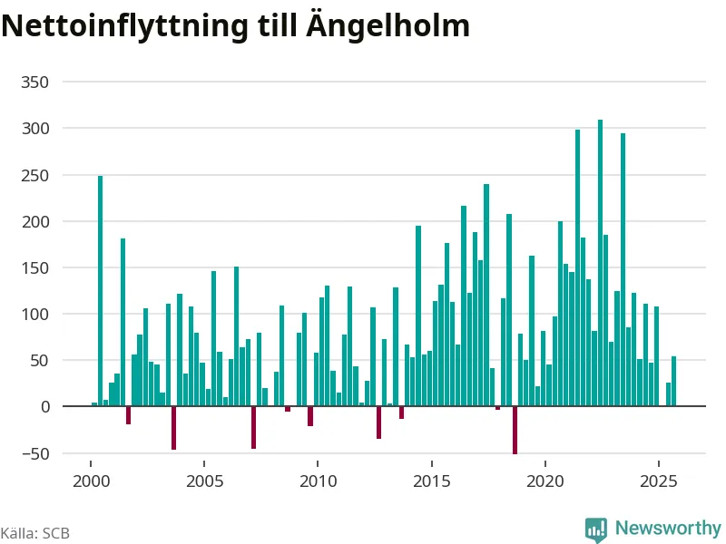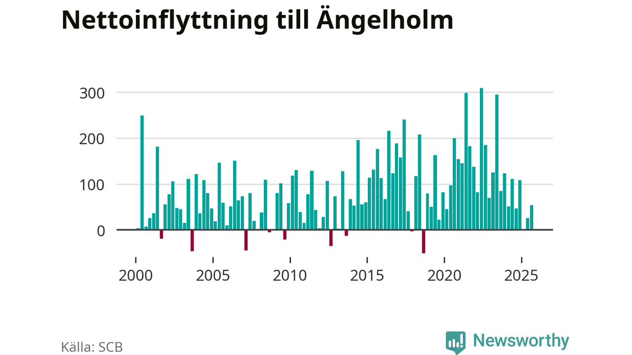 Under tredje kvartalet 2025 flyttade 700 personer till kommunen medan 646 personer flyttade därifrån. Det är historiskt sett en stor utflyttning under ett kvartal. Sedan seklets början har Ängelholm haft ett positivt flyttnetto under nästan alla kvartal, inklusive det senaste kvartalet.