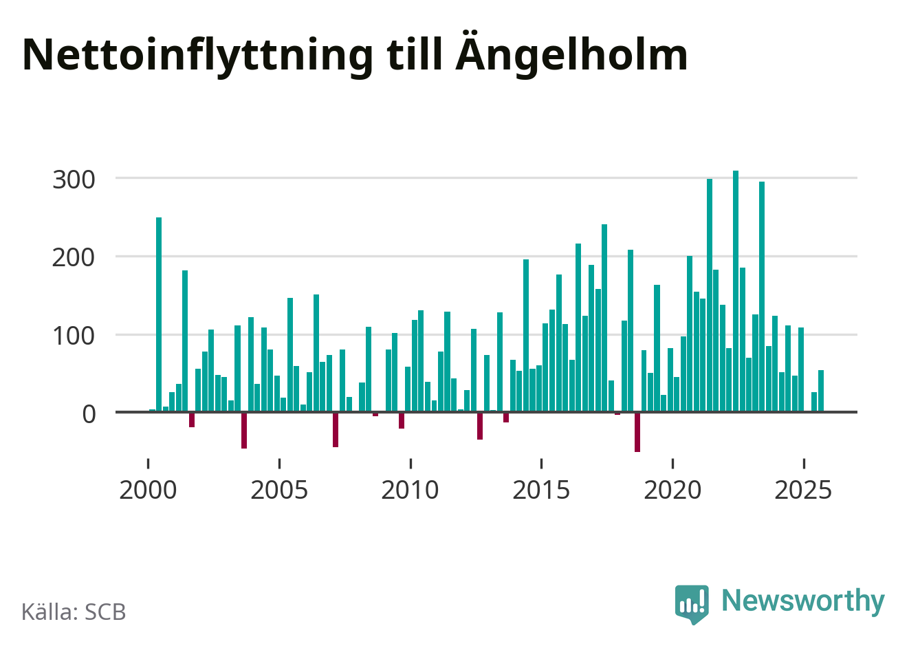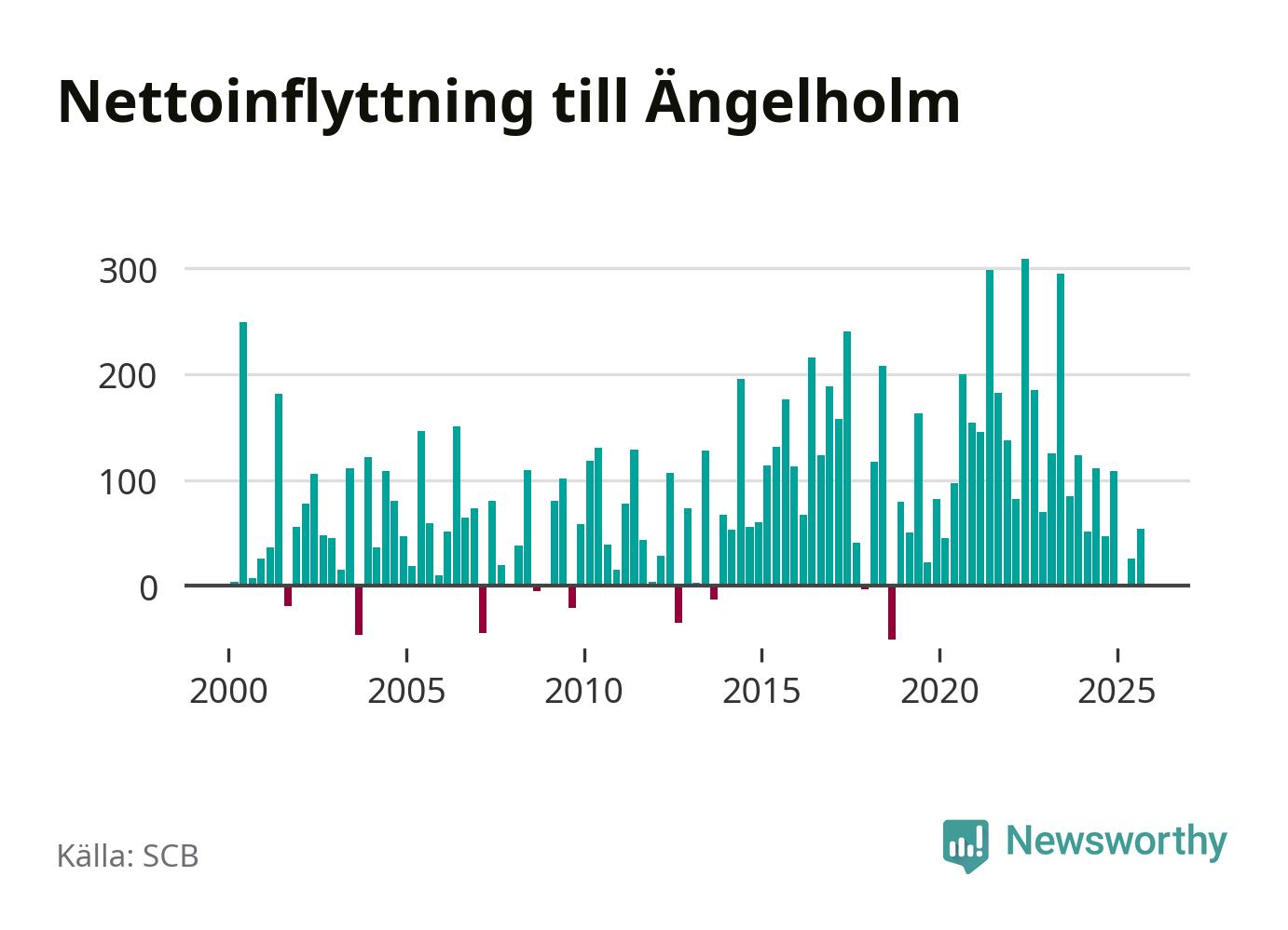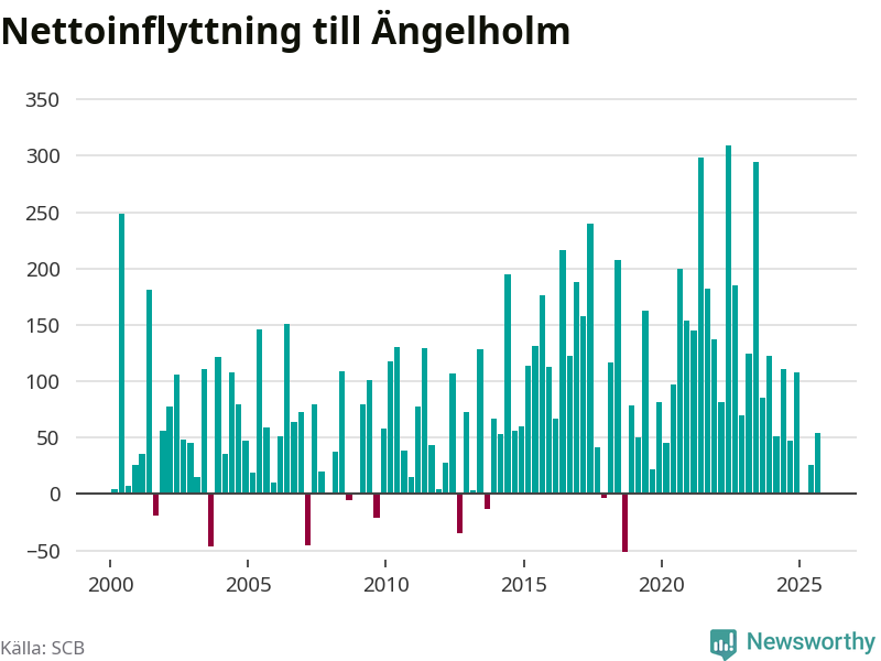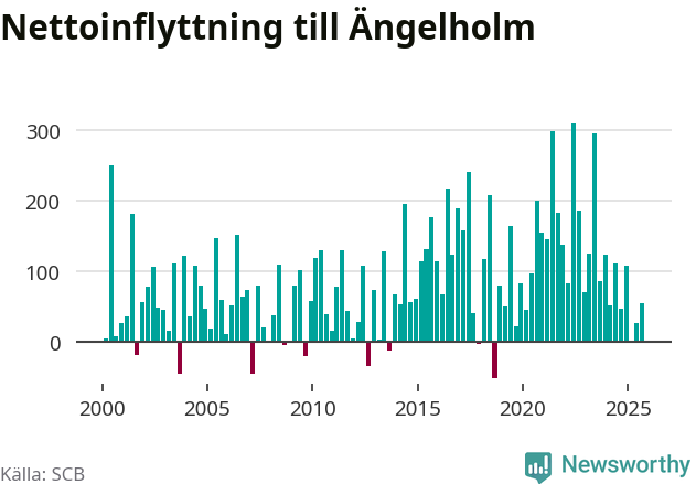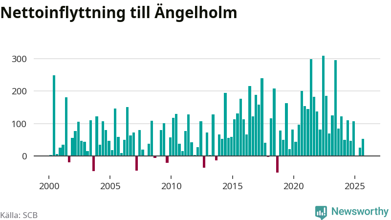 Under tredje kvartalet 2025 flyttade 700 personer till kommunen medan 646 personer flyttade därifrån. Det är historiskt sett en stor utflyttning under ett kvartal. Sedan seklets början har Ängelholm haft ett positivt flyttnetto under nästan alla kvartal, inklusive det senaste kvartalet.