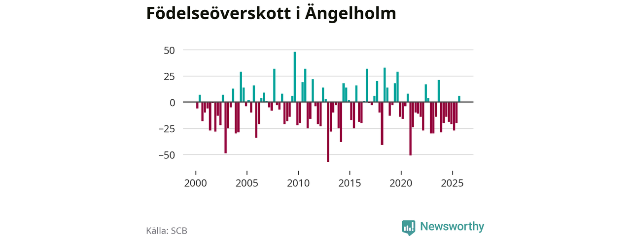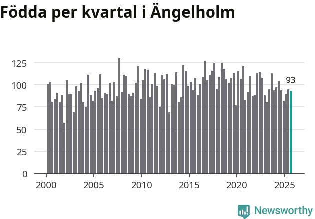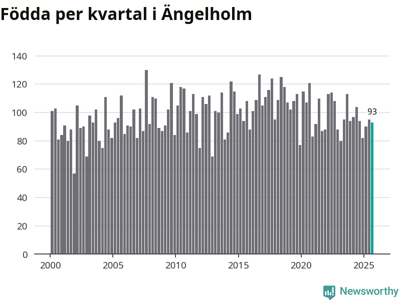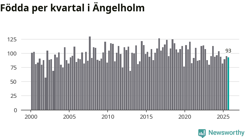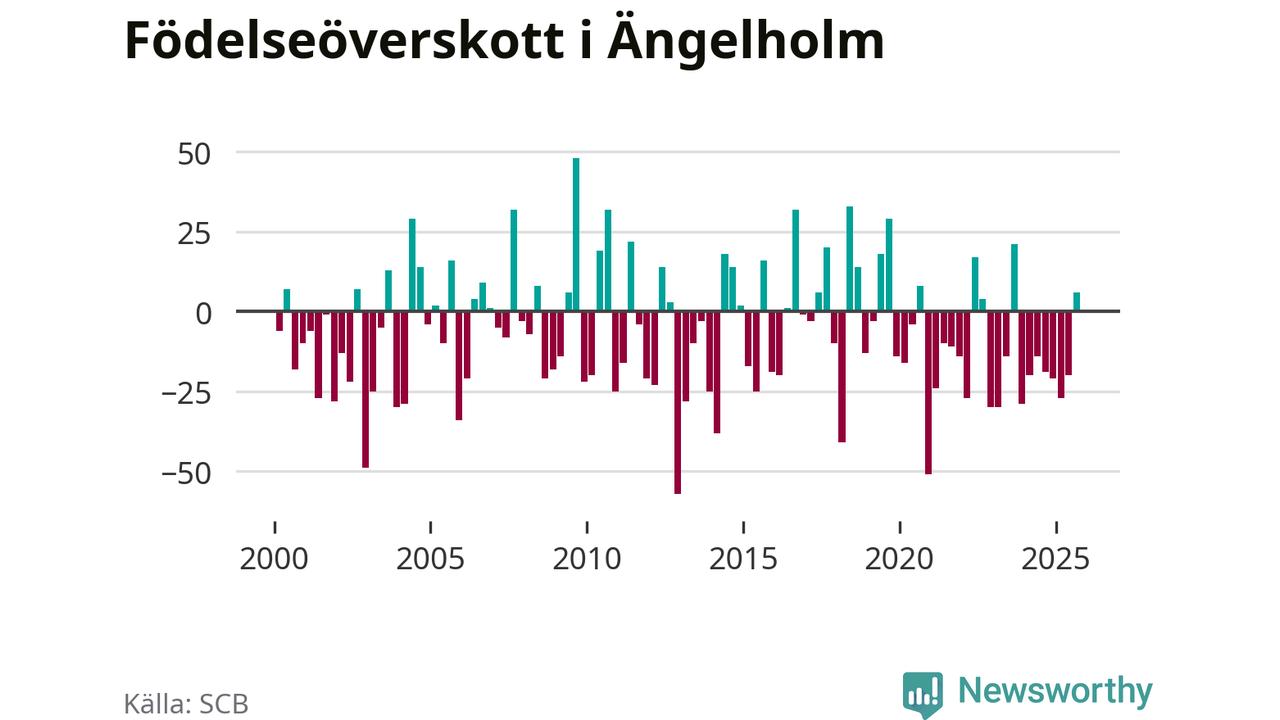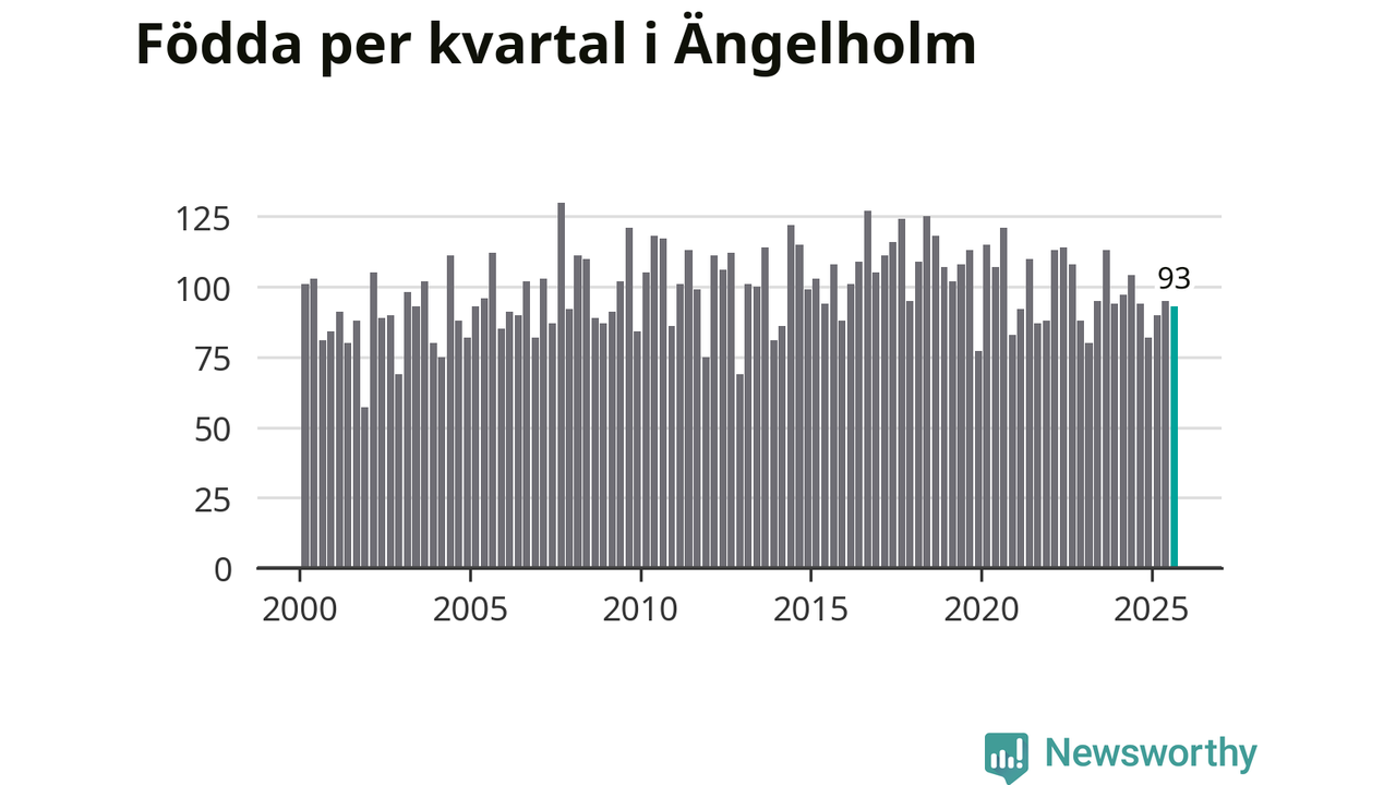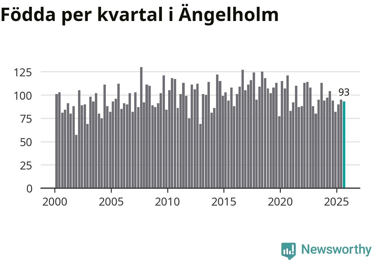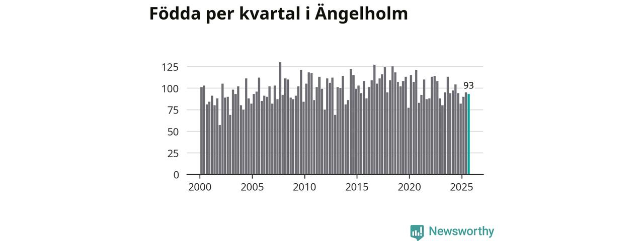 Enligt SCB:s siffror föddes 93 barn i Ängelholm under det senaste kvartalet. Samtidigt avled 87 personer. Skillnaden mellan antal födda och döda är så liten att det inte går att säga om det beror på något annat än SCB:s röjandeskydd. Kommunen har oftast haft negativt födelsenetto tidigare.