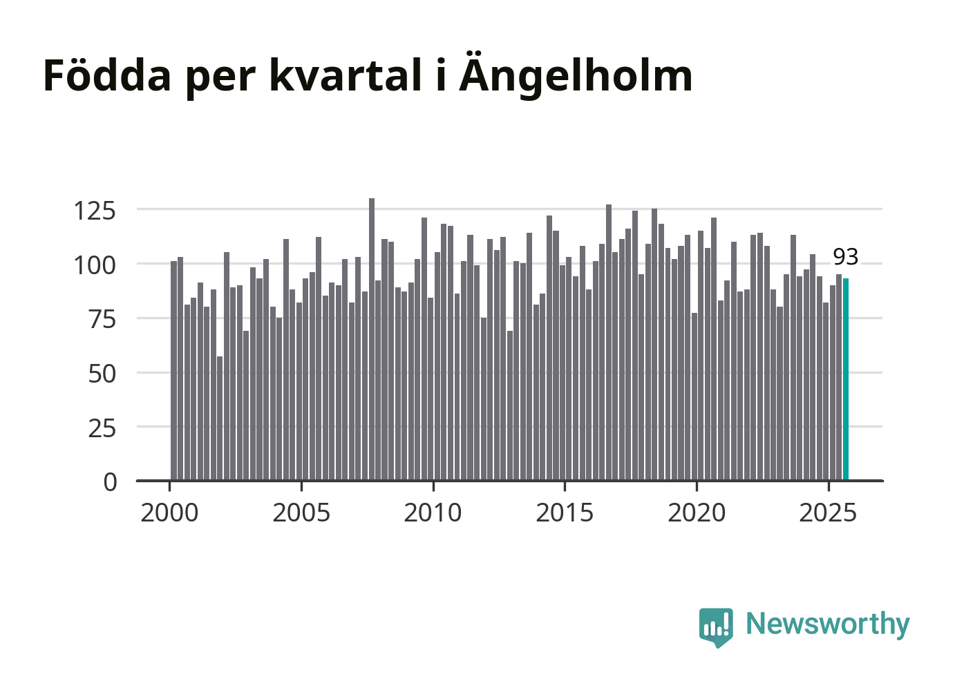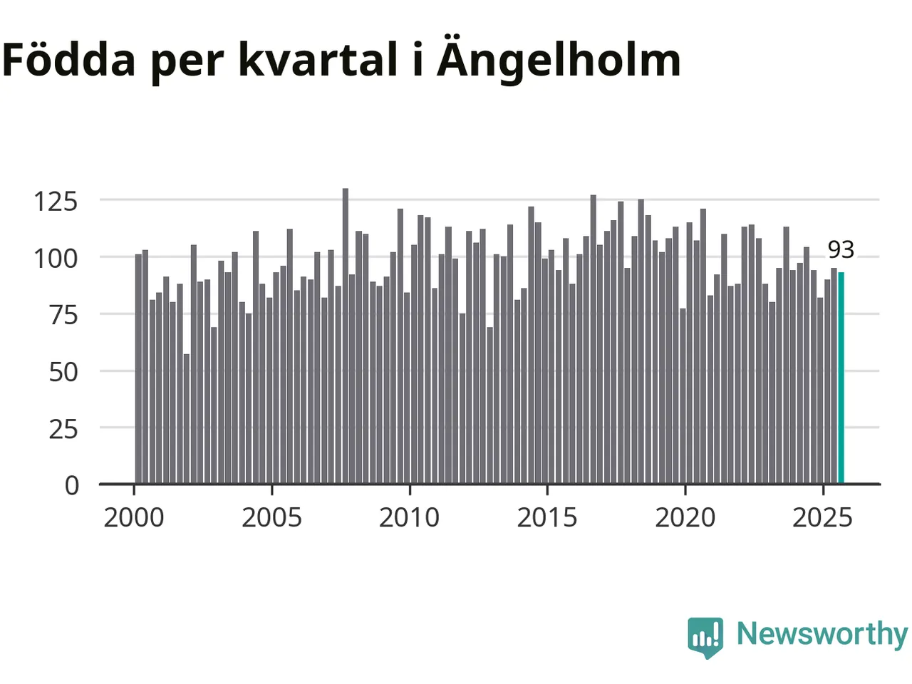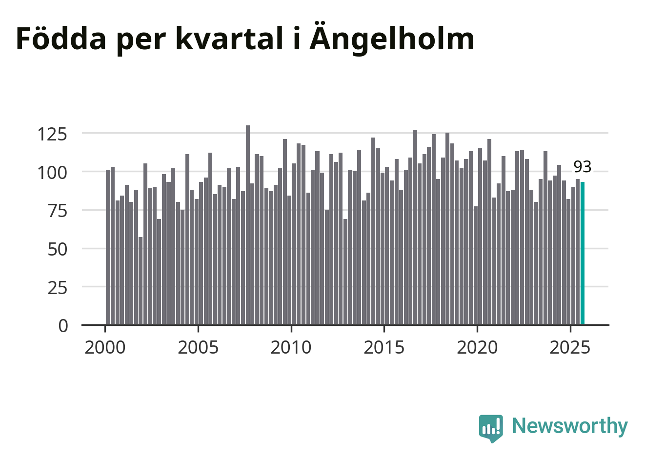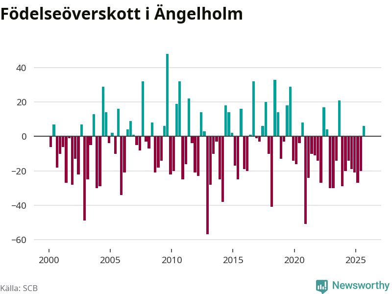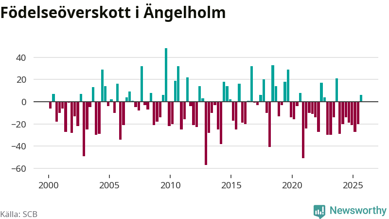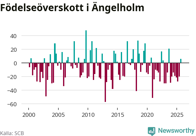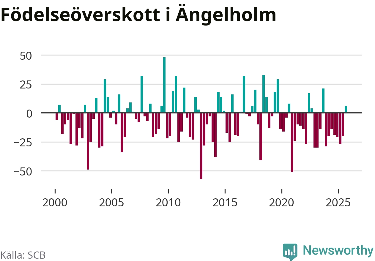 Enligt SCB:s siffror föddes 93 barn i Ängelholm under det senaste kvartalet. Samtidigt avled 87 personer. Skillnaden mellan antal födda och döda är så liten att det inte går att säga om det beror på något annat än SCB:s röjandeskydd. Kommunen har oftast haft negativt födelsenetto tidigare.