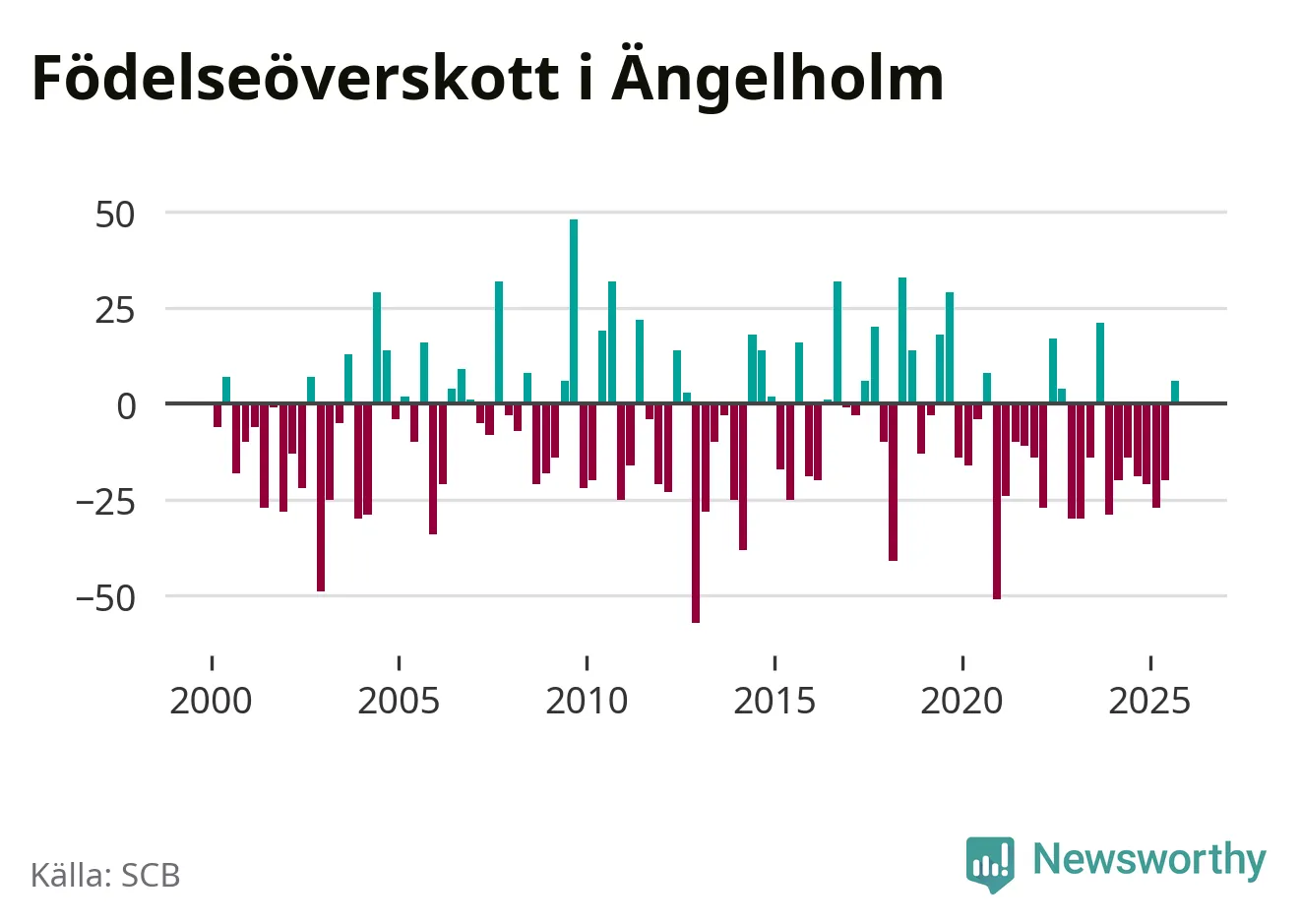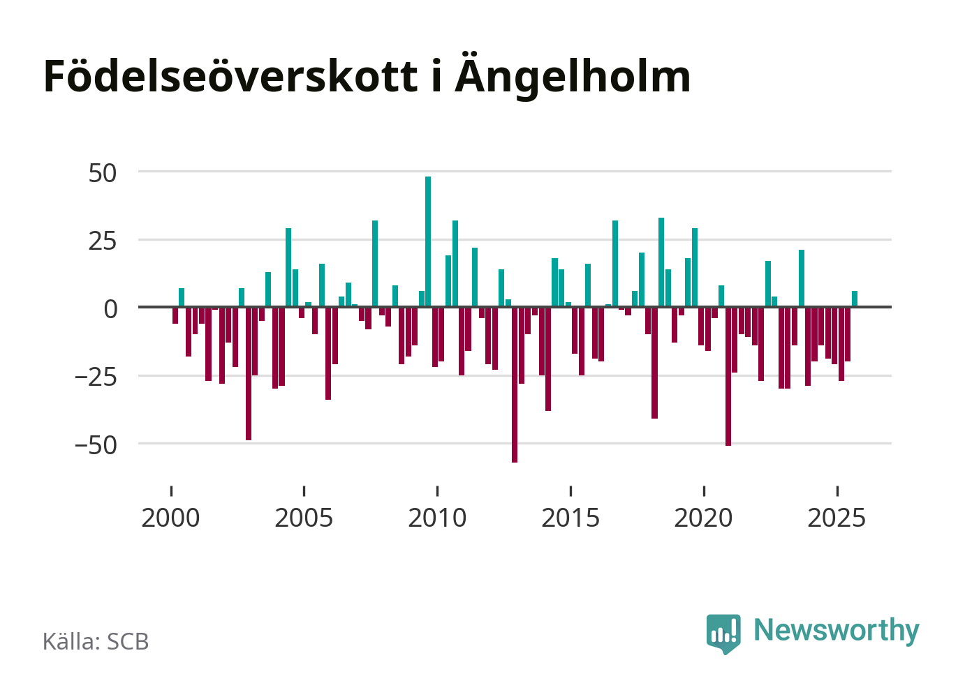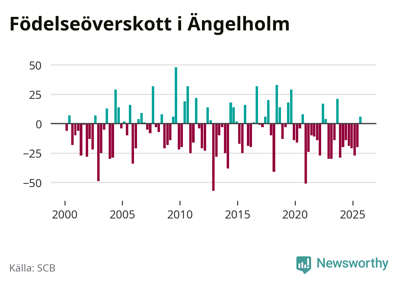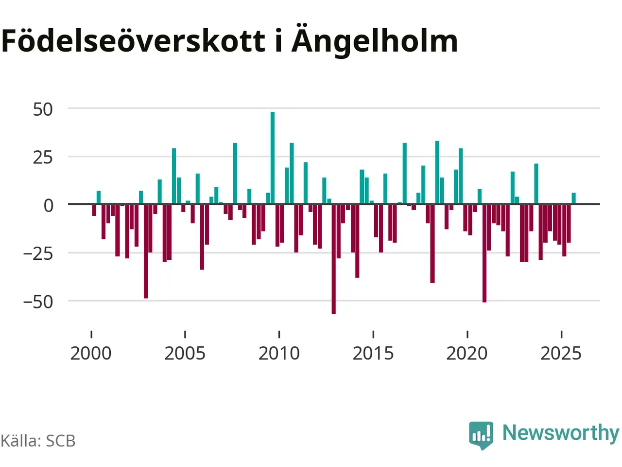 Enligt SCB:s siffror föddes 93 barn i Ängelholm under det senaste kvartalet. Samtidigt avled 87 personer. Skillnaden mellan antal födda och döda är så liten att det inte går att säga om det beror på något annat än SCB:s röjandeskydd. Kommunen har oftast haft negativt födelsenetto tidigare.