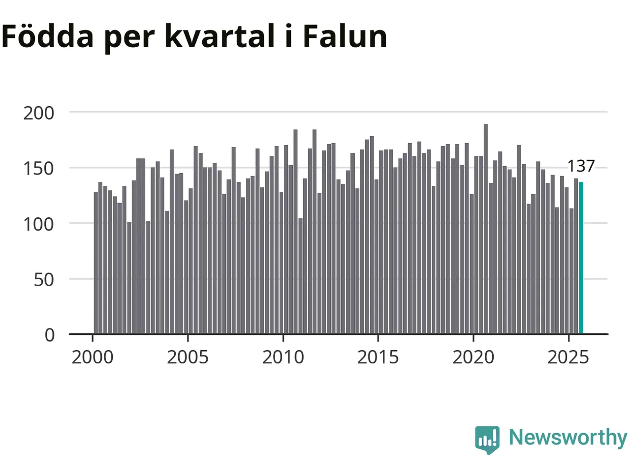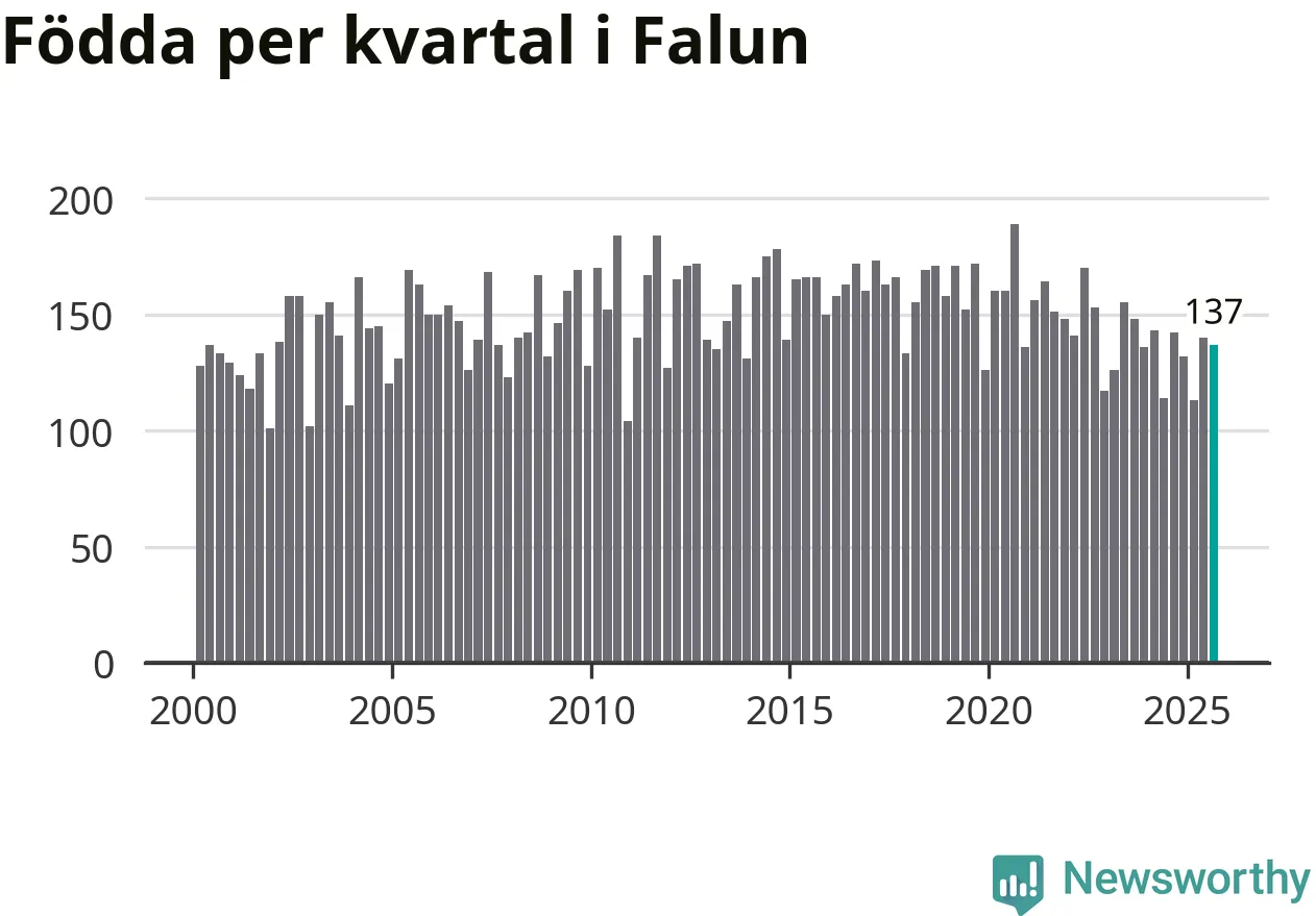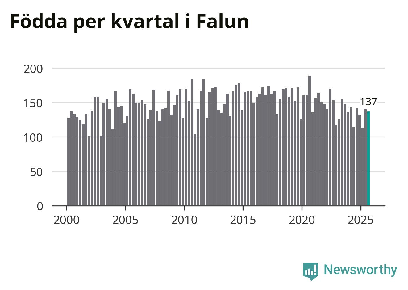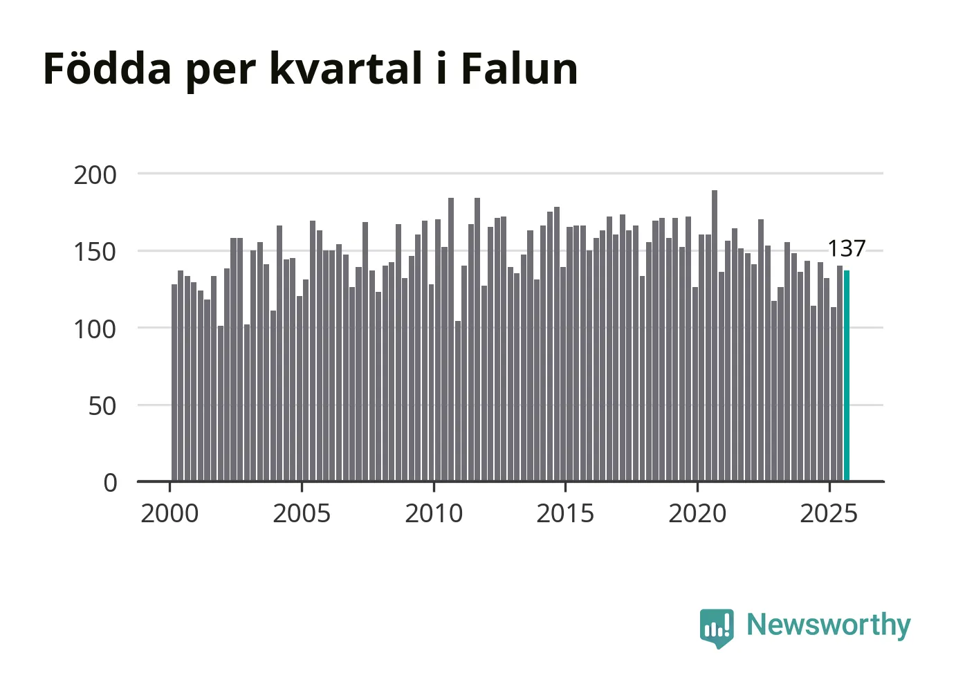 Enligt SCB:s siffror föddes 137 barn i Falun under det senaste kvartalet. Samtidigt avled relativt få – 115 personer. Falun hade alltså ett positivt födelsenetto, vilket kommunen historiskt sett oftast har haft.
