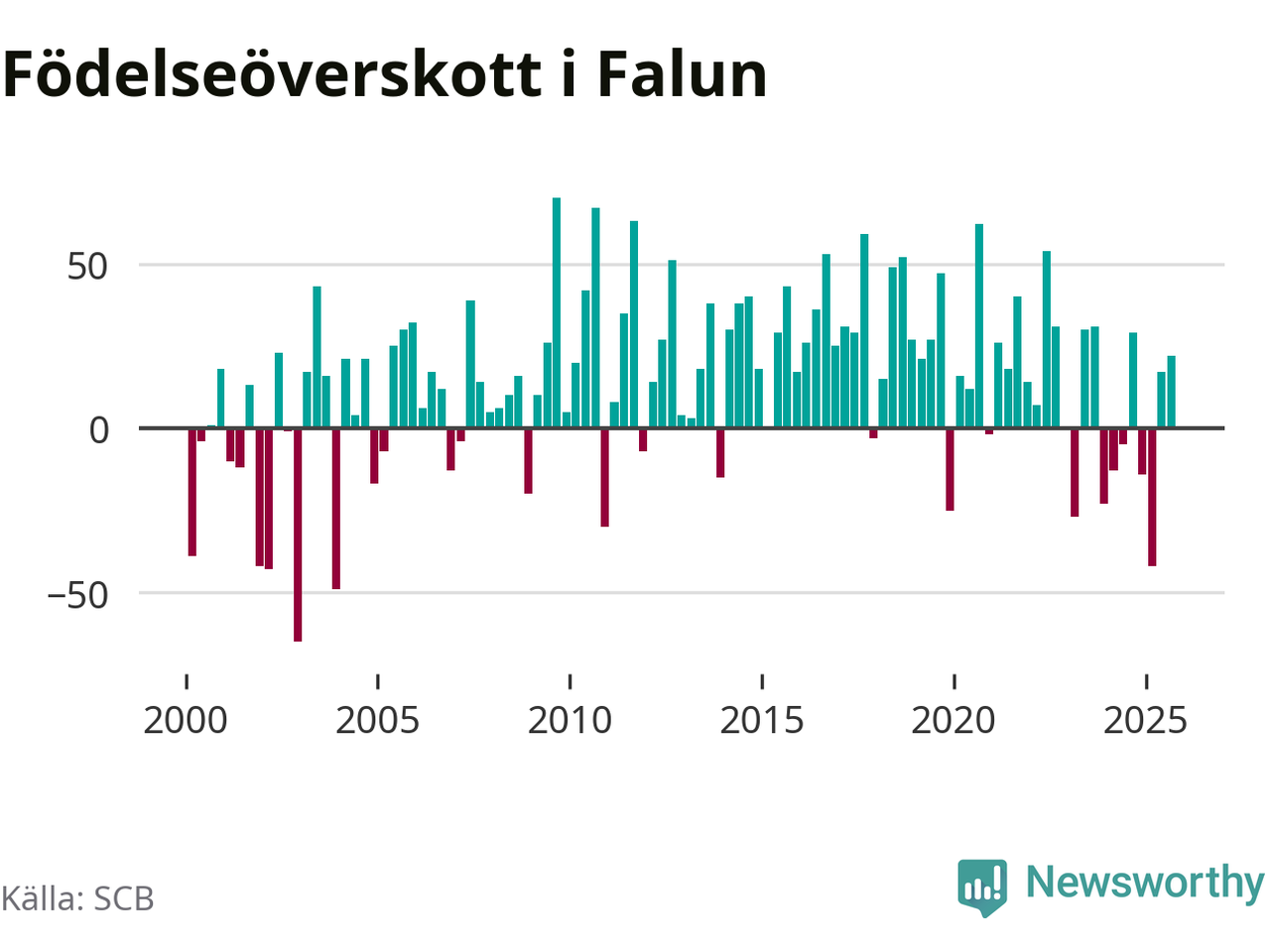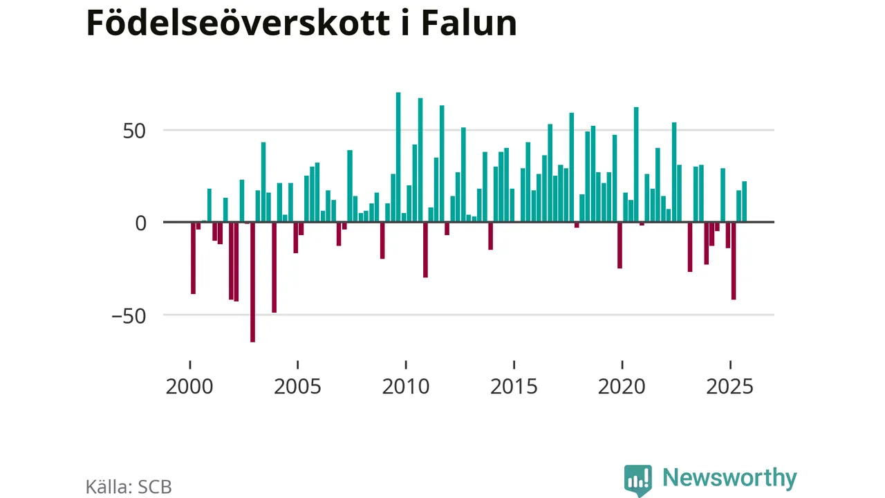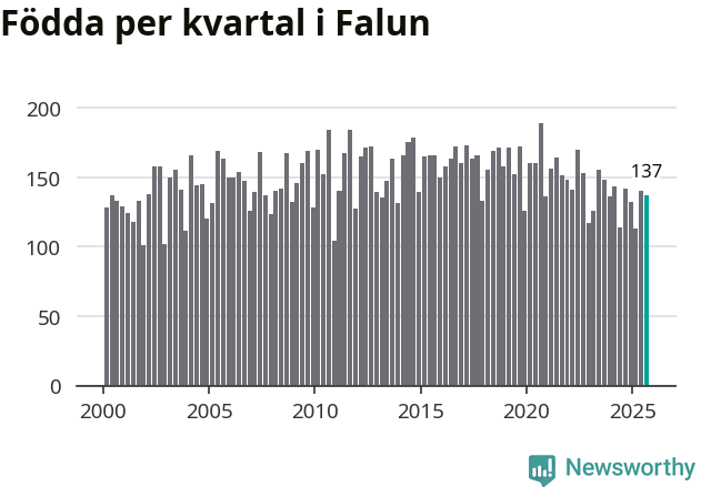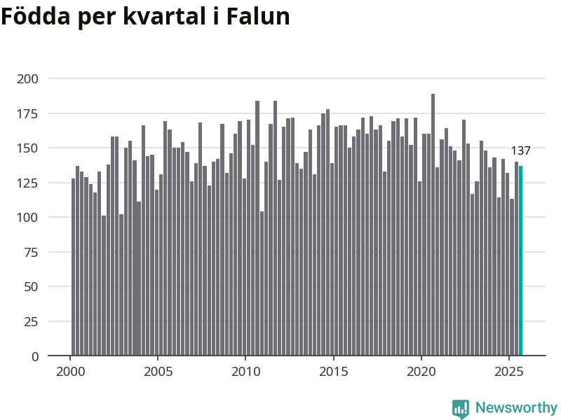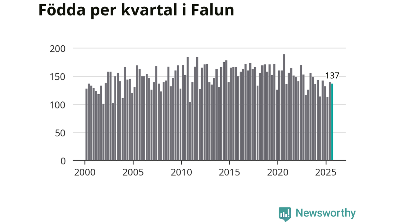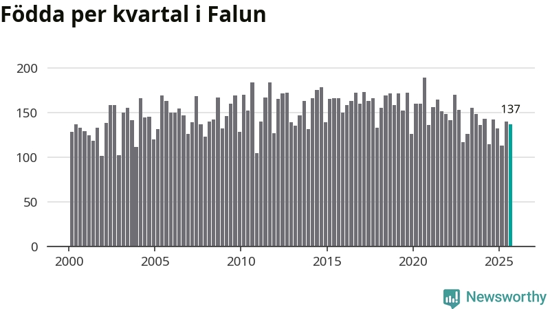 Enligt SCB:s siffror föddes 137 barn i Falun under det senaste kvartalet. Samtidigt avled relativt få – 115 personer. Falun hade alltså ett positivt födelsenetto, vilket kommunen historiskt sett oftast har haft.
