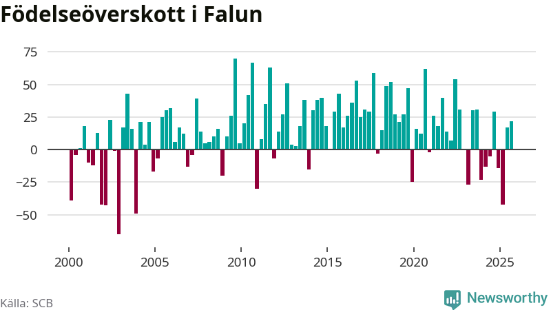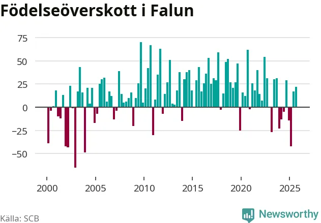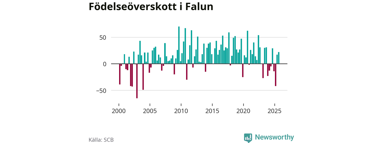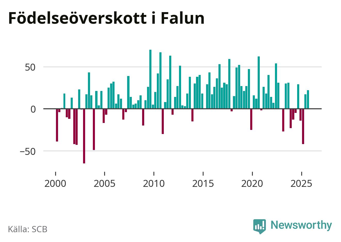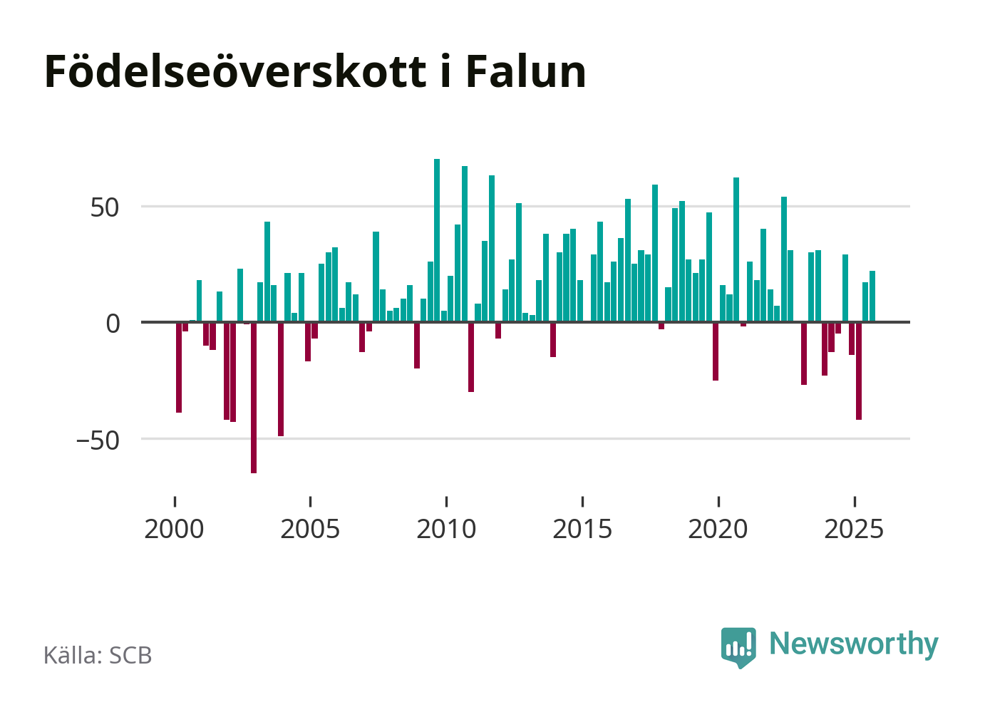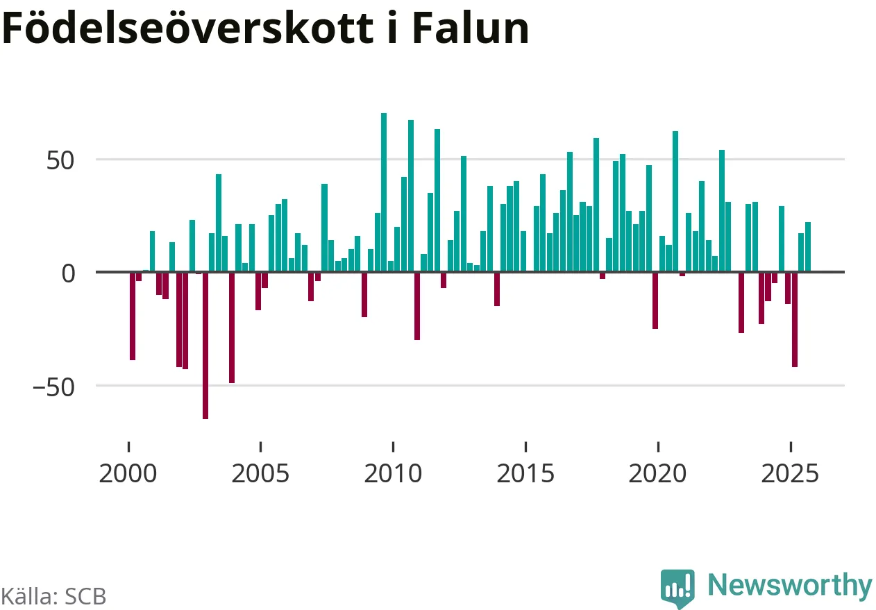 Enligt SCB:s siffror föddes 137 barn i Falun under det senaste kvartalet. Samtidigt avled relativt få – 115 personer. Falun hade alltså ett positivt födelsenetto, vilket kommunen historiskt sett oftast har haft.