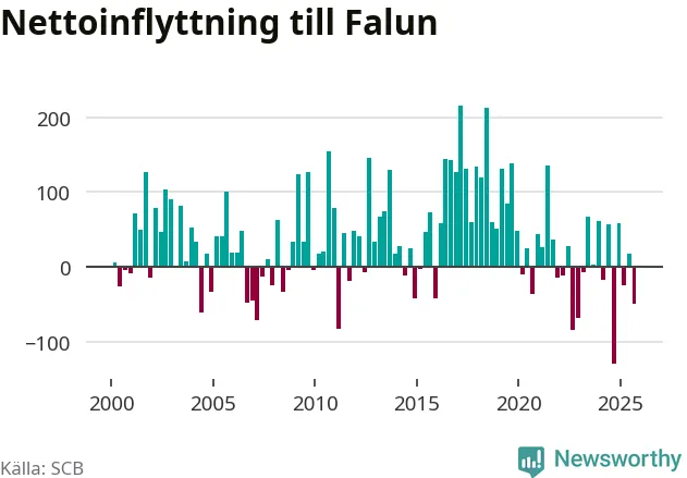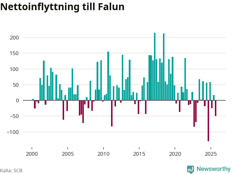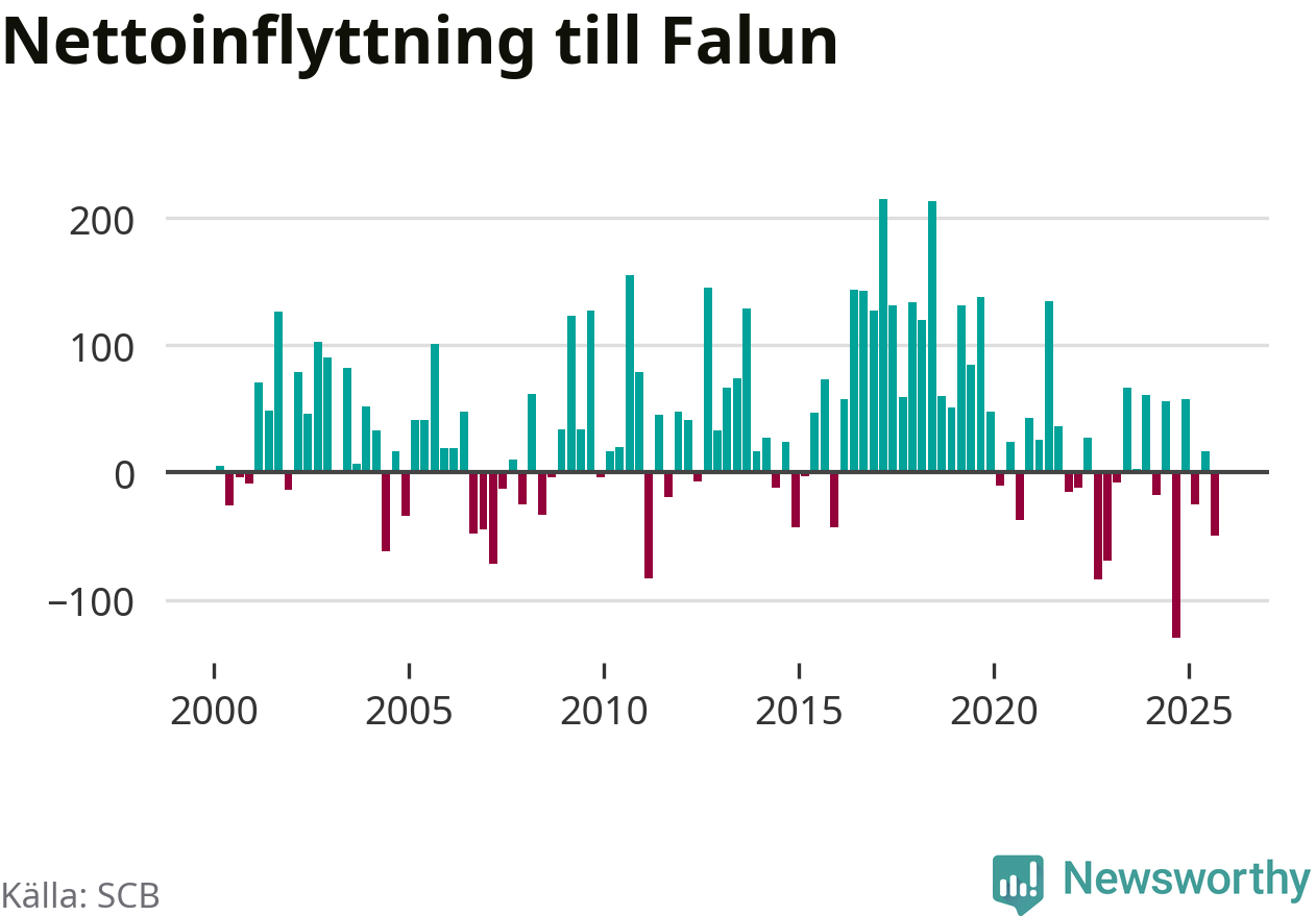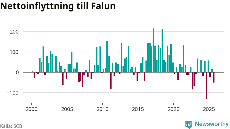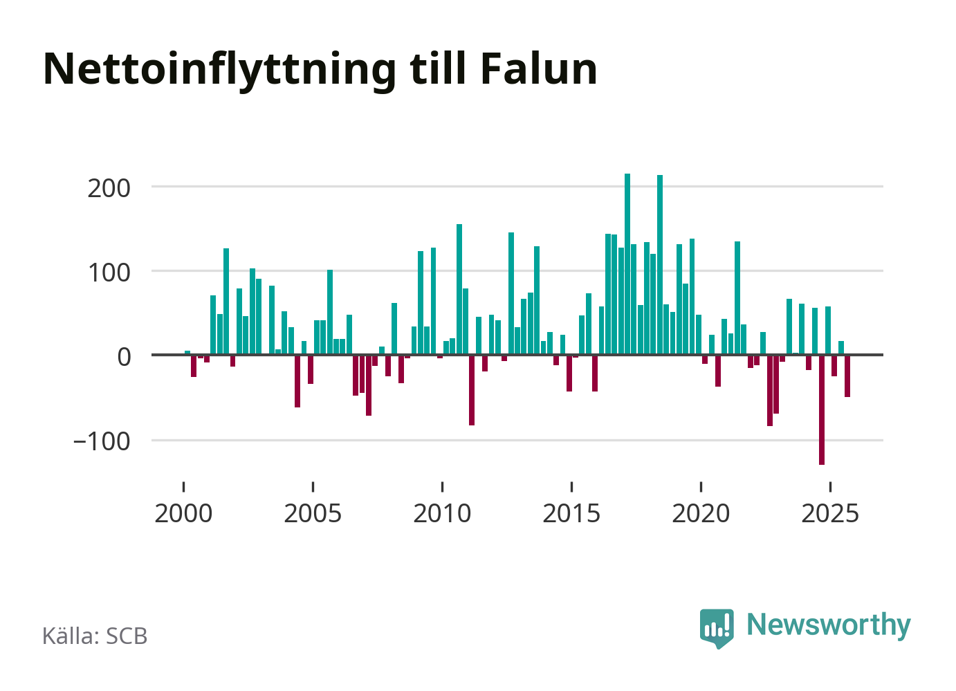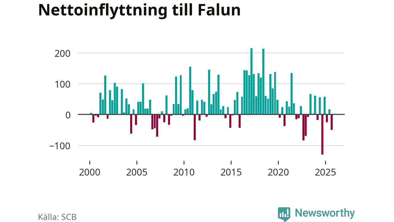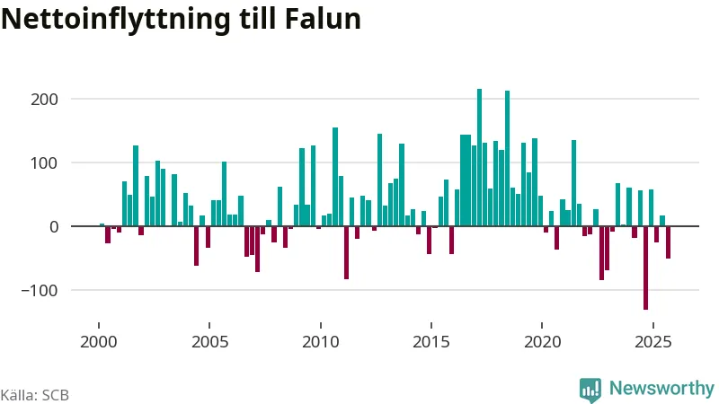 Under tredje kvartalet 2025 flyttade 822 personer till kommunen medan 872 personer flyttade därifrån. Sedan seklets början har Falun oftast haft ett positivt flyttnetto.