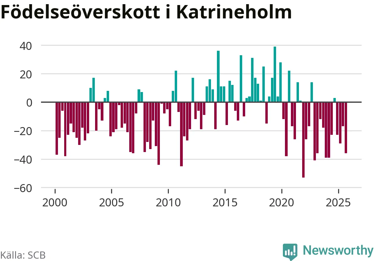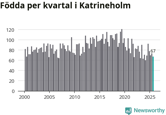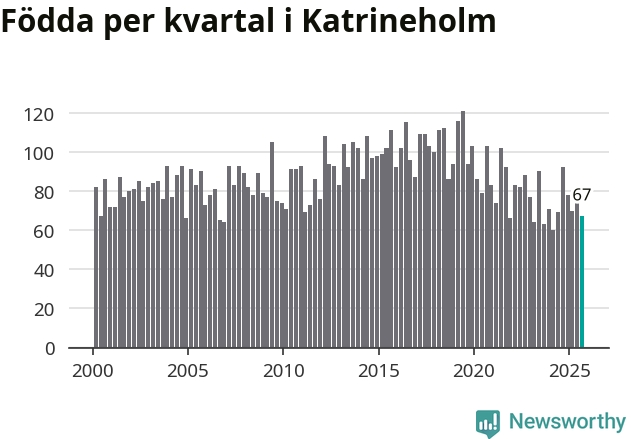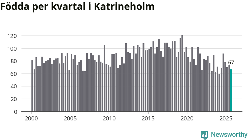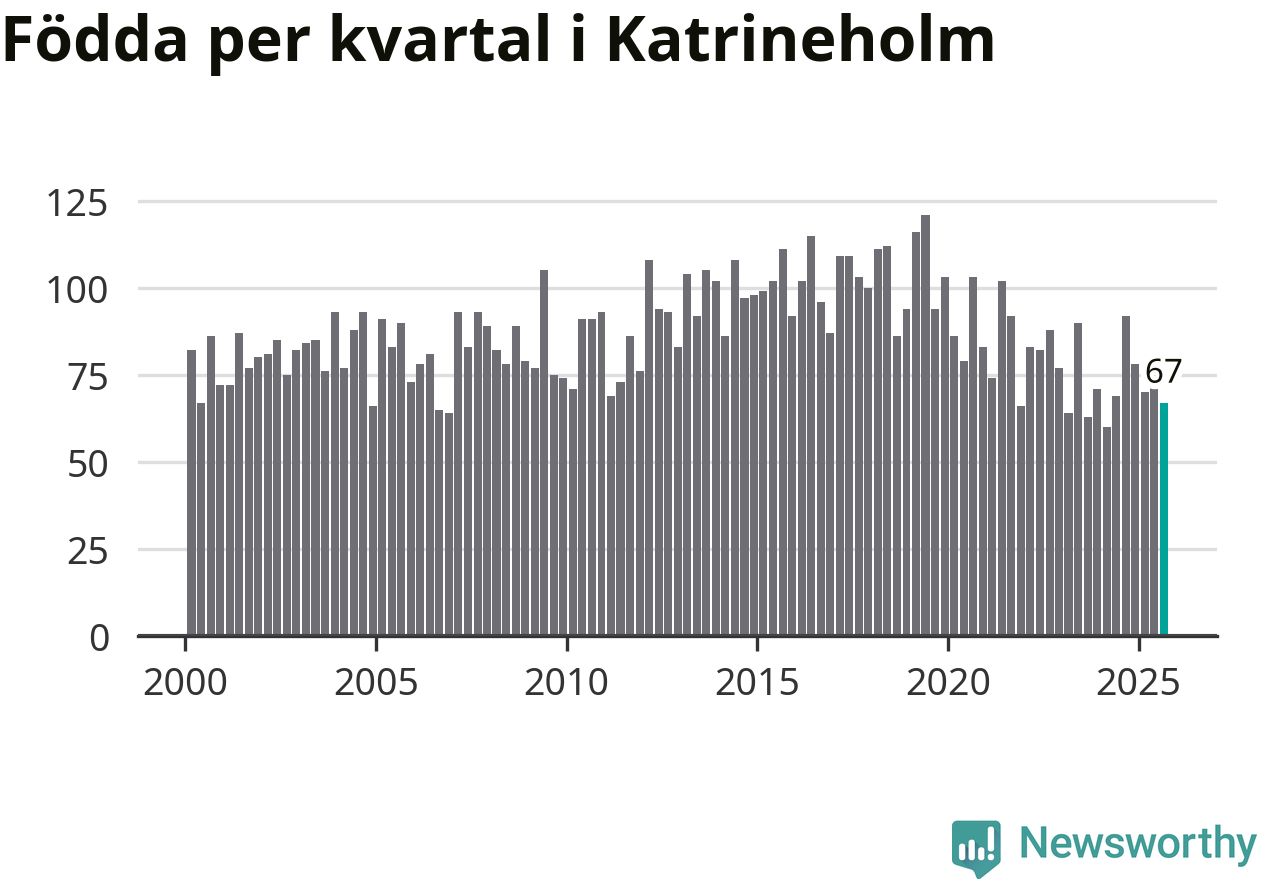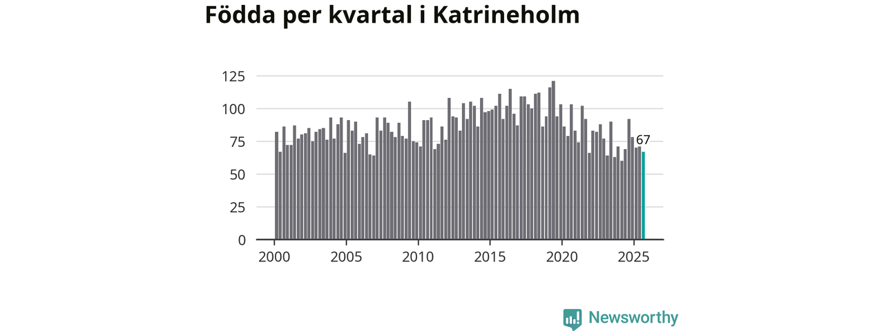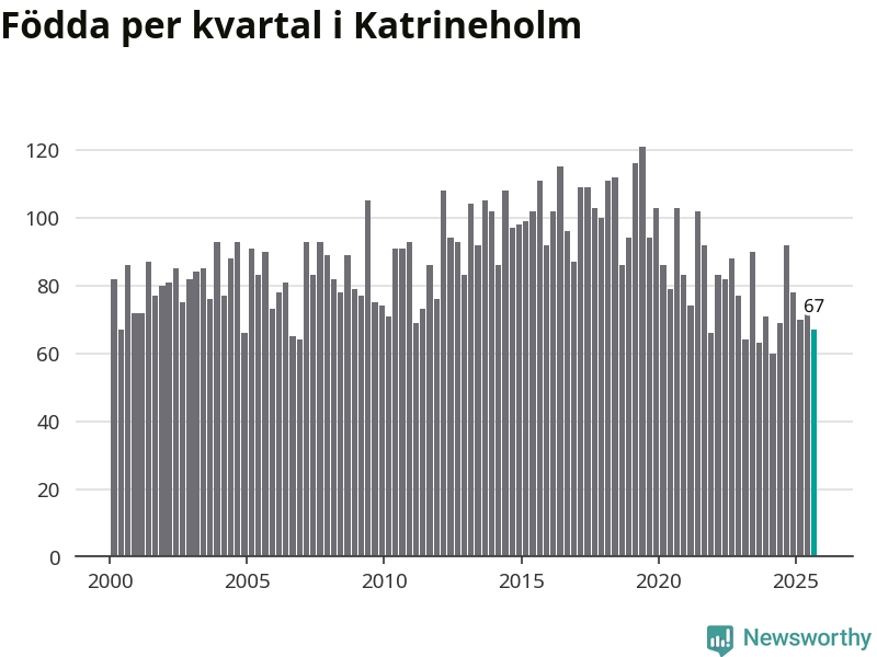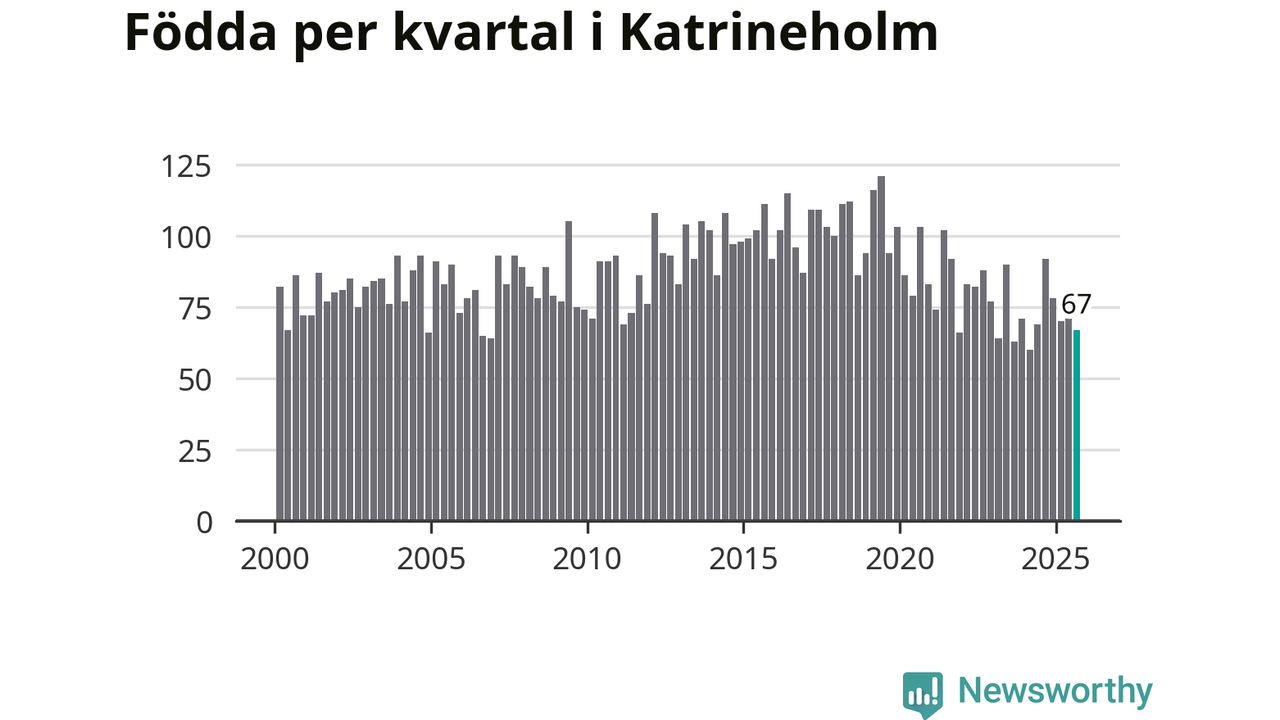 Enligt SCB:s siffror föddes 67 barn i Katrineholm under det senaste kvartalet. Samtidigt avled 103 personer. Katrineholm hade alltså ett negativt födelsenetto. Historiskt sett har kommunen haft ungefär lika många kvartal med positivt flyttnetto som negativt.