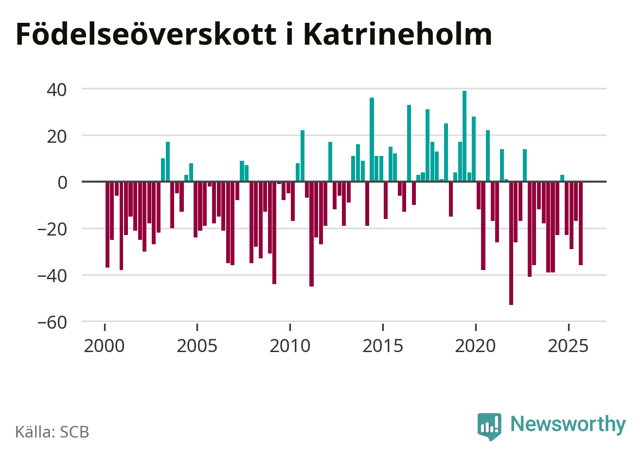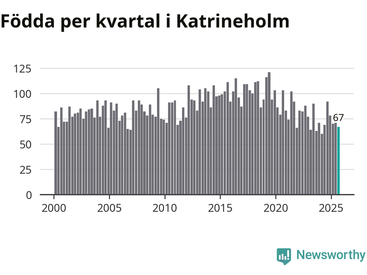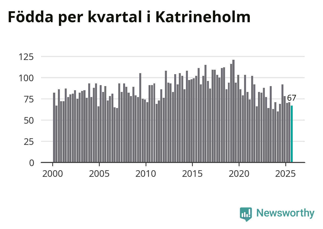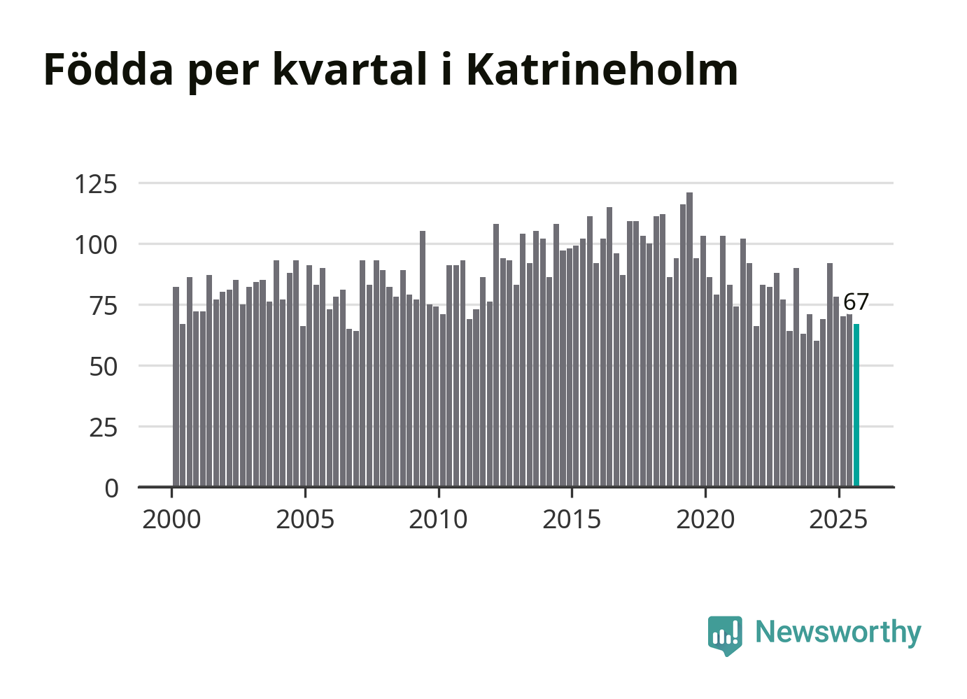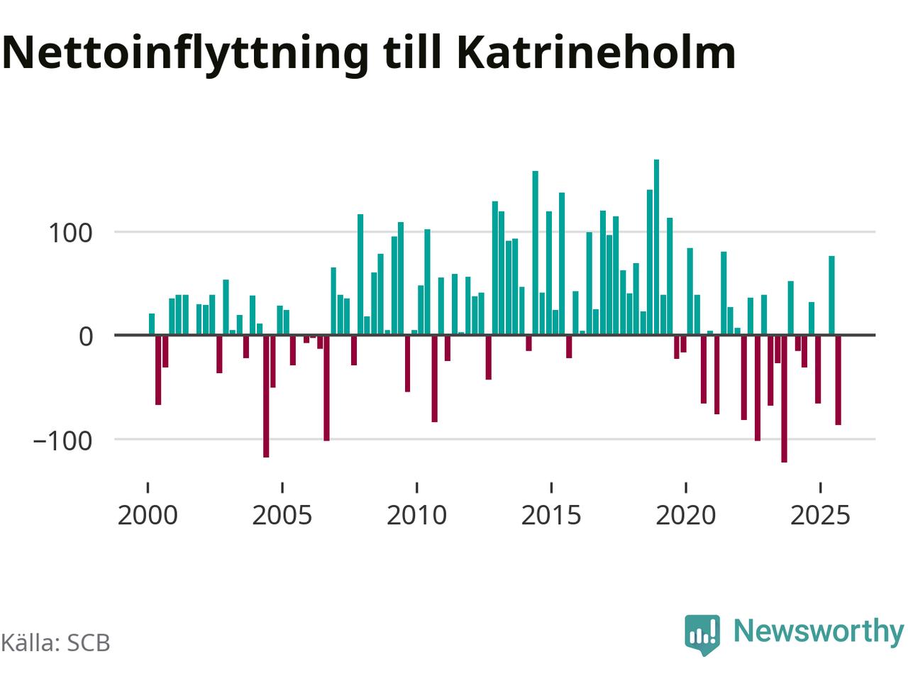 Enligt SCB:s siffror föddes 67 barn i Katrineholm under det senaste kvartalet. Samtidigt avled 103 personer. Katrineholm hade alltså ett negativt födelsenetto. Historiskt sett har kommunen haft ungefär lika många kvartal med positivt flyttnetto som negativt.