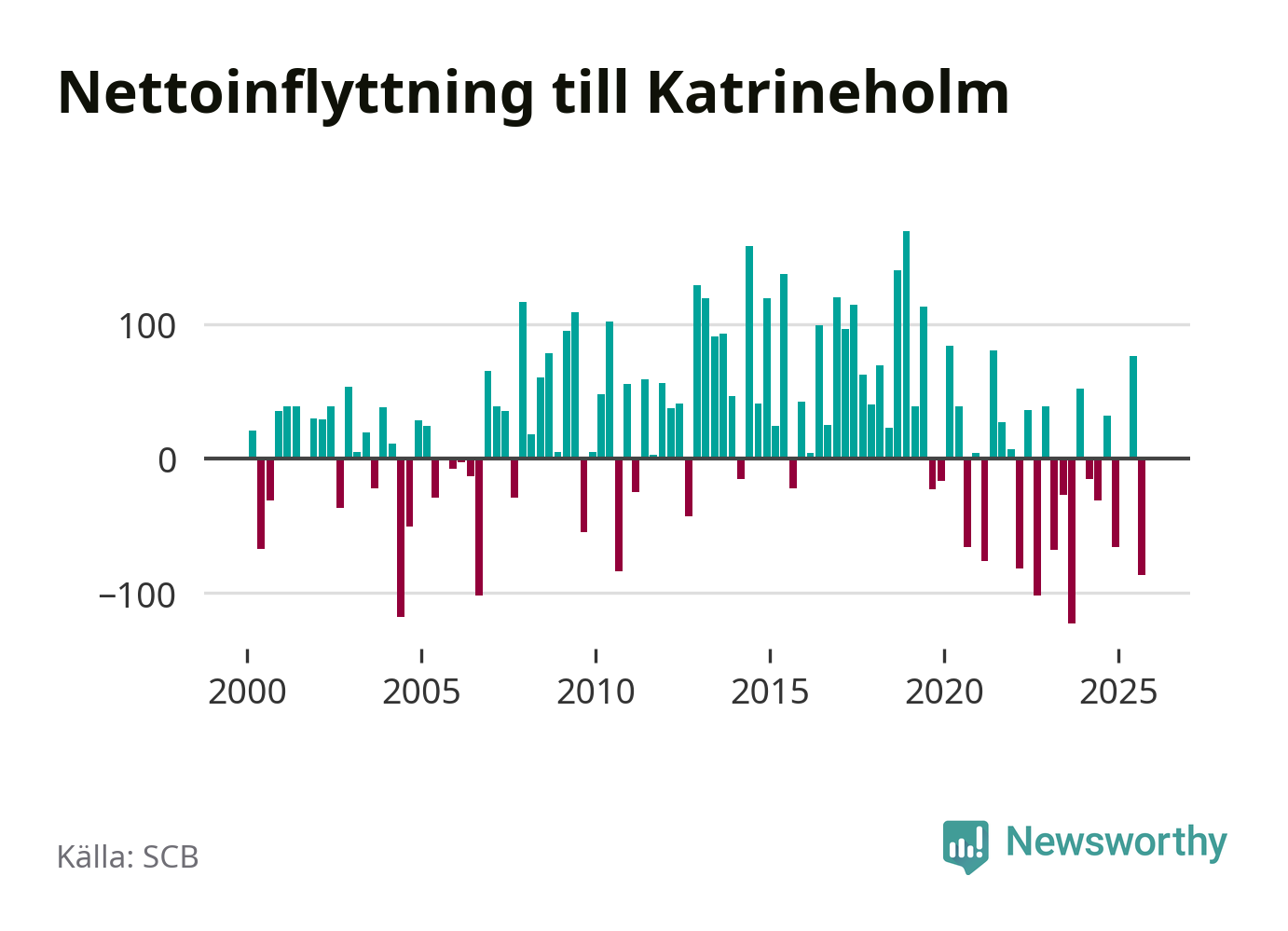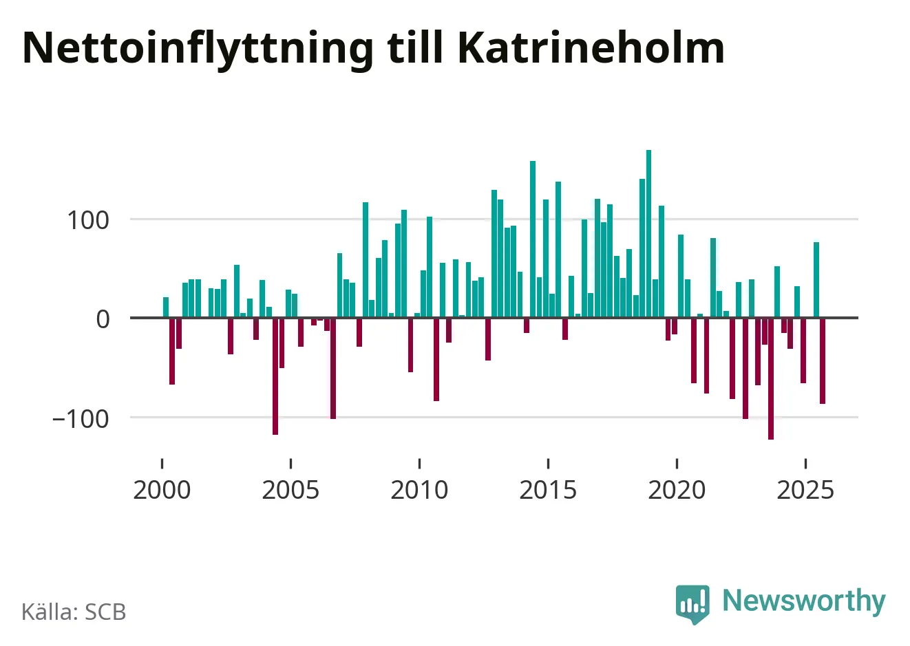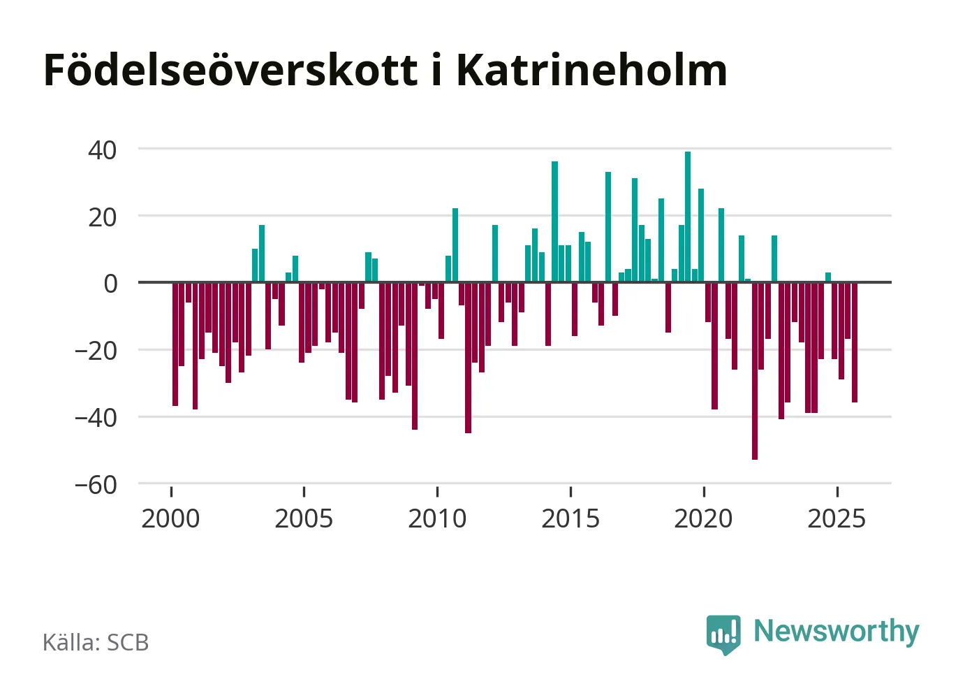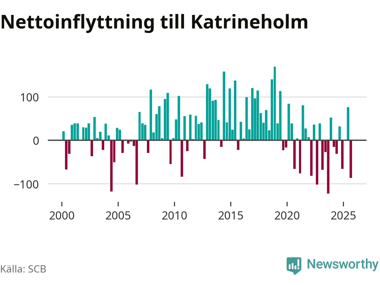 Enligt SCB:s siffror föddes 67 barn i Katrineholm under det senaste kvartalet. Samtidigt avled 103 personer. Katrineholm hade alltså ett negativt födelsenetto. Historiskt sett har kommunen haft ungefär lika många kvartal med positivt flyttnetto som negativt.