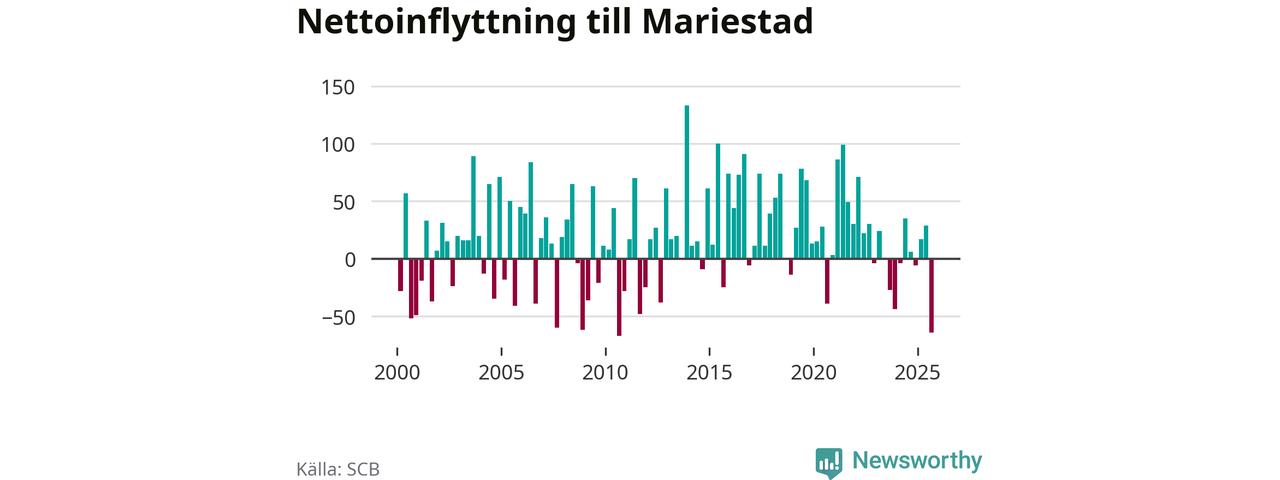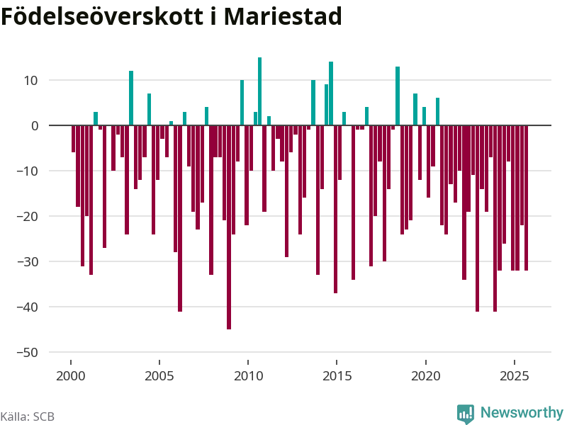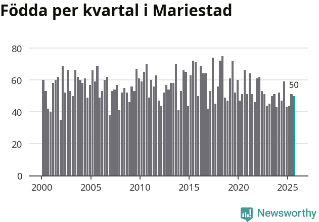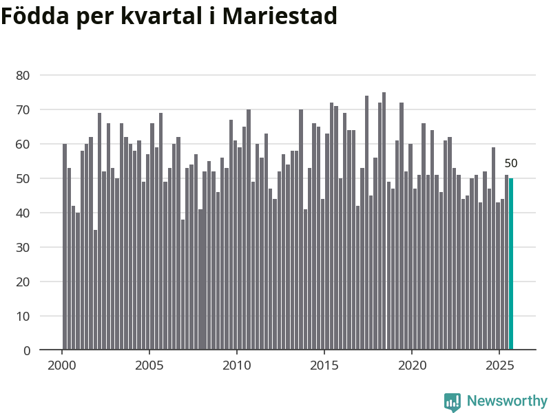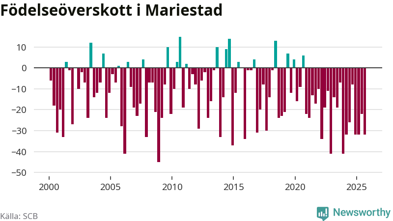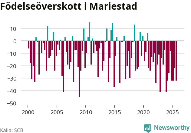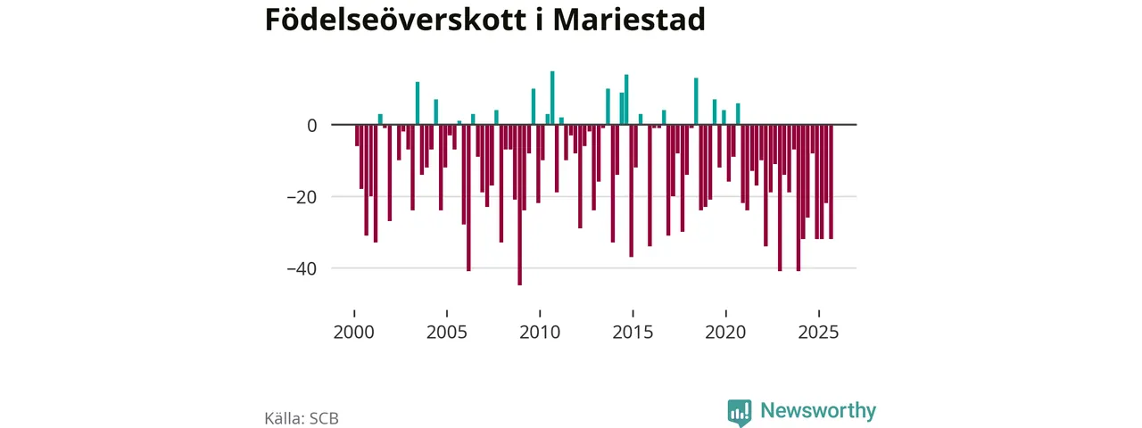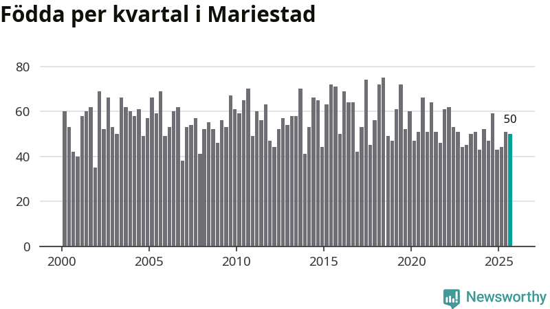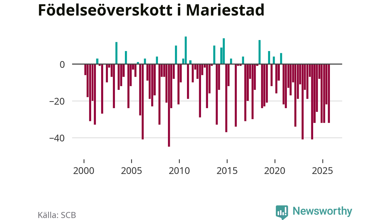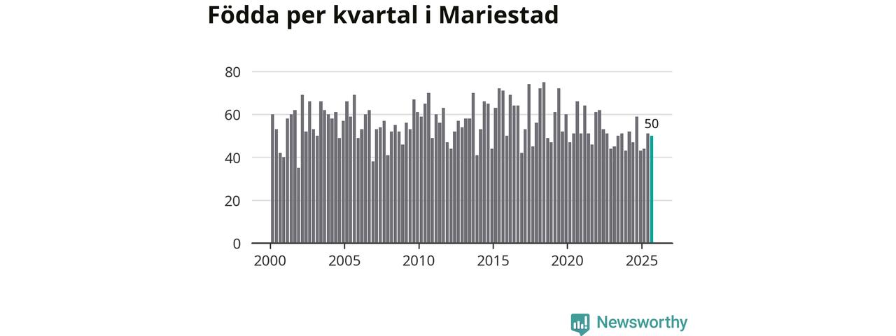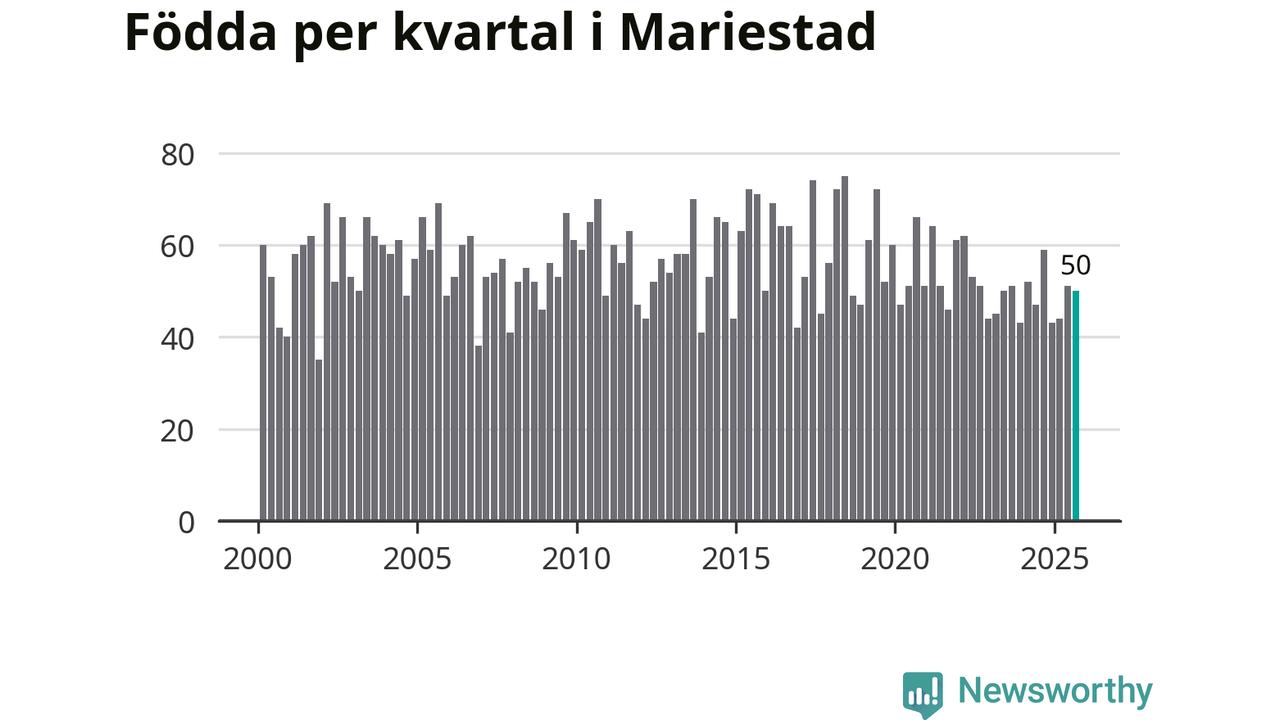 Enligt SCB:s siffror föddes 50 barn i Mariestad under det senaste kvartalet. Samtidigt avled 82 personer. Mariestad hade alltså ett negativt födelsenetto, vilket kommunen historiskt sett nästan alltid har haft.