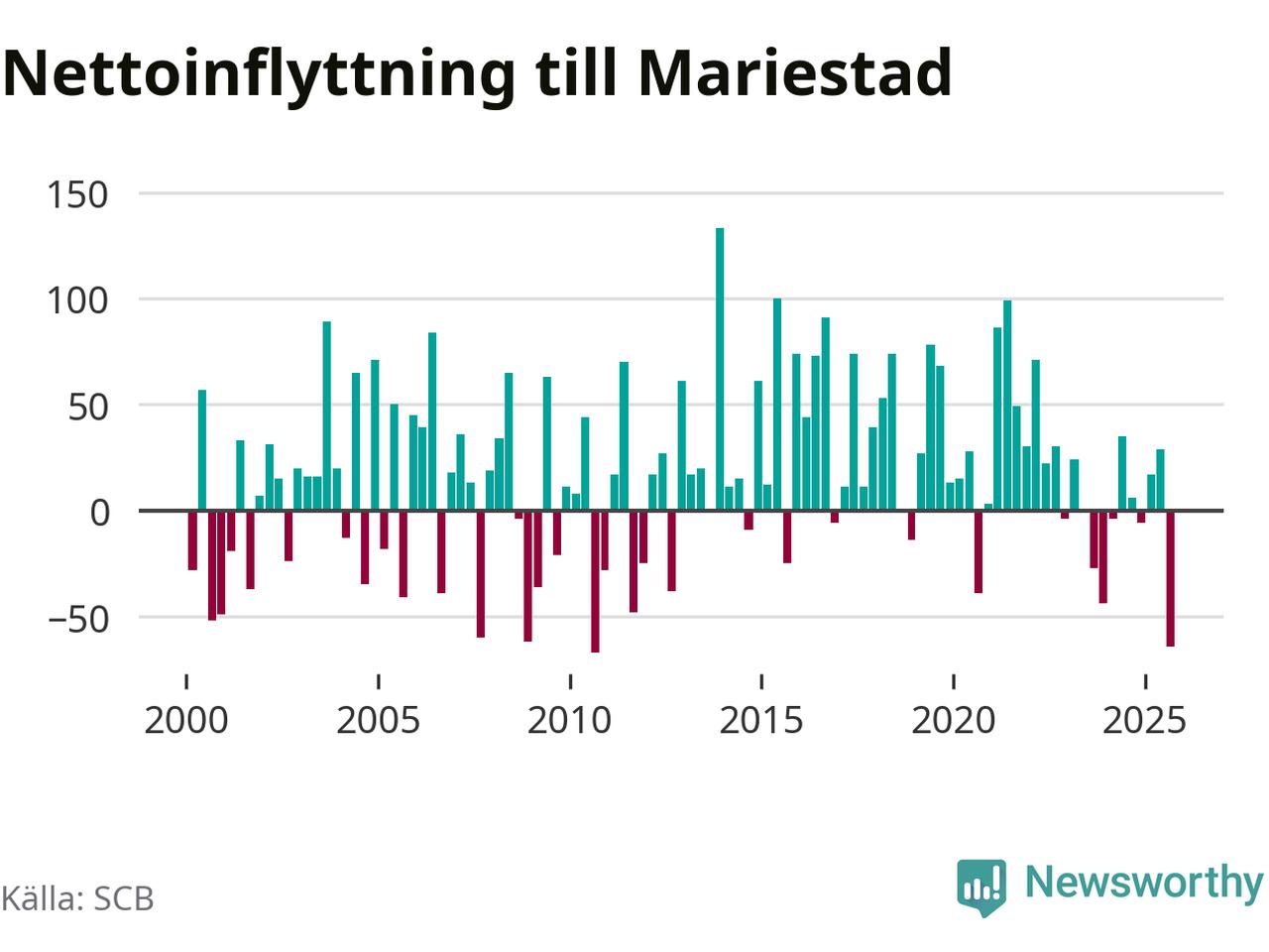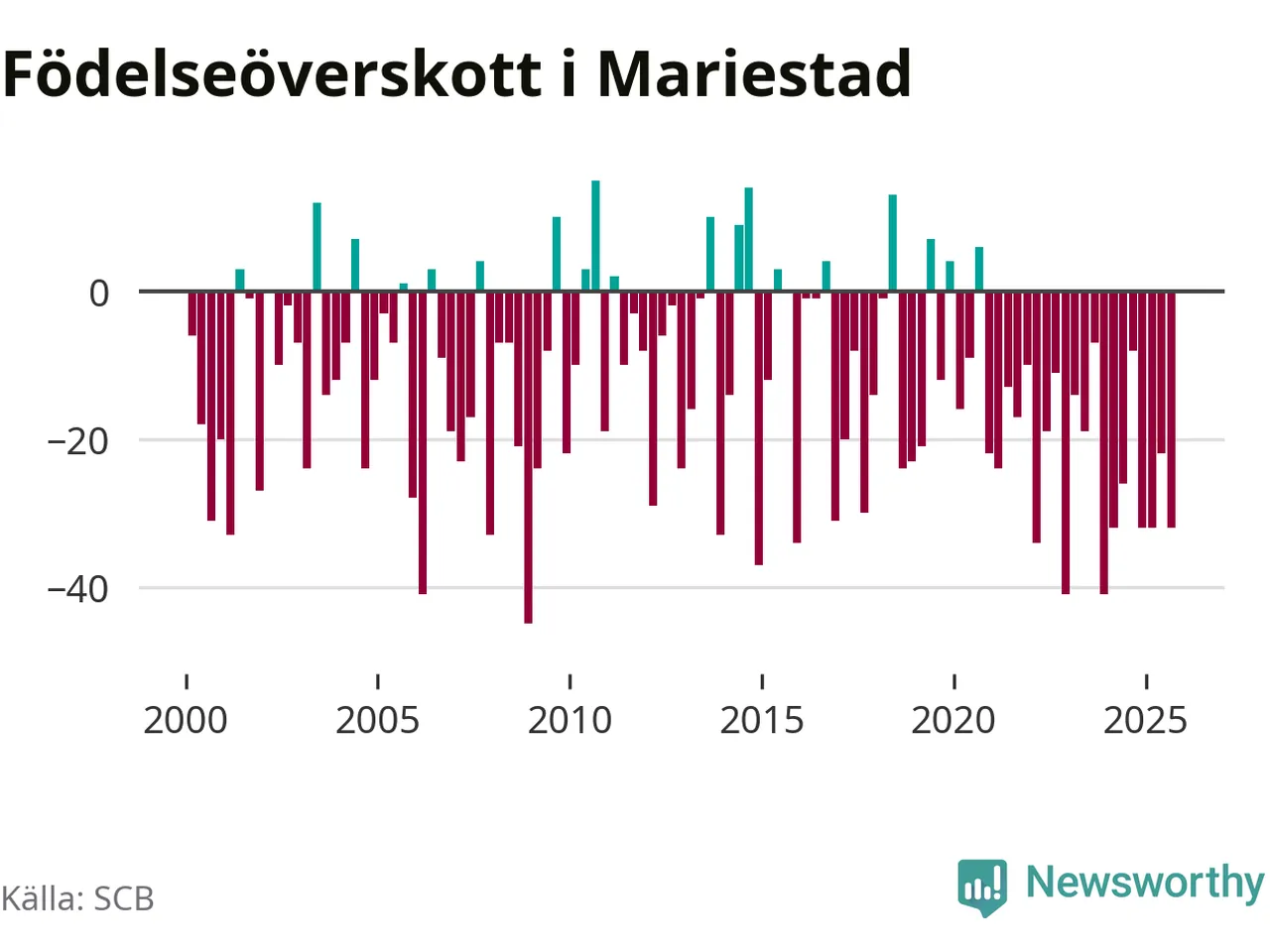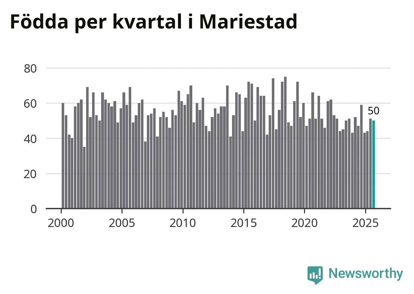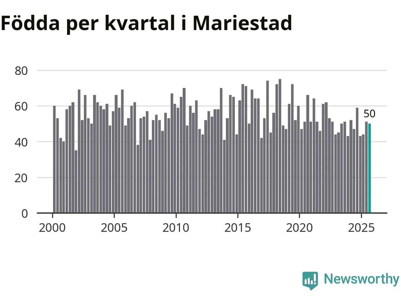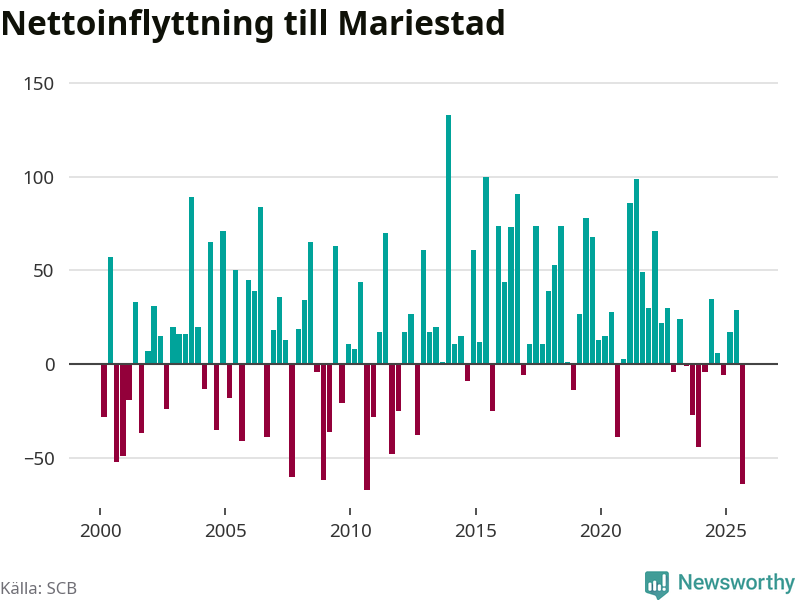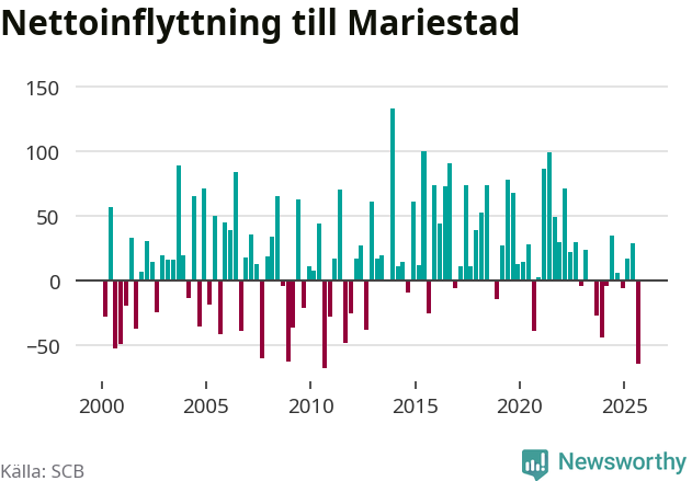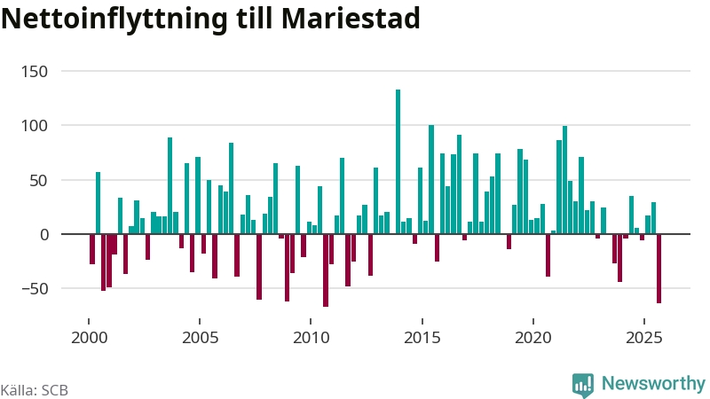 Enligt SCB:s siffror föddes 50 barn i Mariestad under det senaste kvartalet. Samtidigt avled 82 personer. Mariestad hade alltså ett negativt födelsenetto, vilket kommunen historiskt sett nästan alltid har haft.