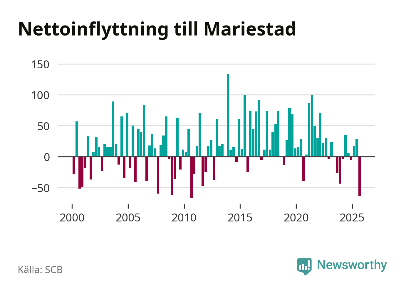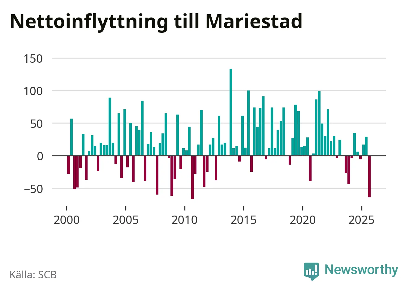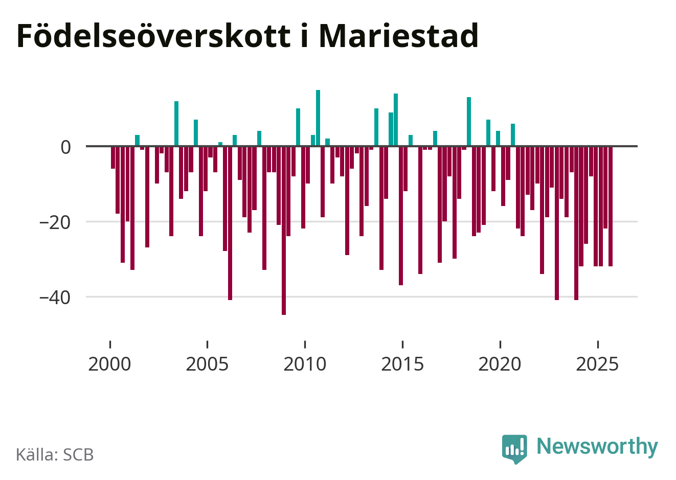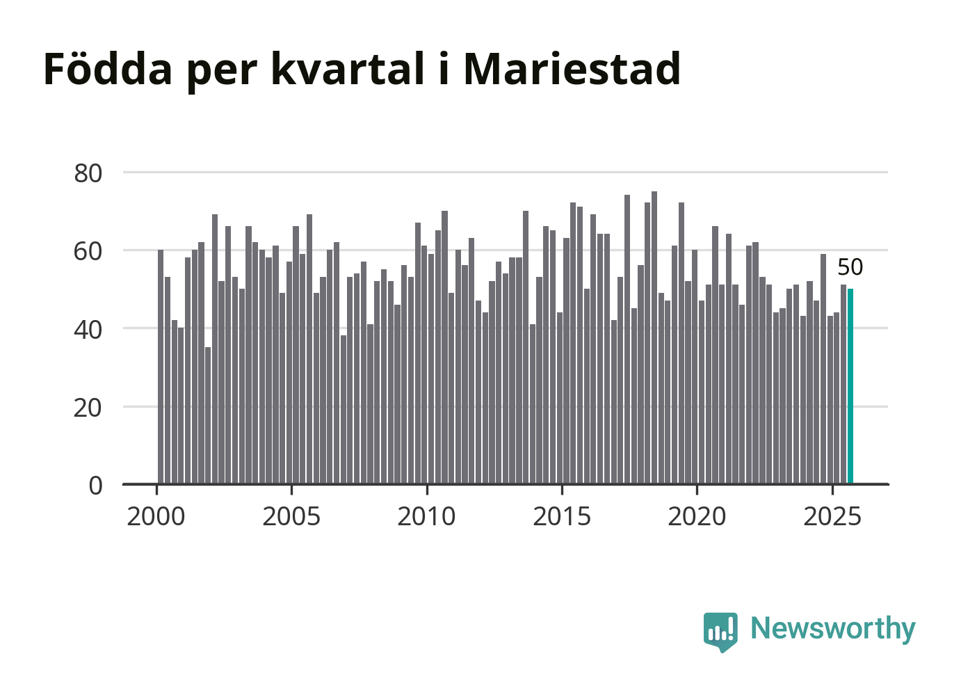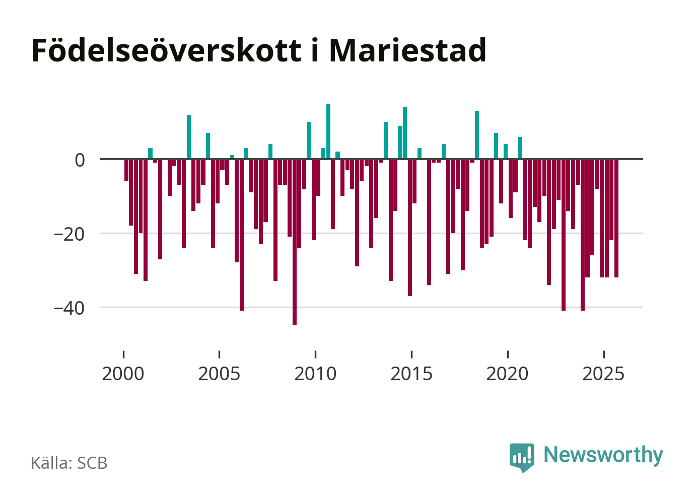 Enligt SCB:s siffror föddes 50 barn i Mariestad under det senaste kvartalet. Samtidigt avled 82 personer. Mariestad hade alltså ett negativt födelsenetto, vilket kommunen historiskt sett nästan alltid har haft.