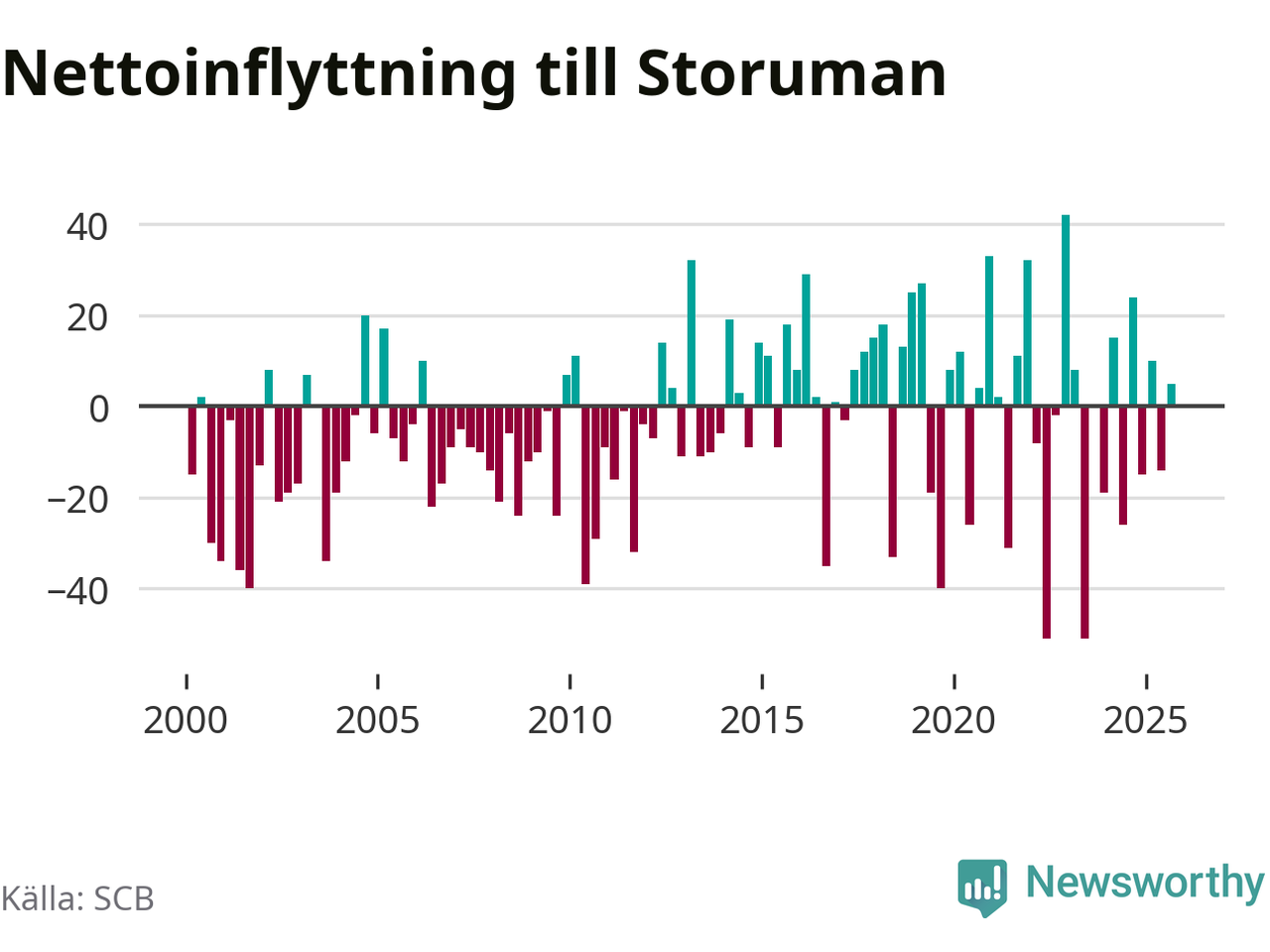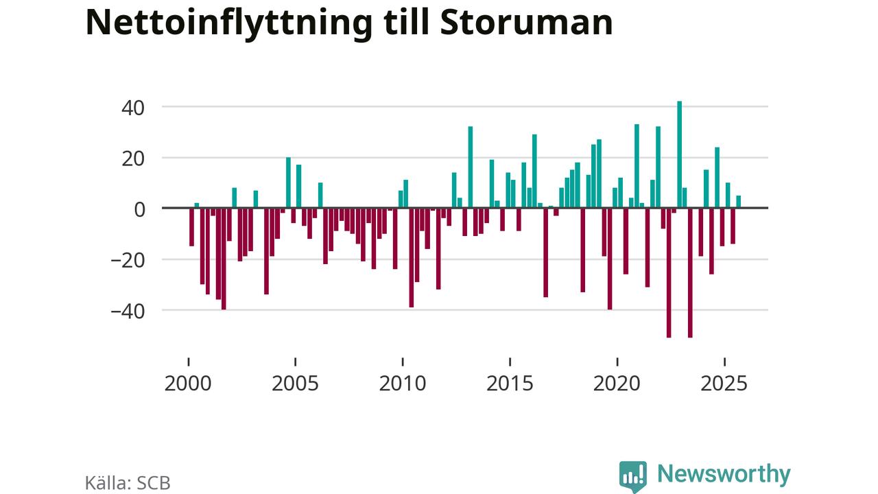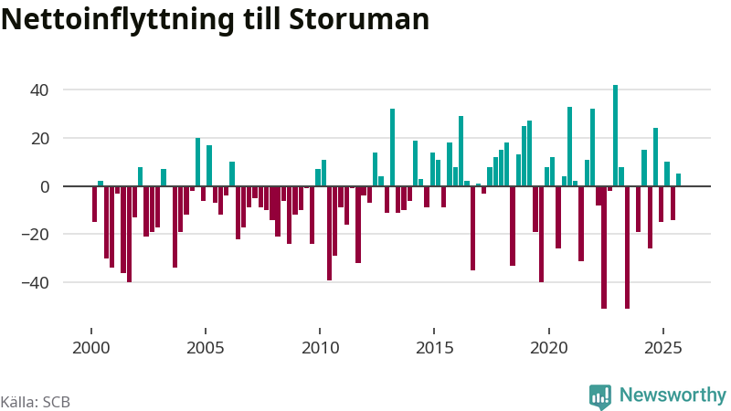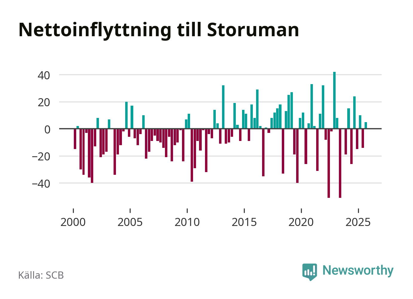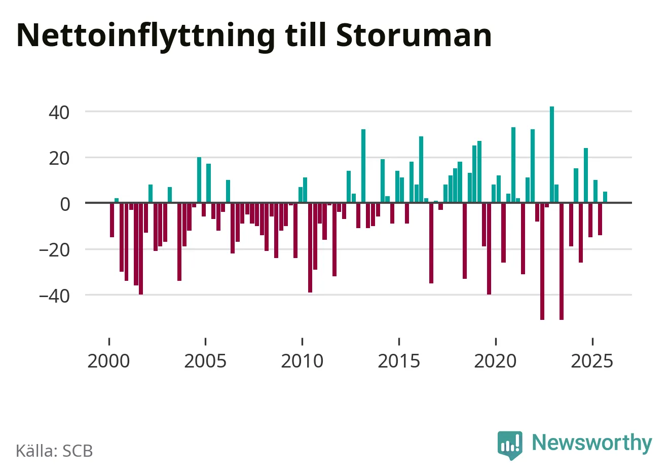 Under tredje kvartalet 2025 flyttade 75 personer till kommunen medan 70 personer flyttade därifrån. Skillnaden mellan antalet in- och utflyttade är så liten att den lika gärna kan bero på SCB:s slumpmässiga brus. Sedan seklets början har Storuman oftast haft ett positivt flyttnetto.
