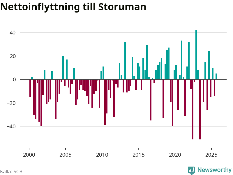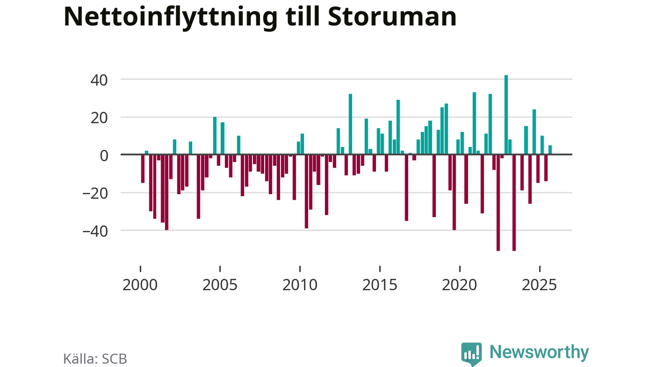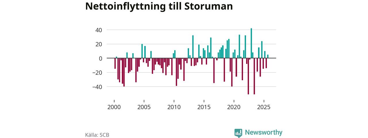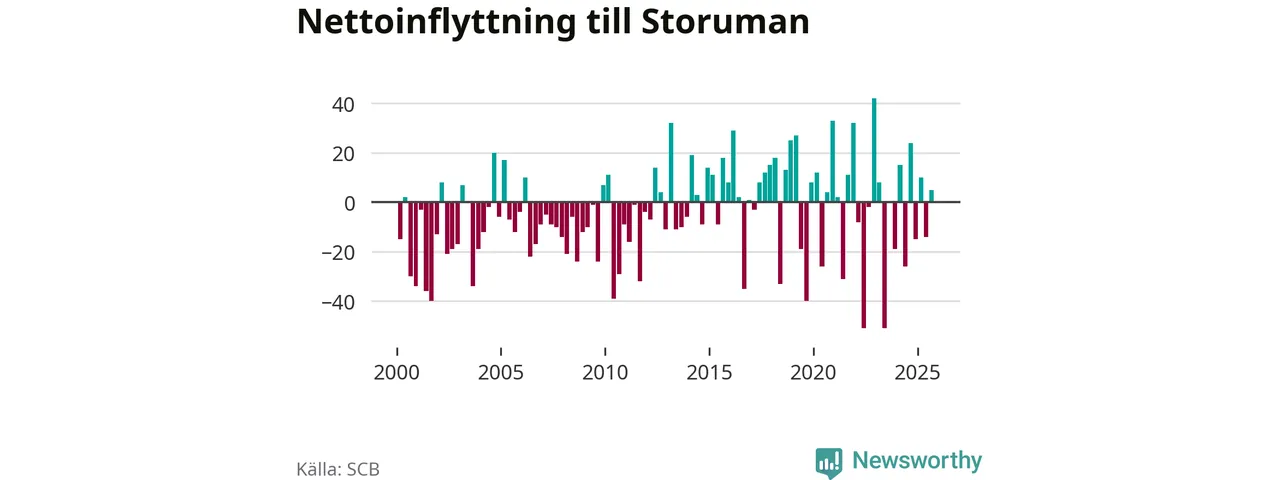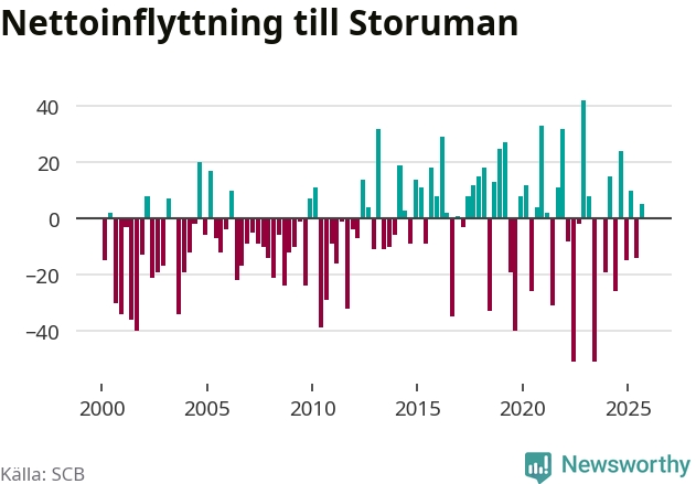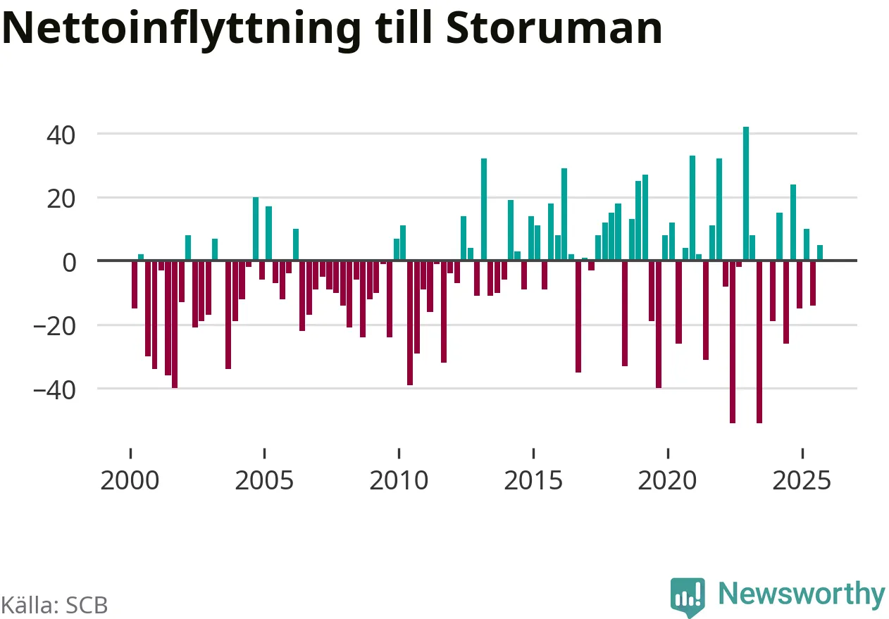 Under tredje kvartalet 2025 flyttade 75 personer till kommunen medan 70 personer flyttade därifrån. Skillnaden mellan antalet in- och utflyttade är så liten att den lika gärna kan bero på SCB:s slumpmässiga brus. Sedan seklets början har Storuman oftast haft ett positivt flyttnetto.