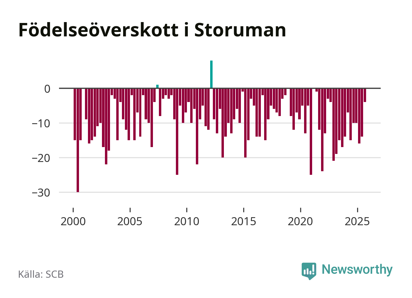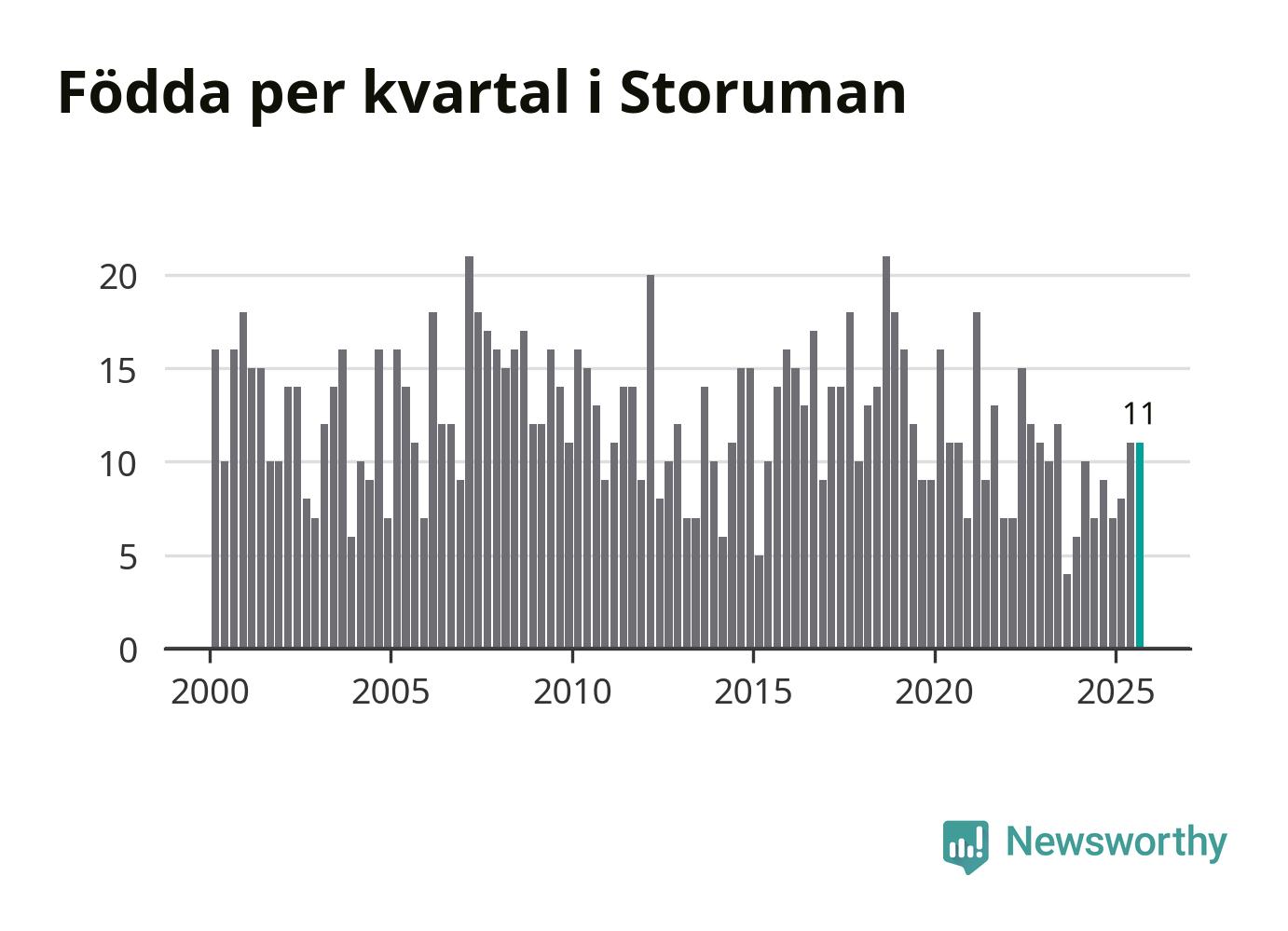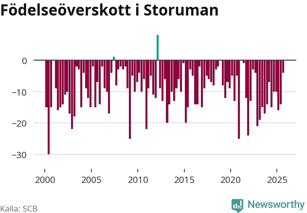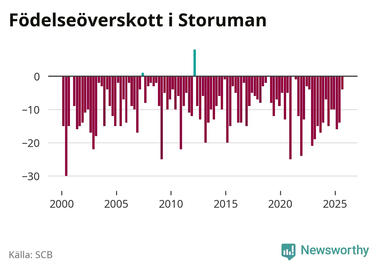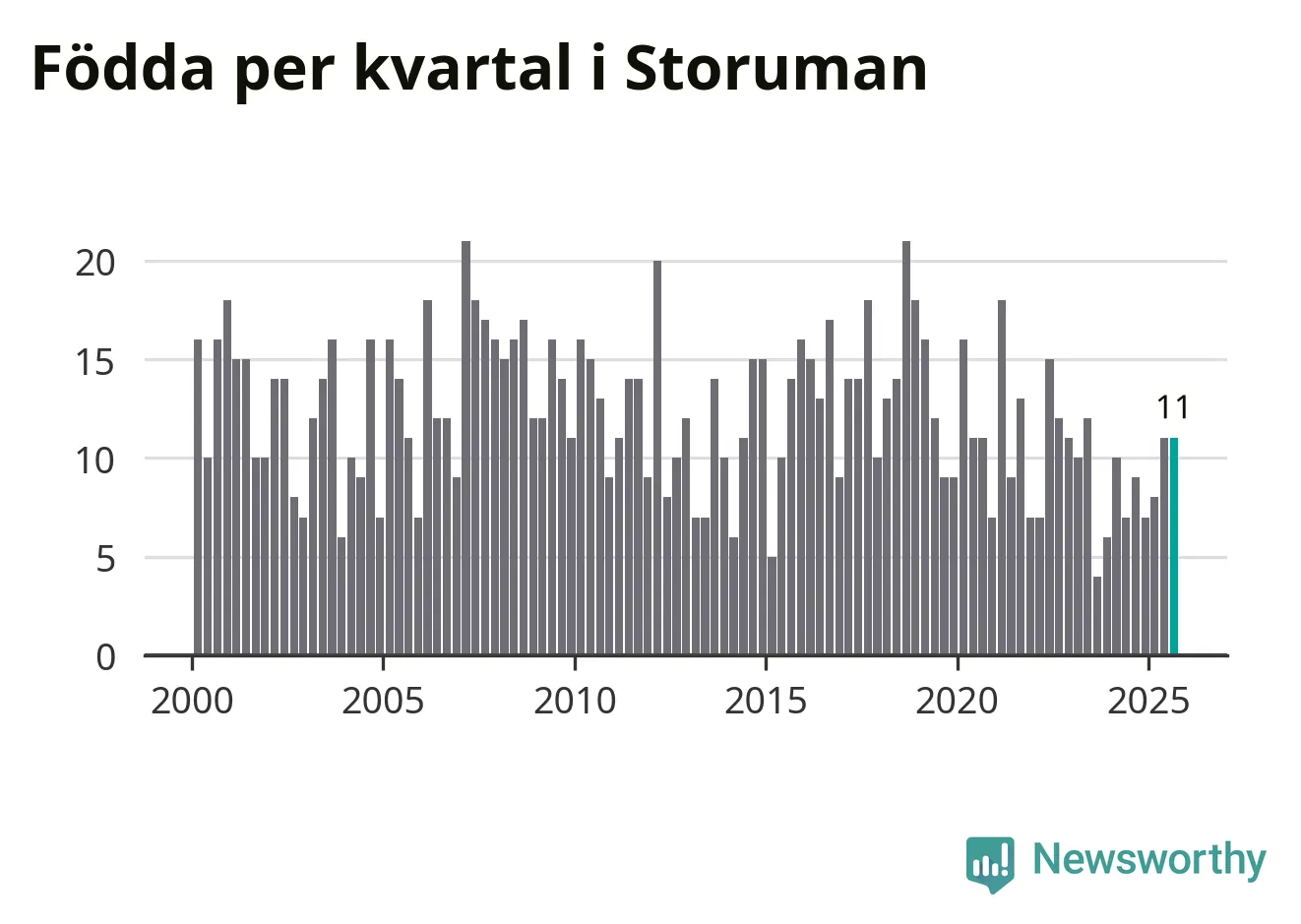 Enligt SCB:s siffror föddes elva barn i Storuman under det senaste kvartalet. Samtidigt avled 15 personer. Skillnaden mellan antal födda och döda är så liten att det inte går att säga om det beror på något annat än SCB:s röjandeskydd. Kommunen har nästan alltid haft negativt födelsenetto tidigare.