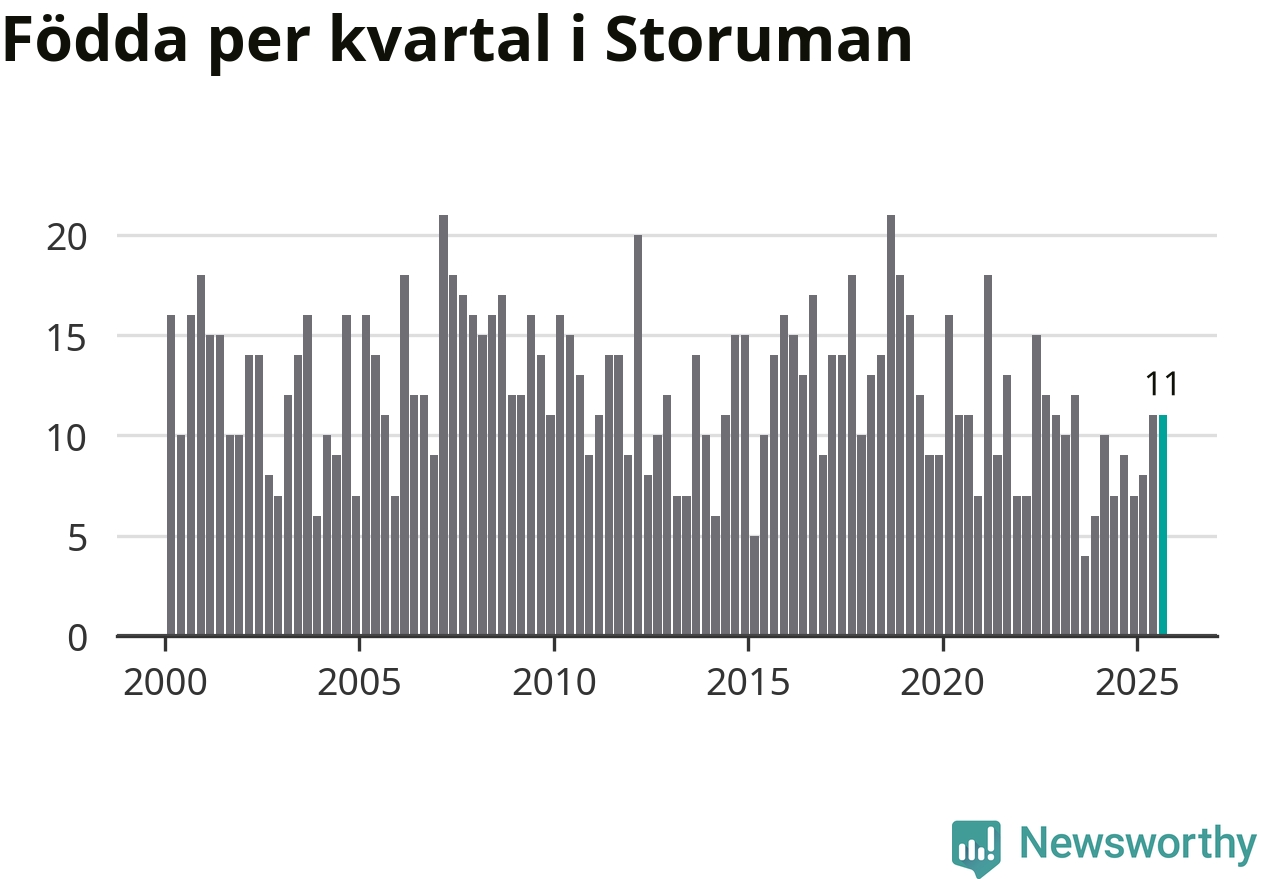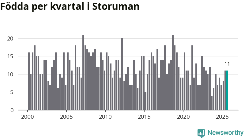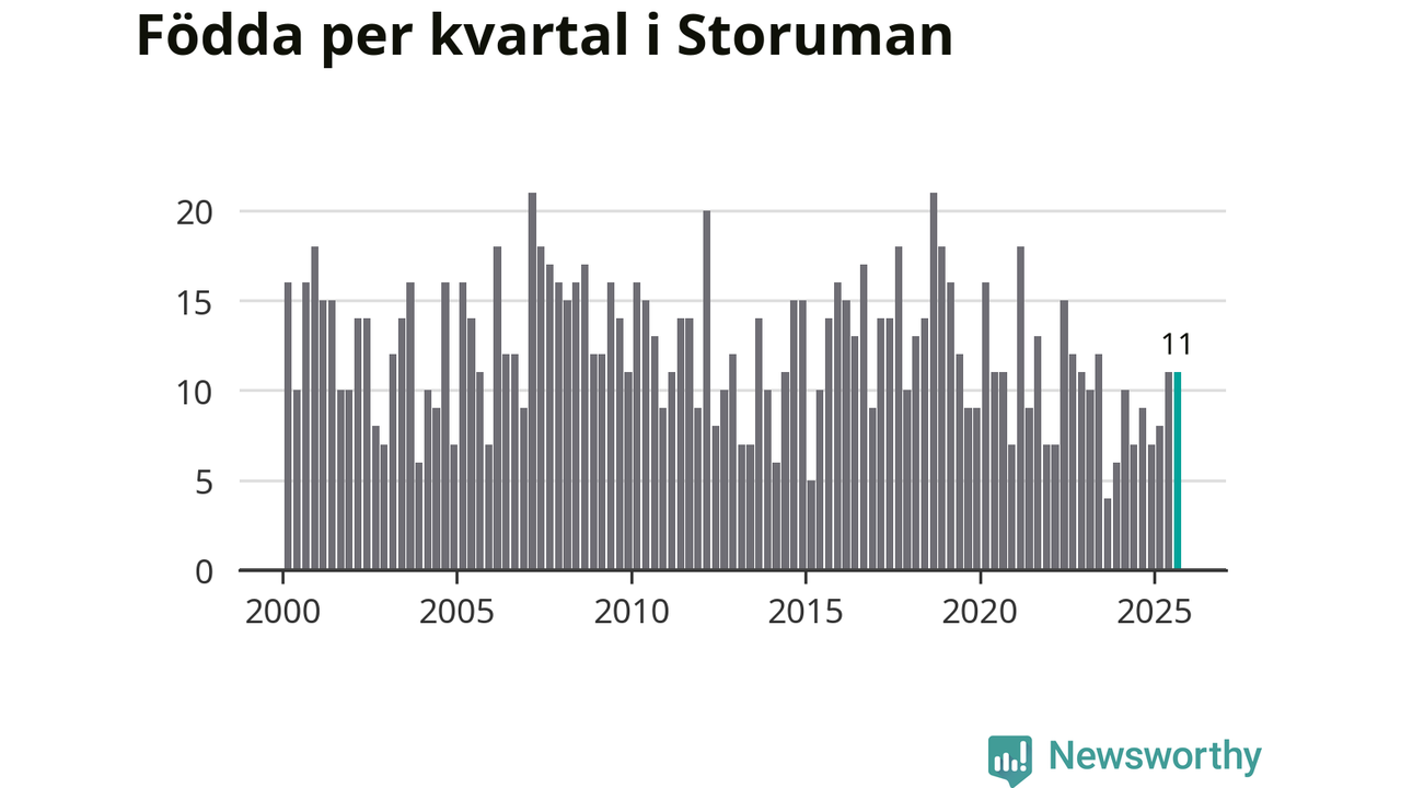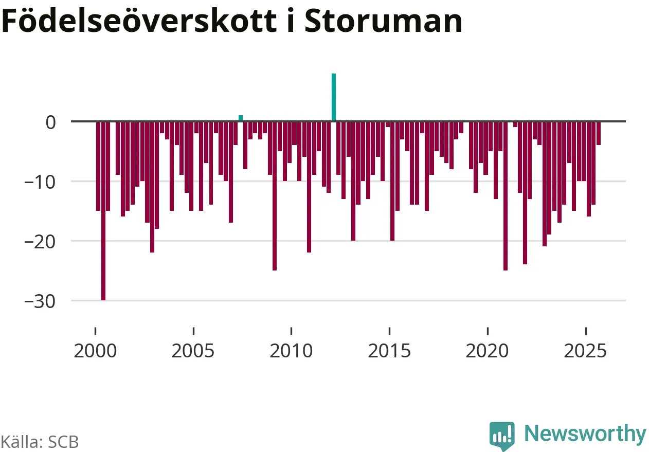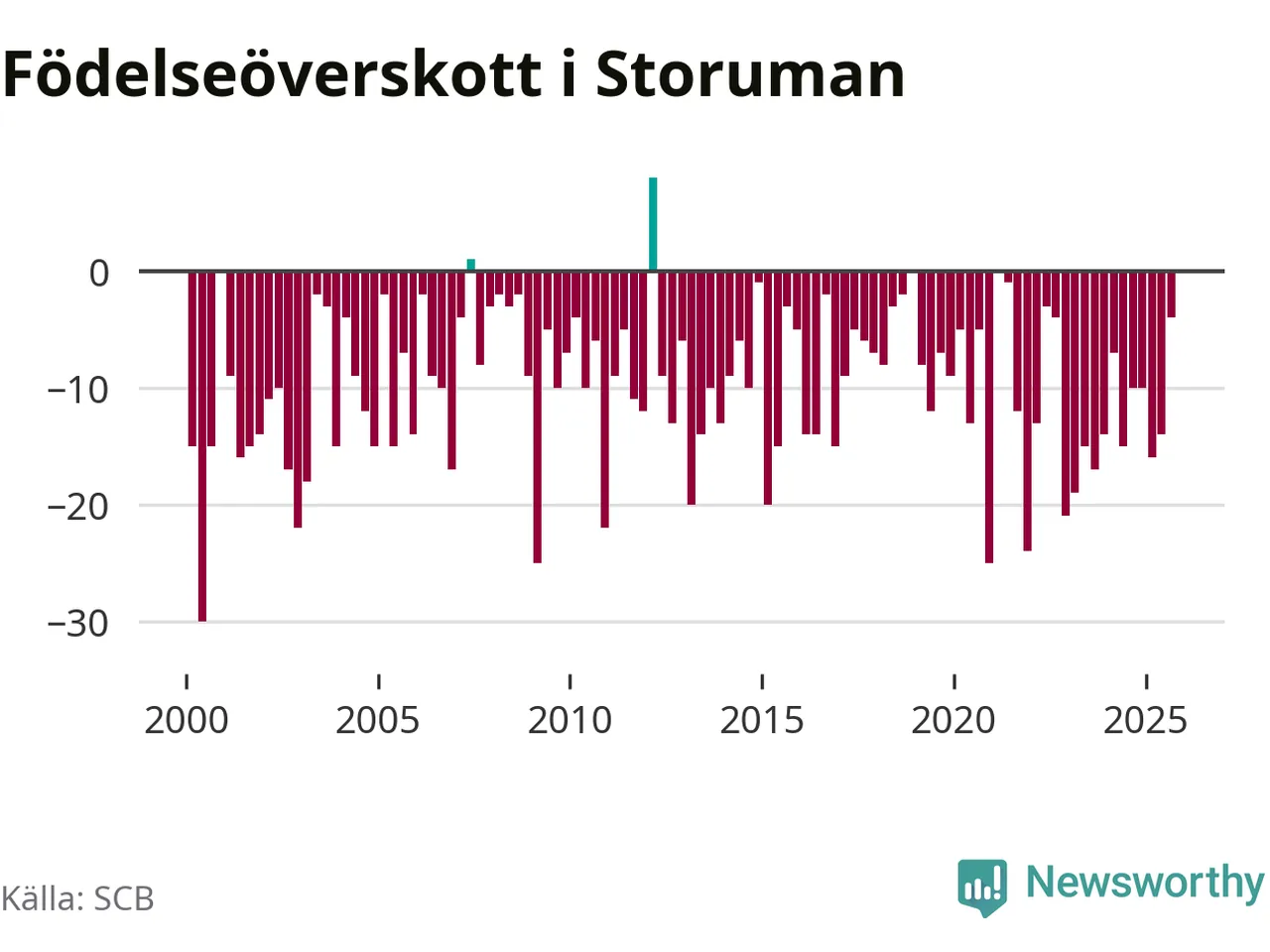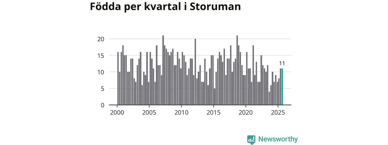 Enligt SCB:s siffror föddes elva barn i Storuman under det senaste kvartalet. Samtidigt avled 15 personer. Skillnaden mellan antal födda och döda är så liten att det inte går att säga om det beror på något annat än SCB:s röjandeskydd. Kommunen har nästan alltid haft negativt födelsenetto tidigare.