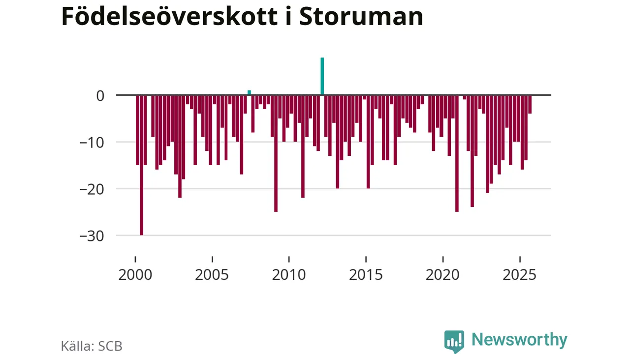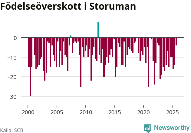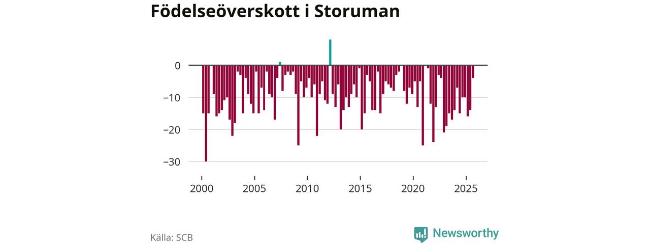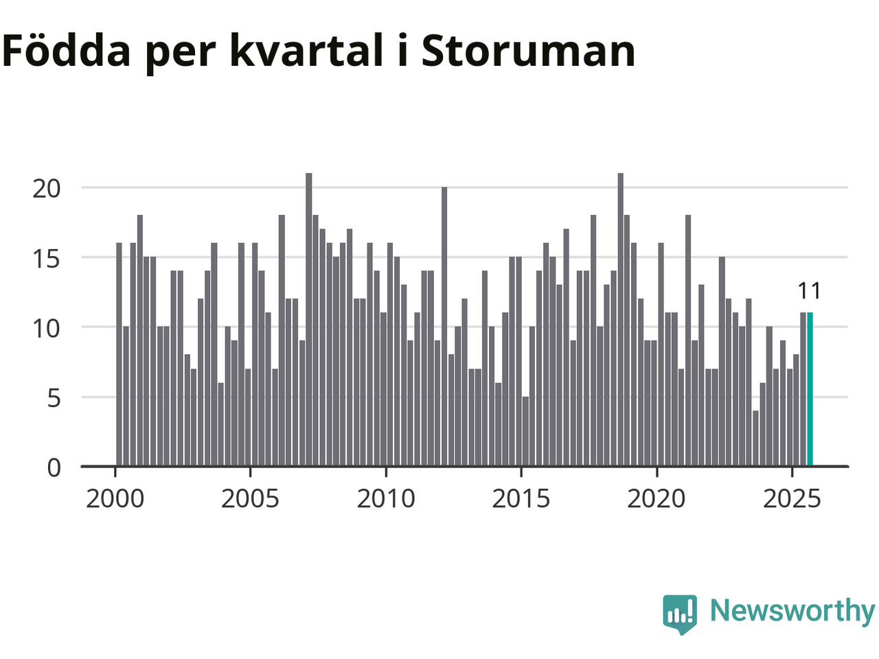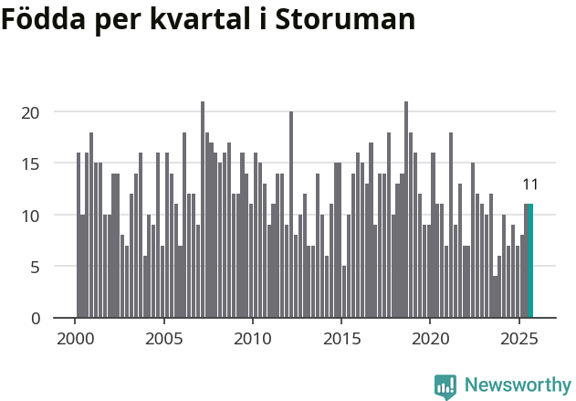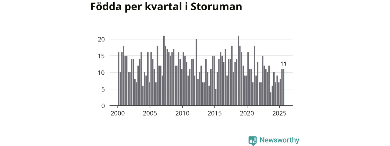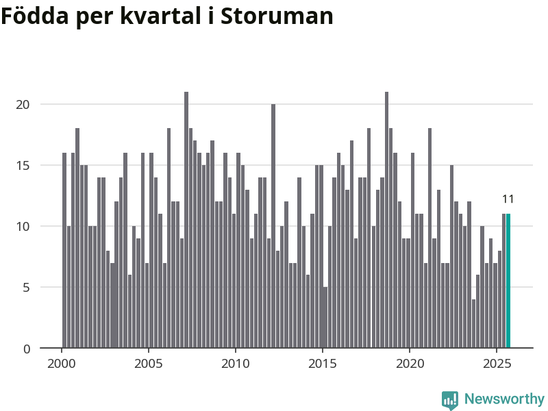 Enligt SCB:s siffror föddes elva barn i Storuman under det senaste kvartalet. Samtidigt avled 15 personer. Skillnaden mellan antal födda och döda är så liten att det inte går att säga om det beror på något annat än SCB:s röjandeskydd. Kommunen har nästan alltid haft negativt födelsenetto tidigare.