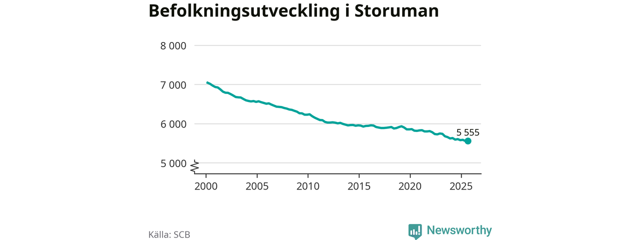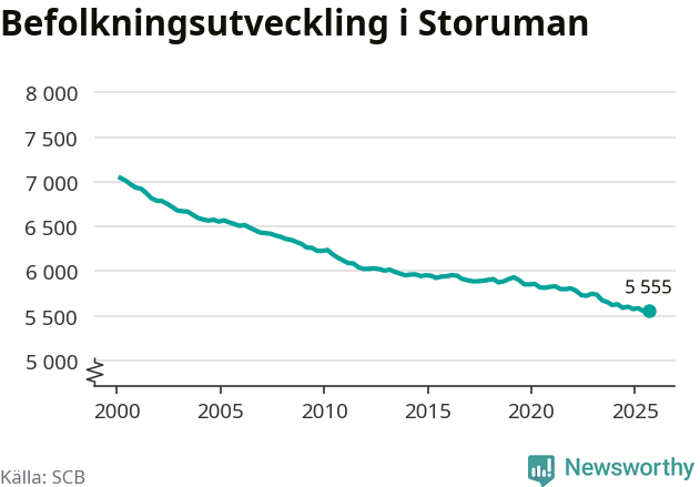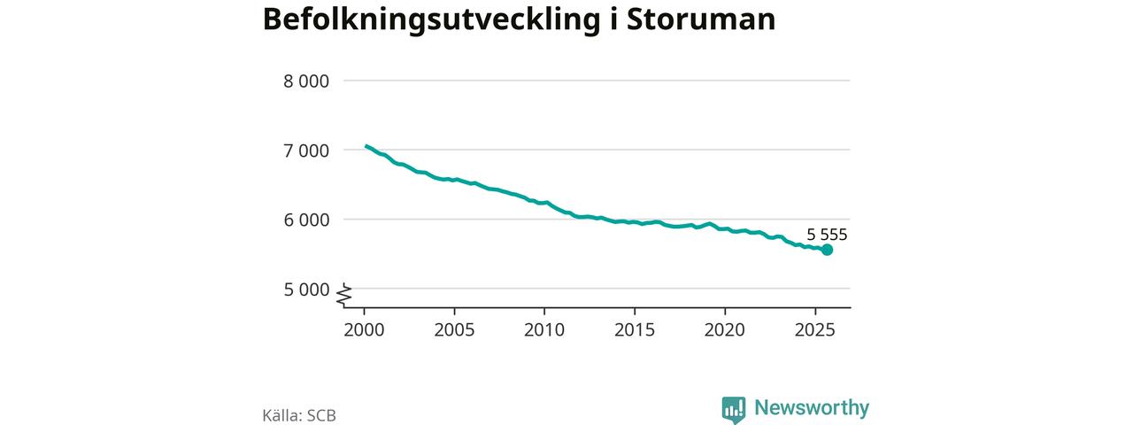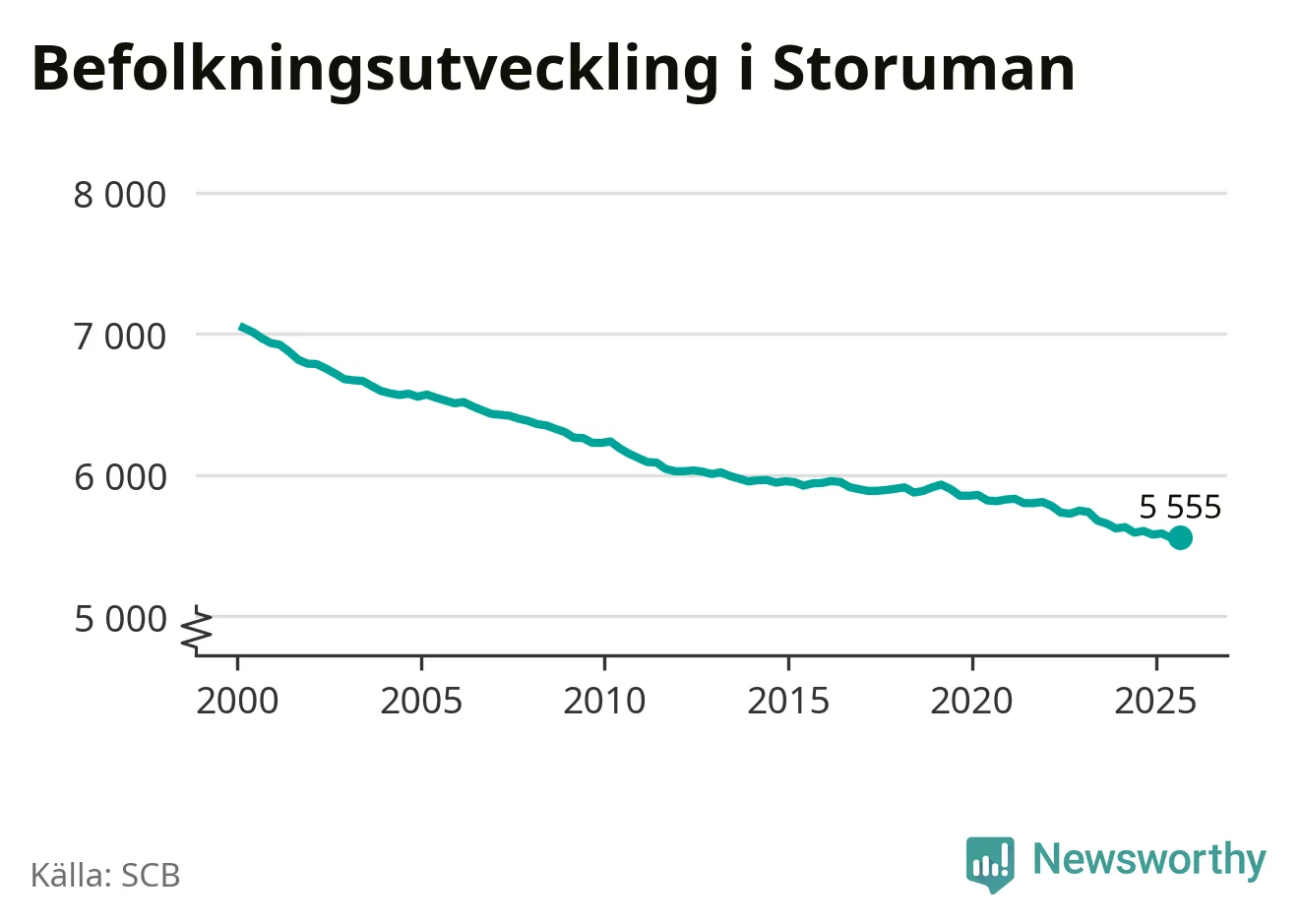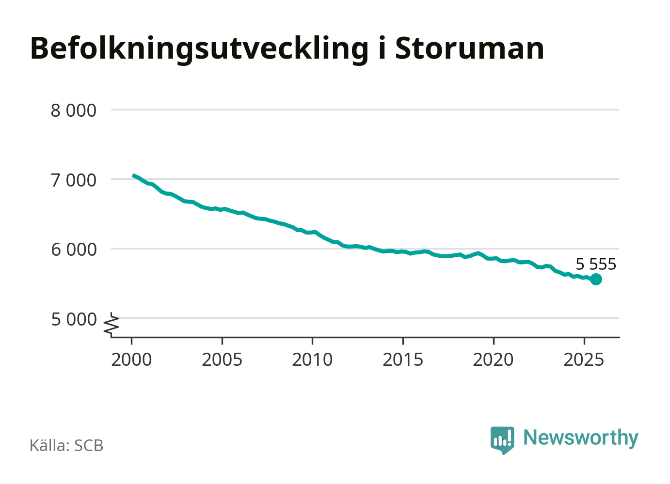 I slutet av tredje kvartalet 2025 bodde 5 555 personer i Storumans kommun, enligt SCB:s senaste siffror. Det är knappt 50 personer färre än vid samma tidpunkt förra året.