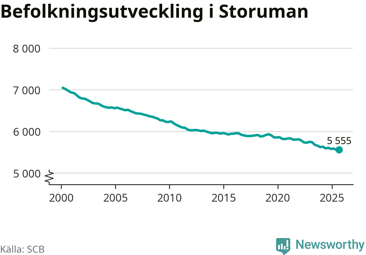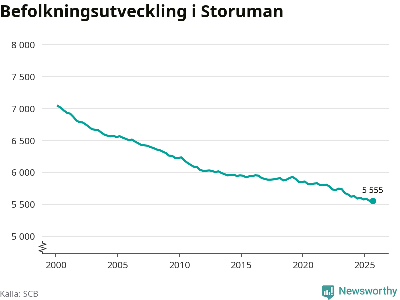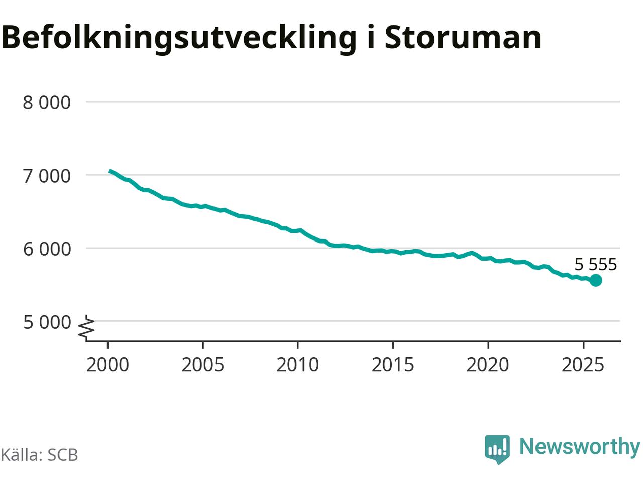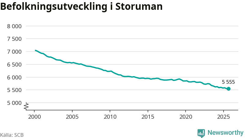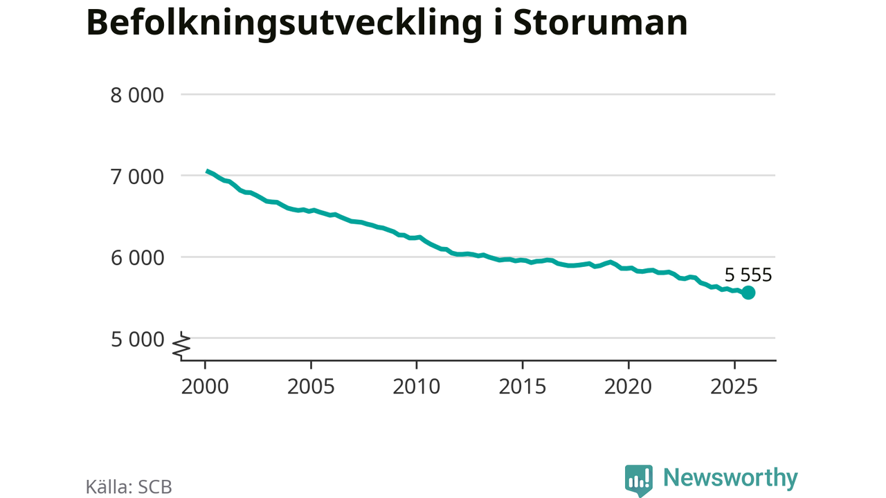 I slutet av tredje kvartalet 2025 bodde 5 555 personer i Storumans kommun, enligt SCB:s senaste siffror. Det är knappt 50 personer färre än vid samma tidpunkt förra året.