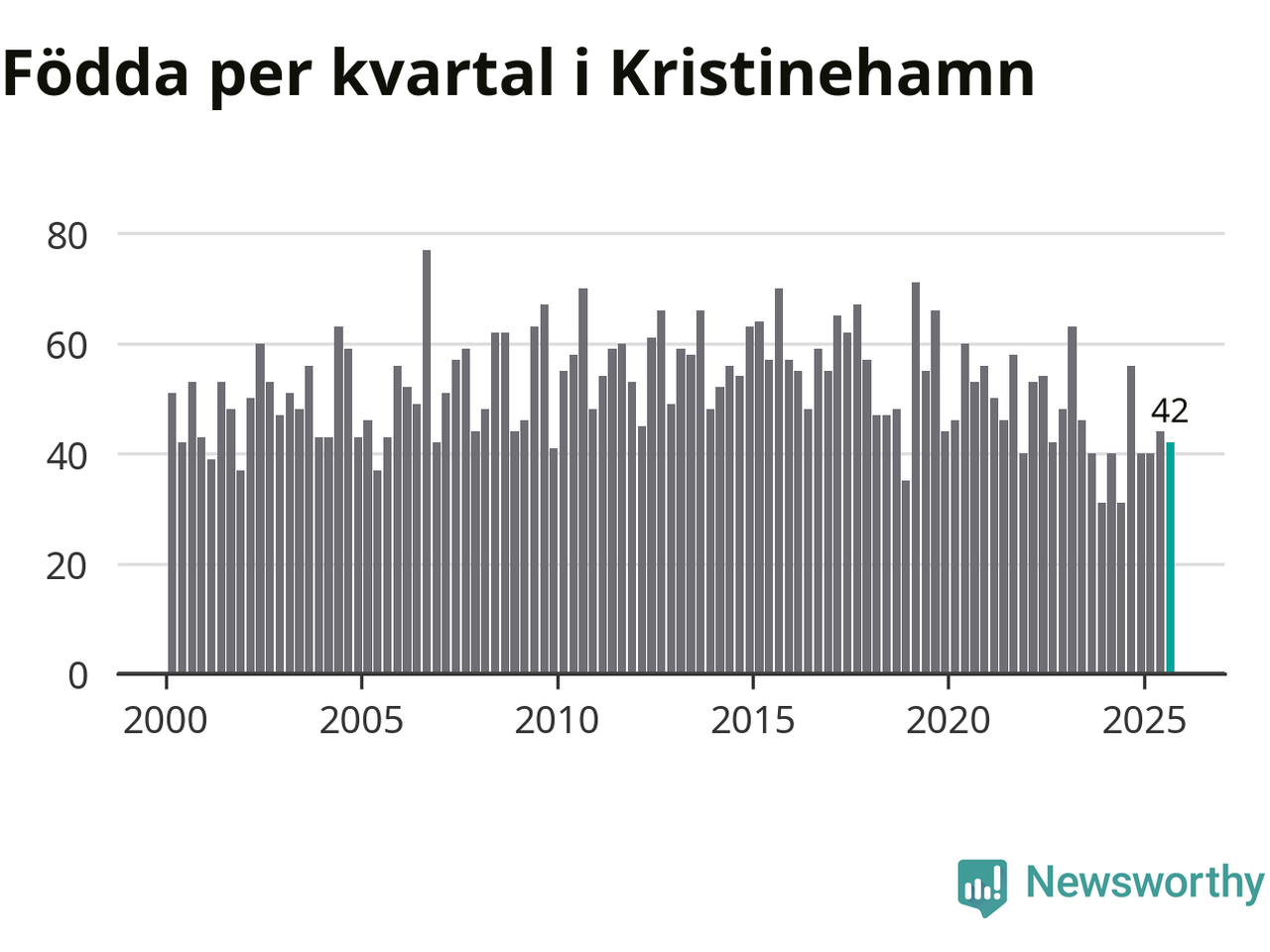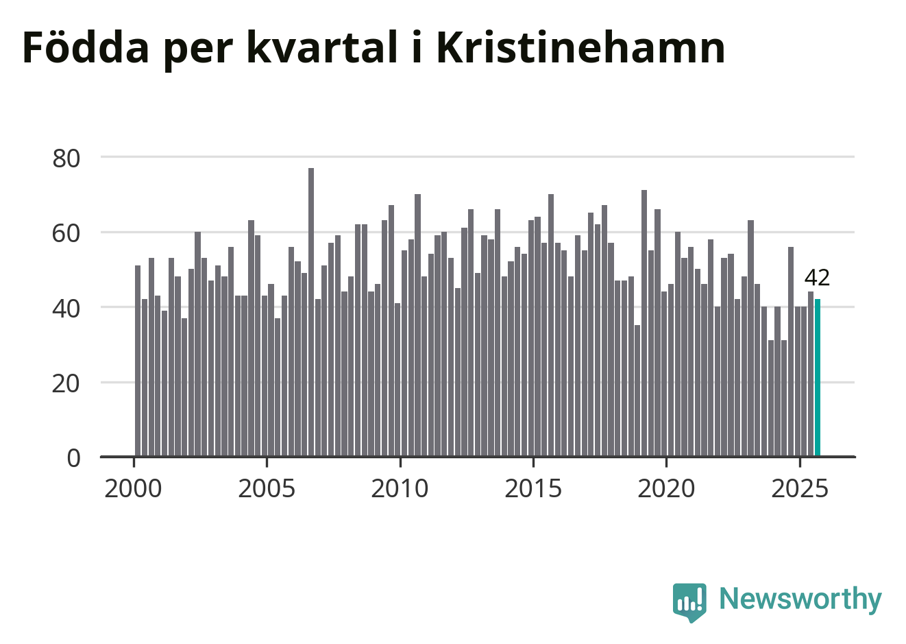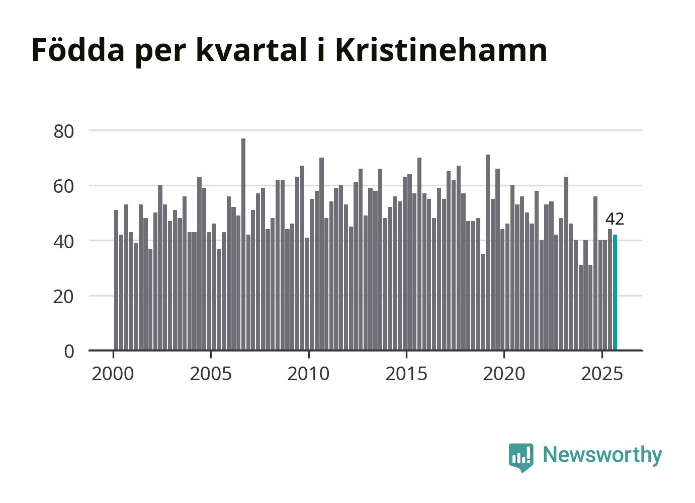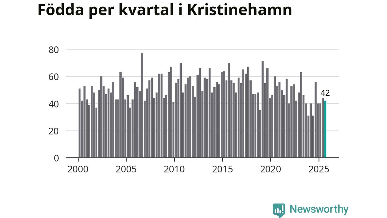 Enligt SCB:s siffror föddes 42 barn i Kristinehamn under det senaste kvartalet. Samtidigt avled 71 personer. Kristinehamn hade alltså ett negativt födelsenetto, vilket kommunen historiskt sett nästan alltid har haft.