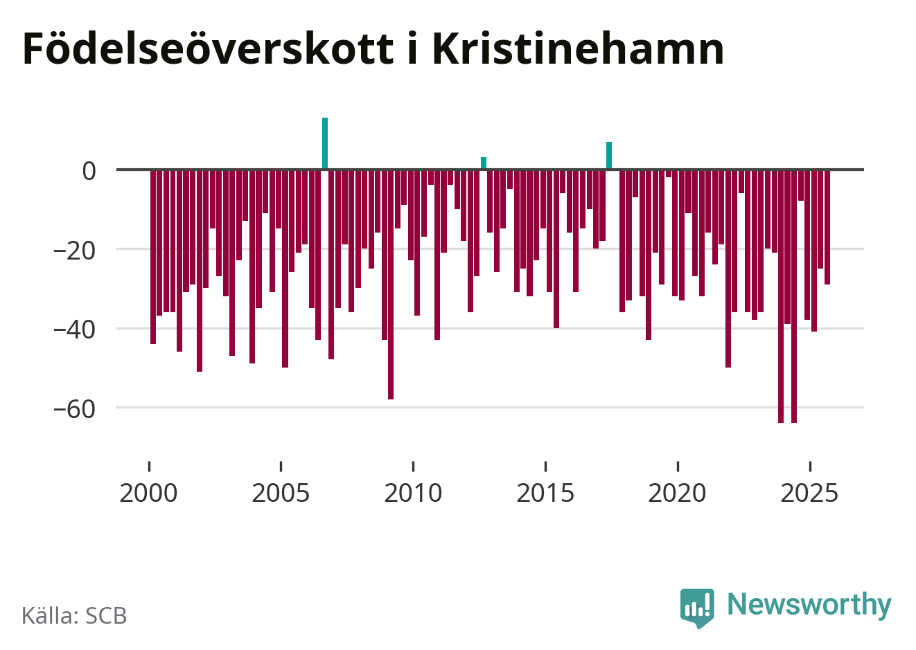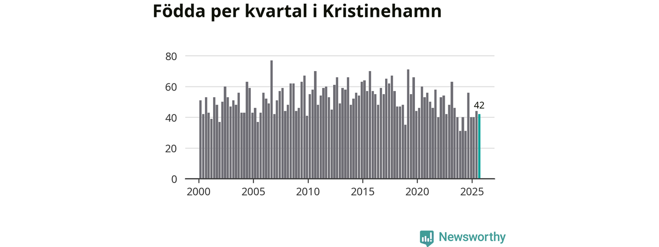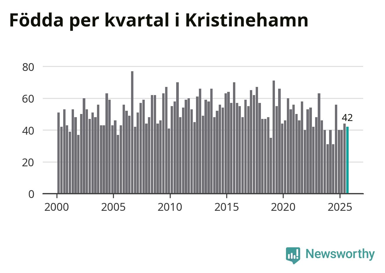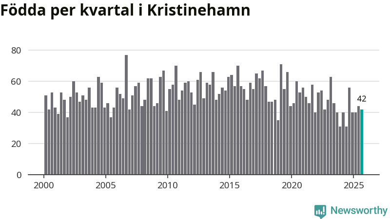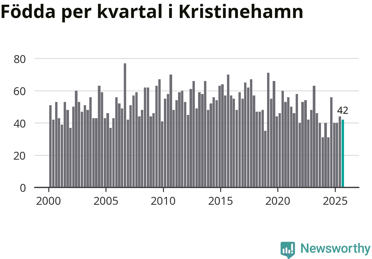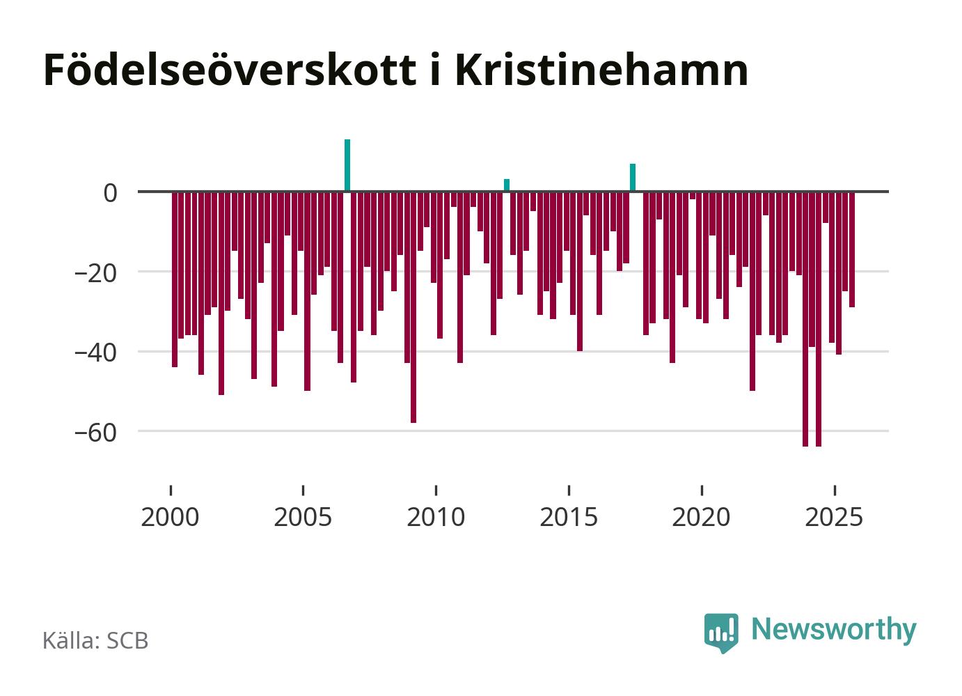 Enligt SCB:s siffror föddes 42 barn i Kristinehamn under det senaste kvartalet. Samtidigt avled 71 personer. Kristinehamn hade alltså ett negativt födelsenetto, vilket kommunen historiskt sett nästan alltid har haft.