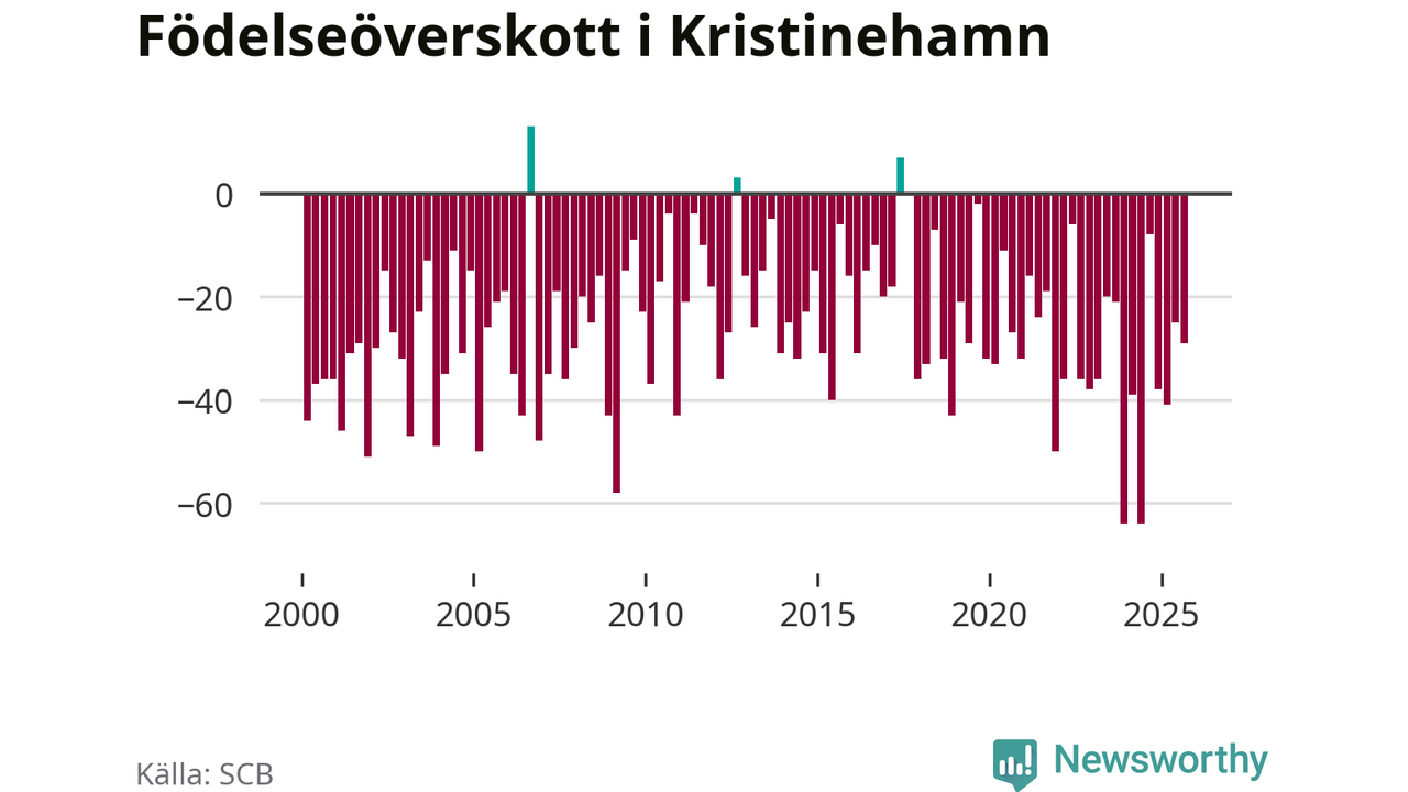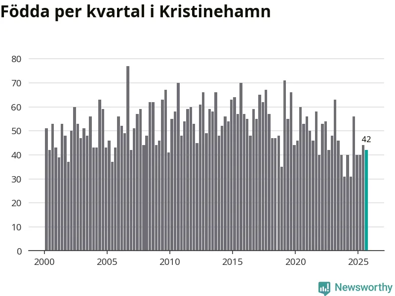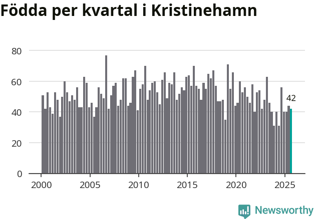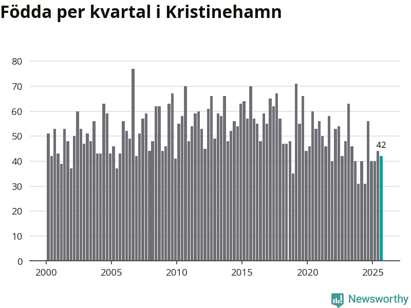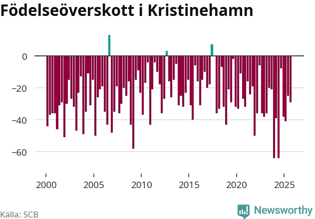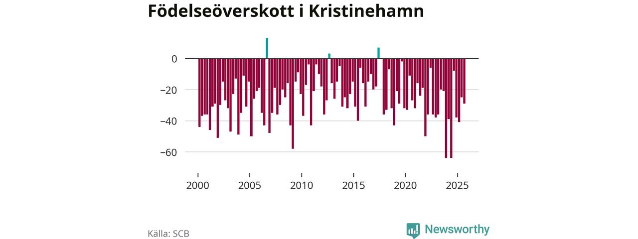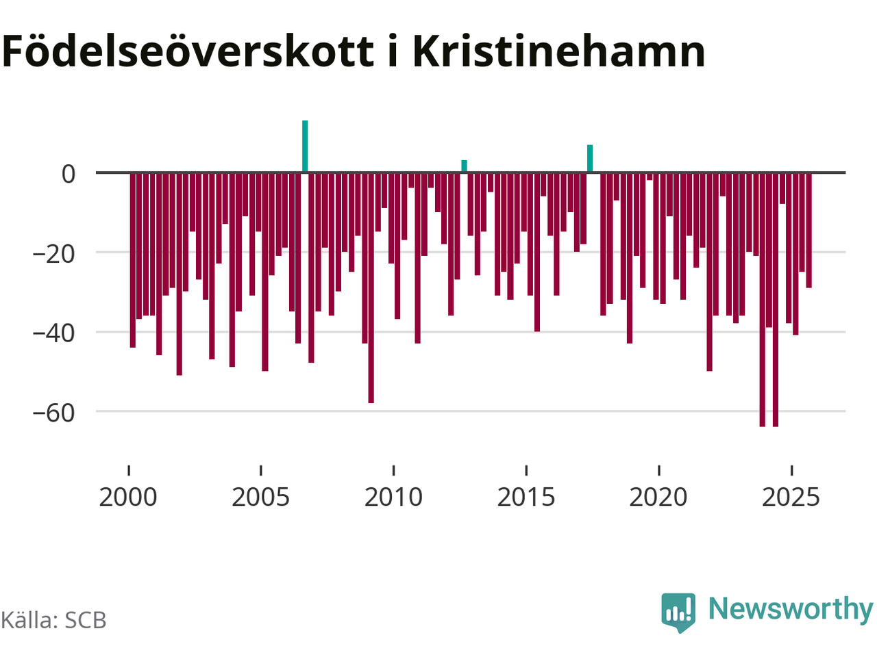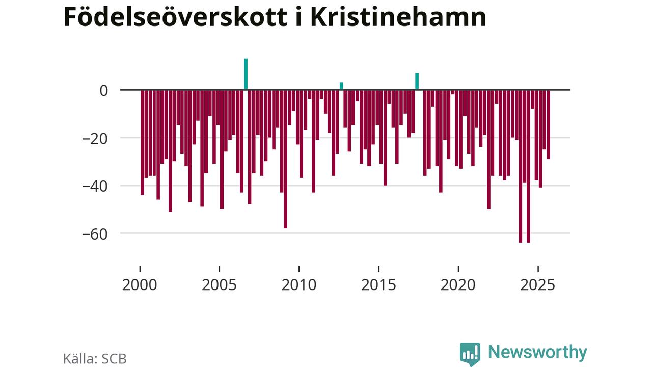 Enligt SCB:s siffror föddes 42 barn i Kristinehamn under det senaste kvartalet. Samtidigt avled 71 personer. Kristinehamn hade alltså ett negativt födelsenetto, vilket kommunen historiskt sett nästan alltid har haft.