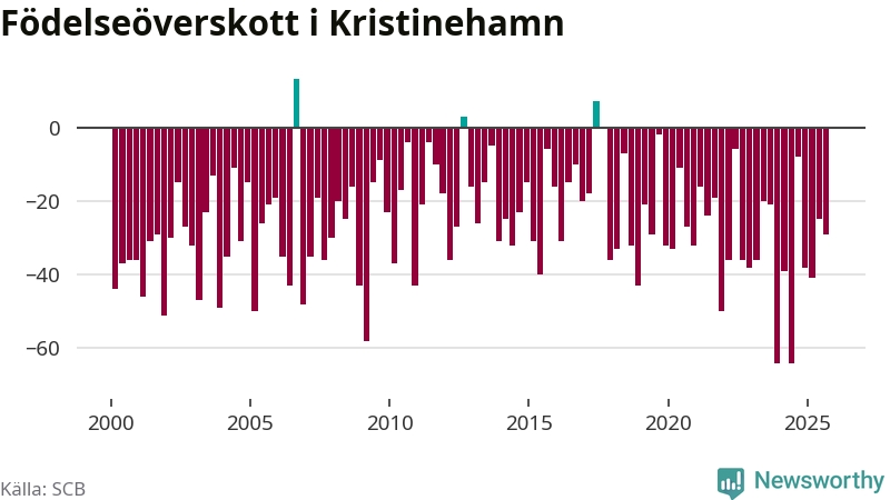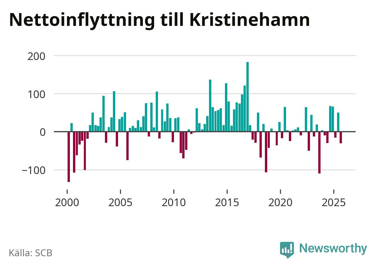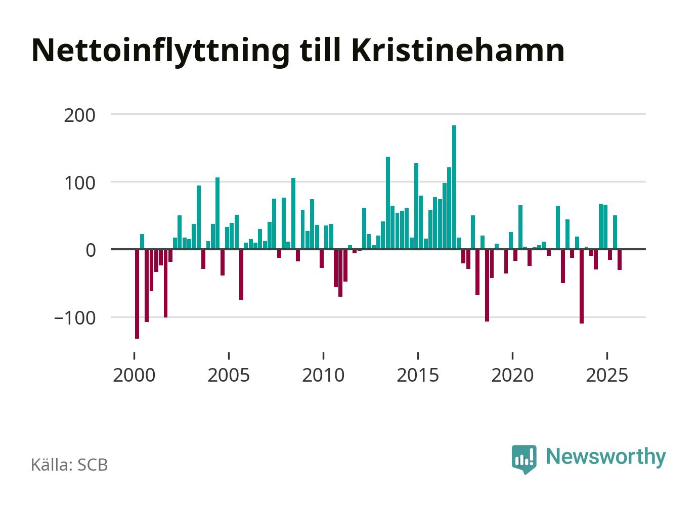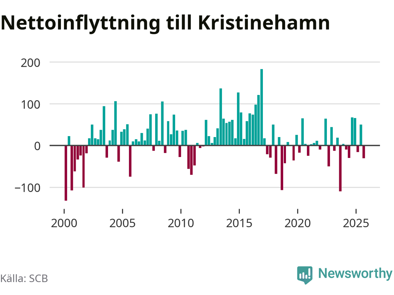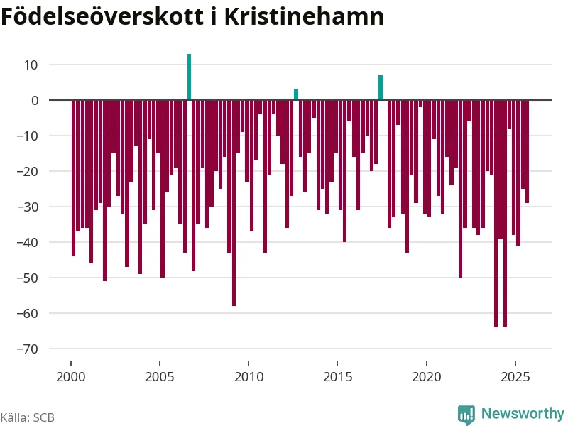 Enligt SCB:s siffror föddes 42 barn i Kristinehamn under det senaste kvartalet. Samtidigt avled 71 personer. Kristinehamn hade alltså ett negativt födelsenetto, vilket kommunen historiskt sett nästan alltid har haft.