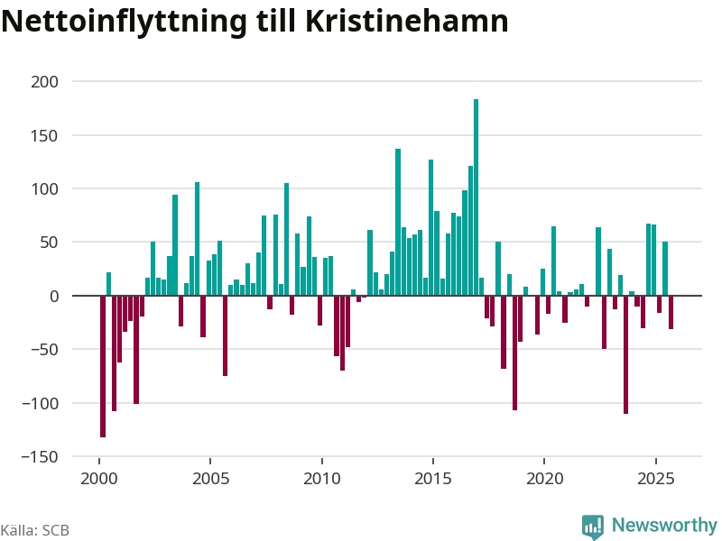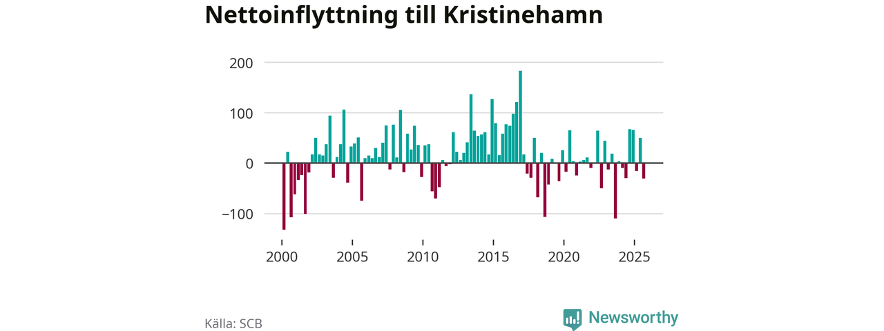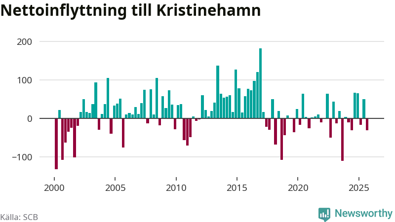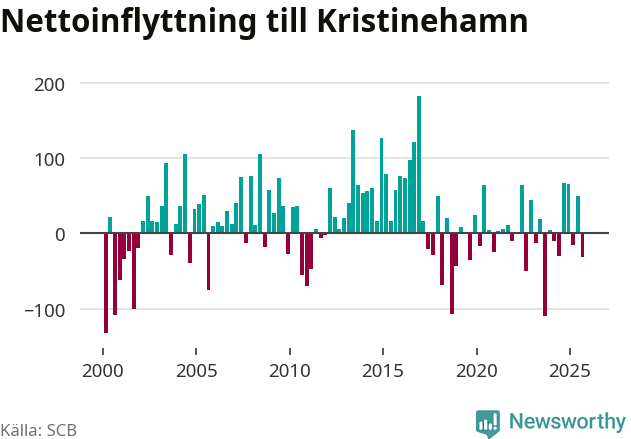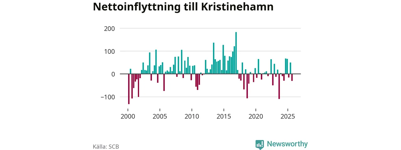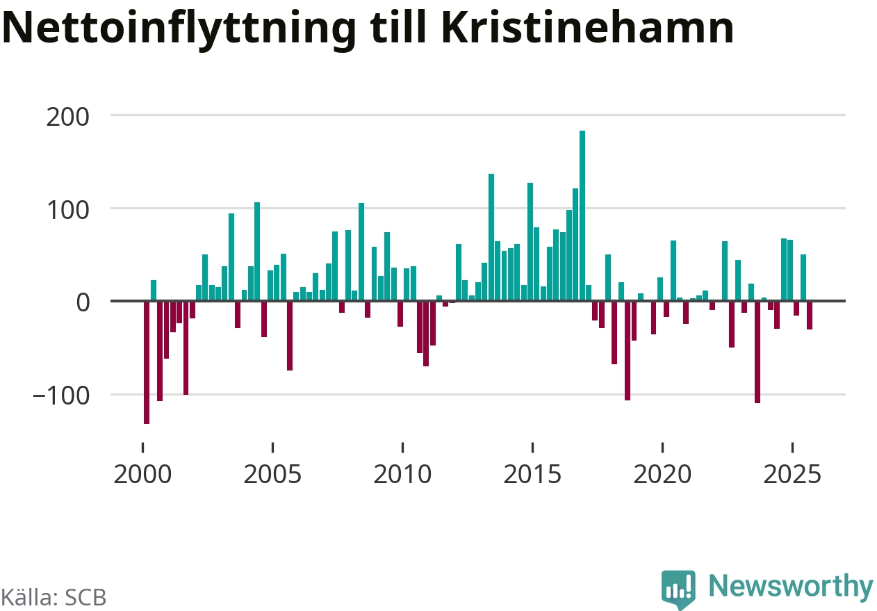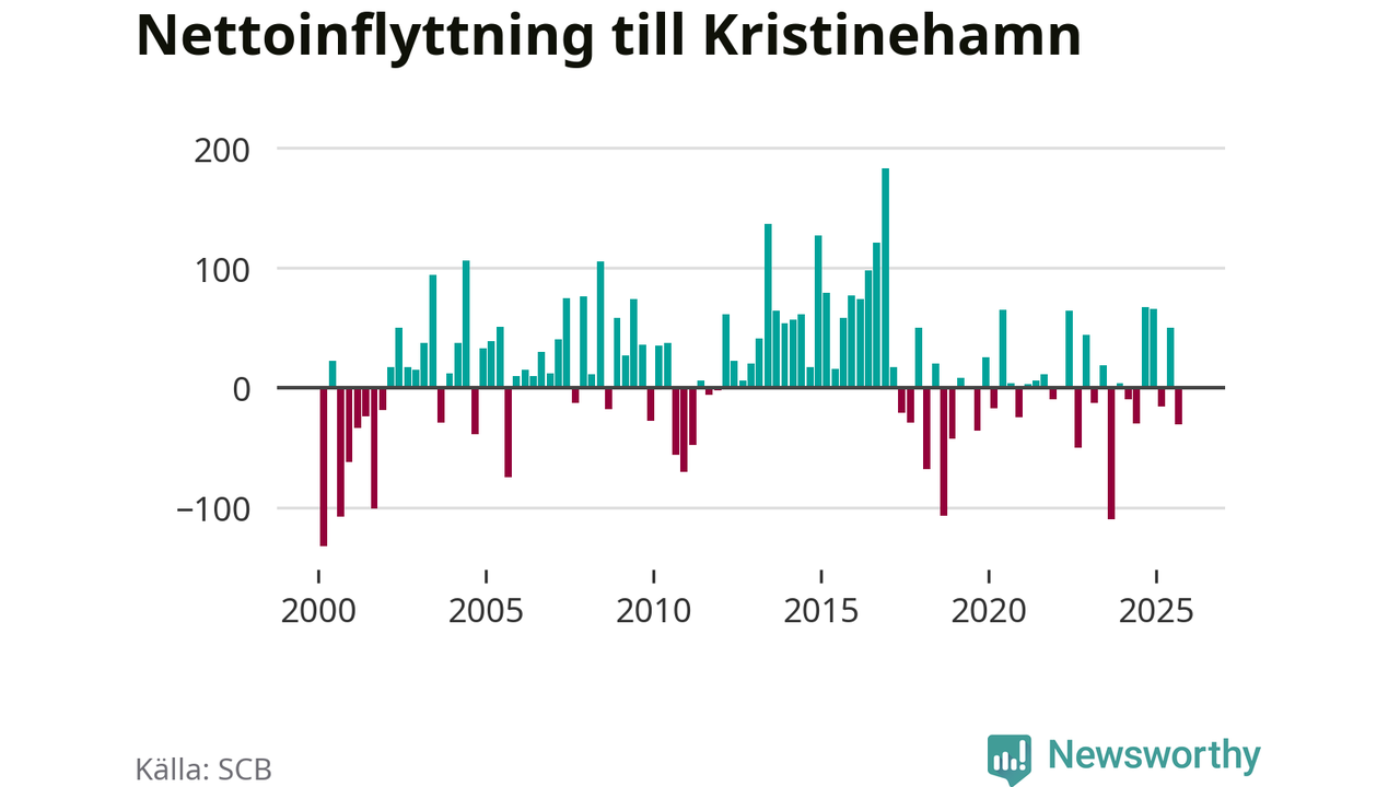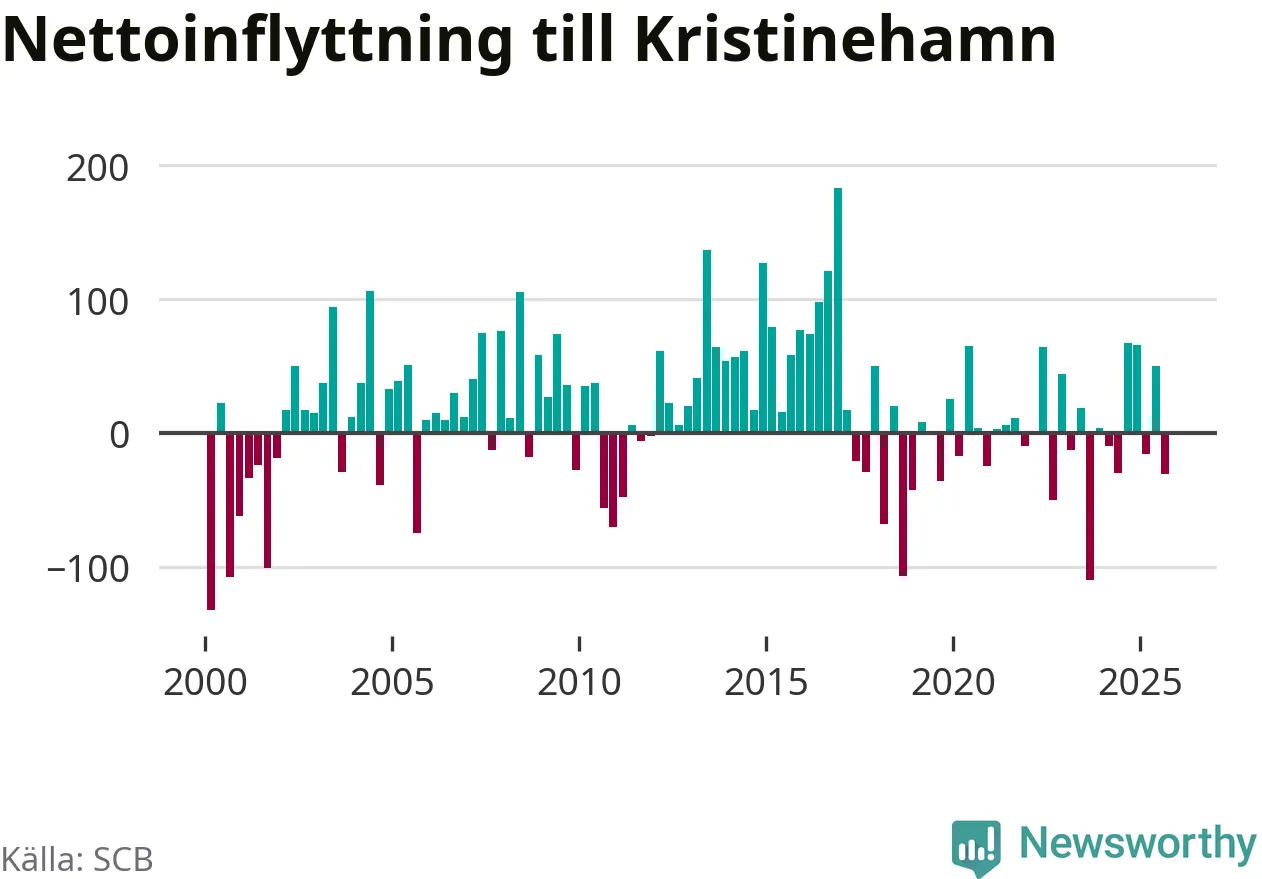 Enligt SCB:s siffror föddes 42 barn i Kristinehamn under det senaste kvartalet. Samtidigt avled 71 personer. Kristinehamn hade alltså ett negativt födelsenetto, vilket kommunen historiskt sett nästan alltid har haft.