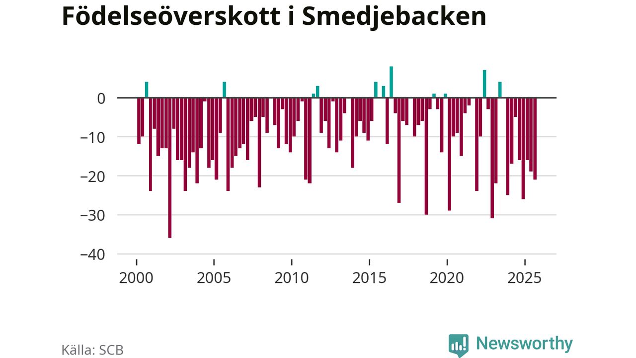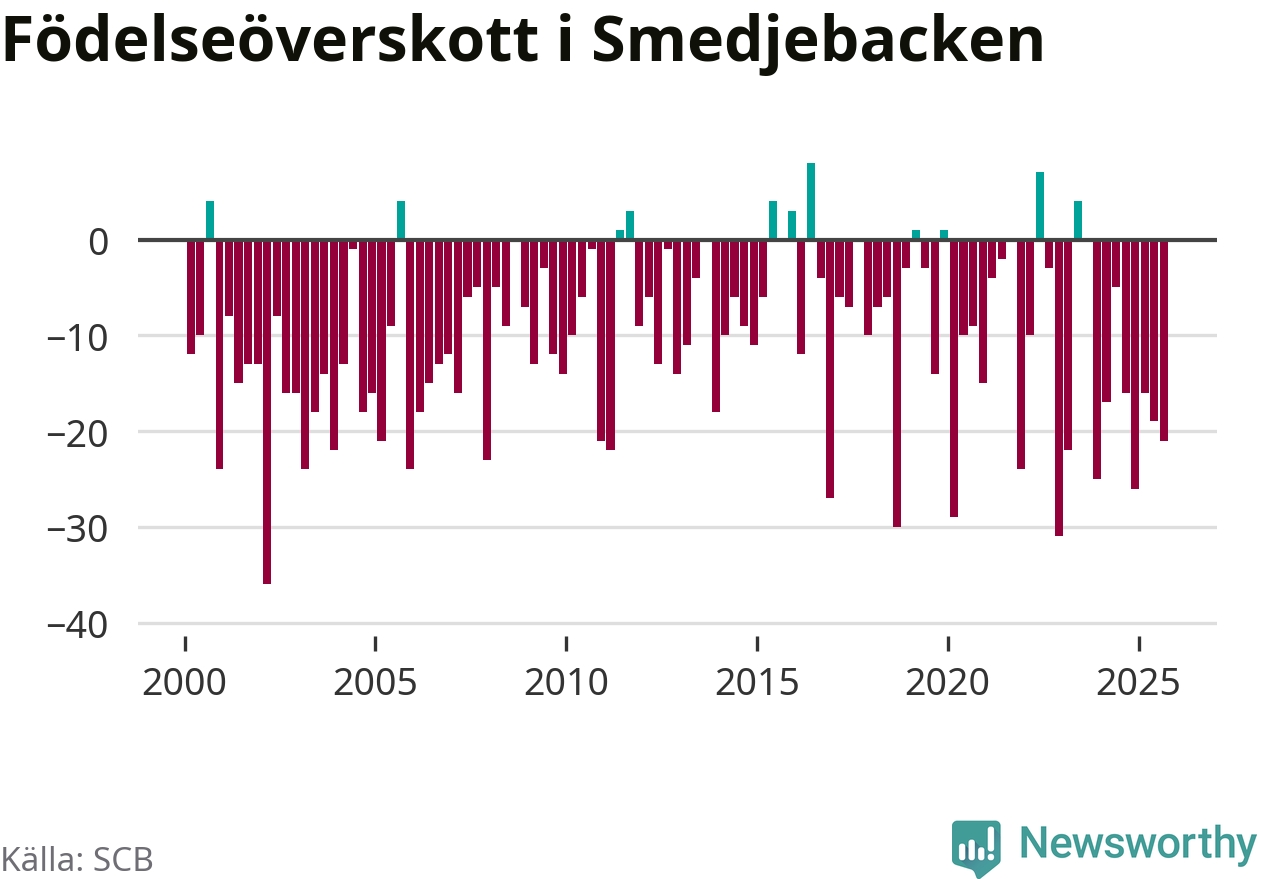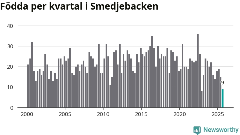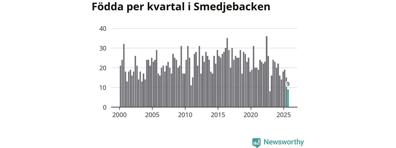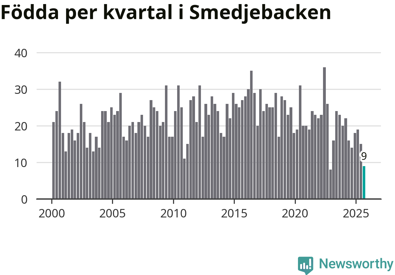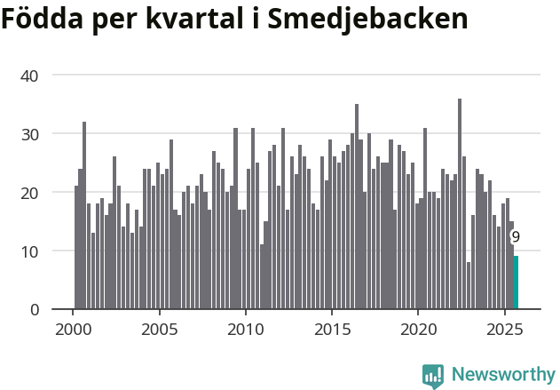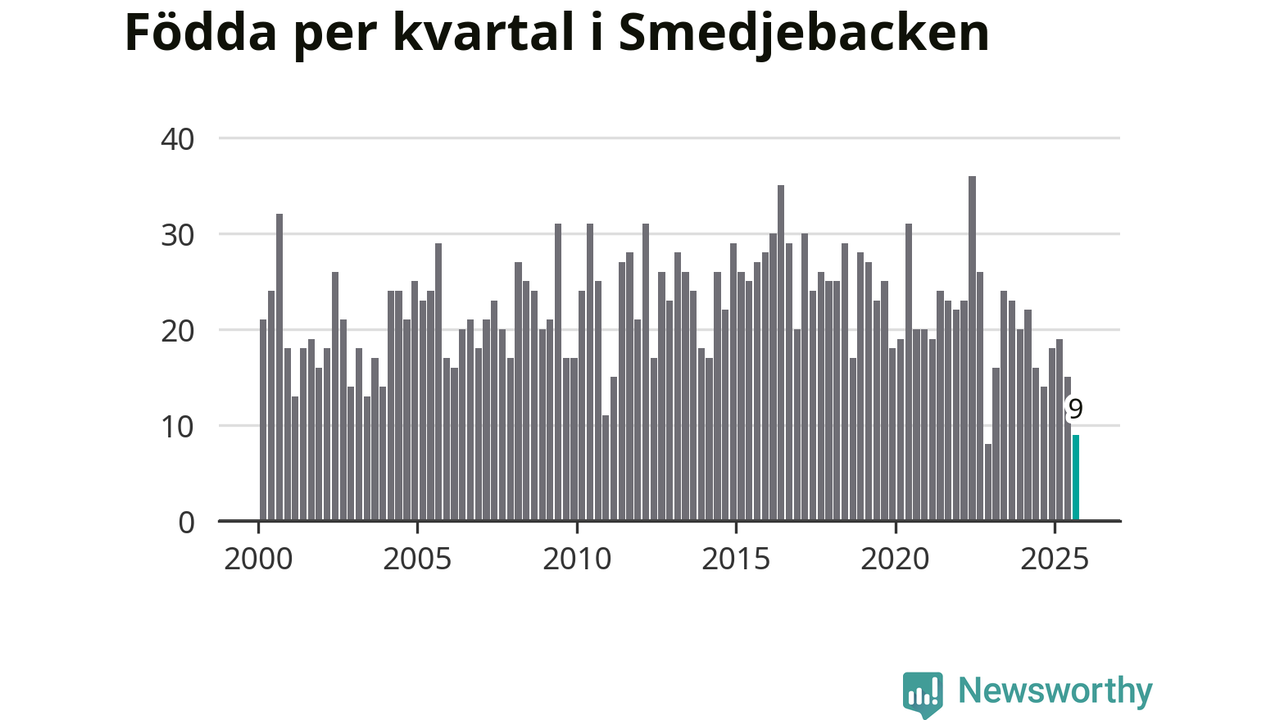 Enligt SCB:s siffror föddes nio barn i Smedjebacken under det senaste kvartalet. Samtidigt avled 30 personer. Smedjebacken hade alltså ett negativt födelsenetto, vilket kommunen historiskt sett oftast har haft.