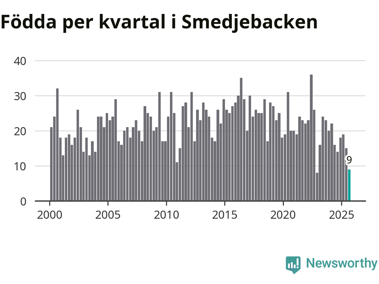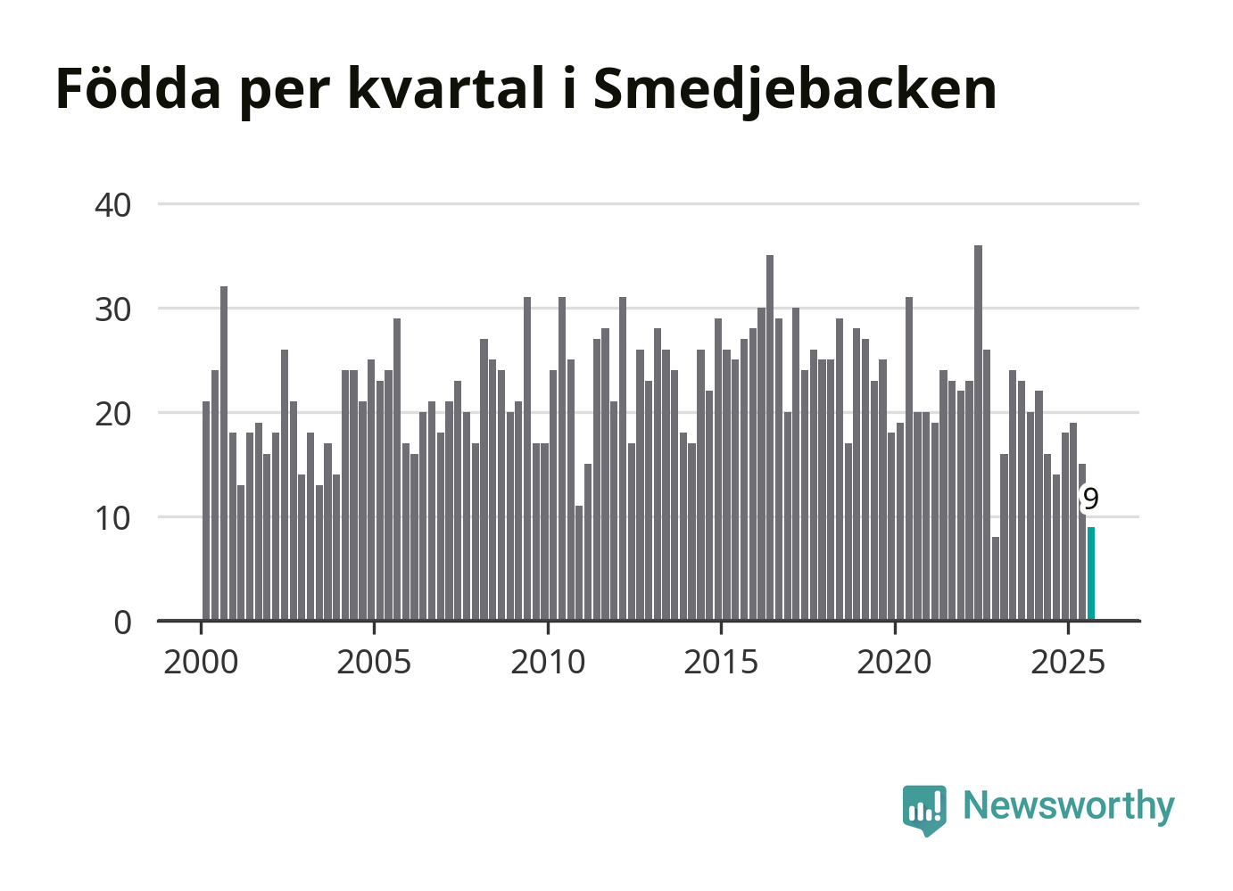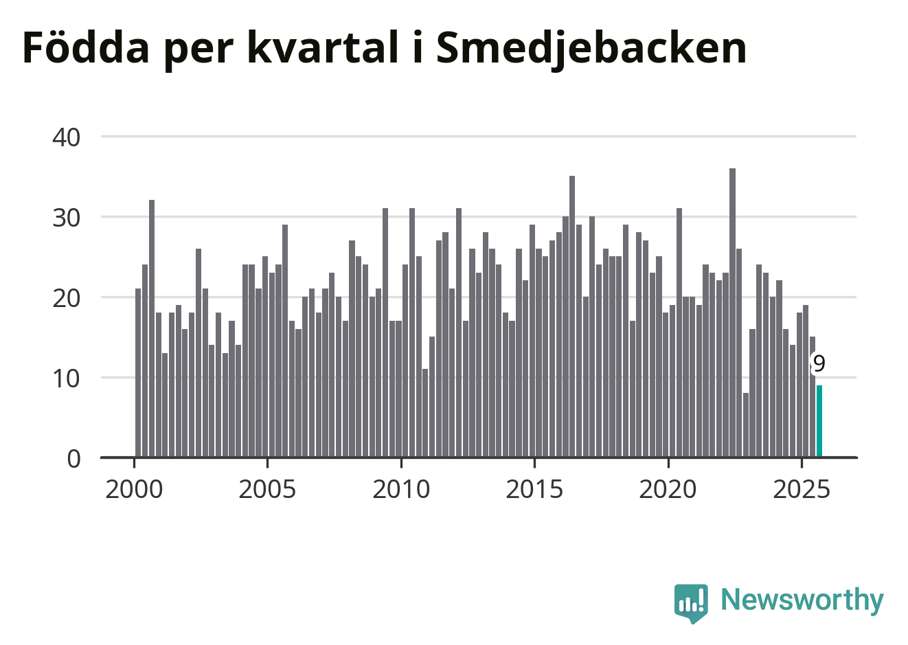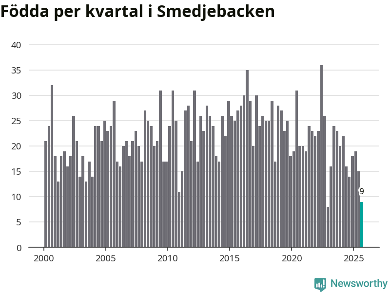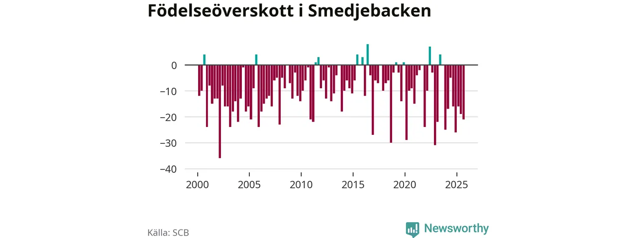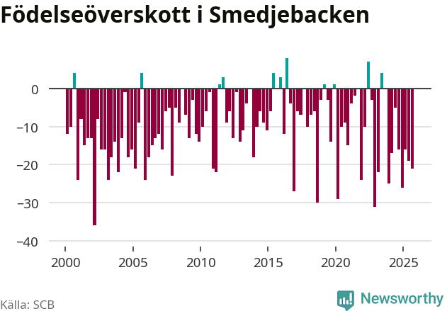 Enligt SCB:s siffror föddes nio barn i Smedjebacken under det senaste kvartalet. Samtidigt avled 30 personer. Smedjebacken hade alltså ett negativt födelsenetto, vilket kommunen historiskt sett oftast har haft.