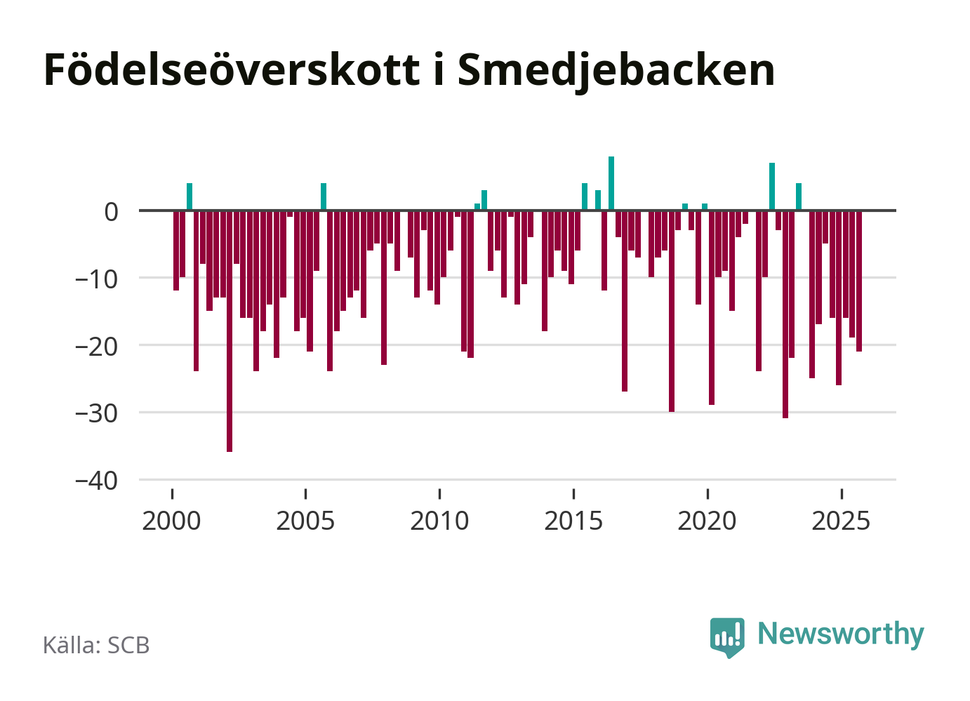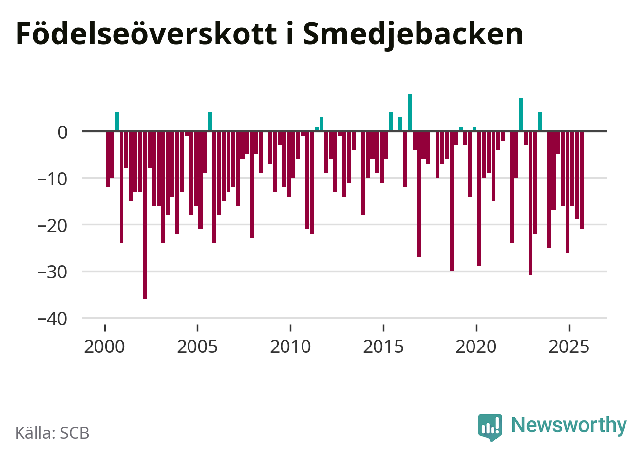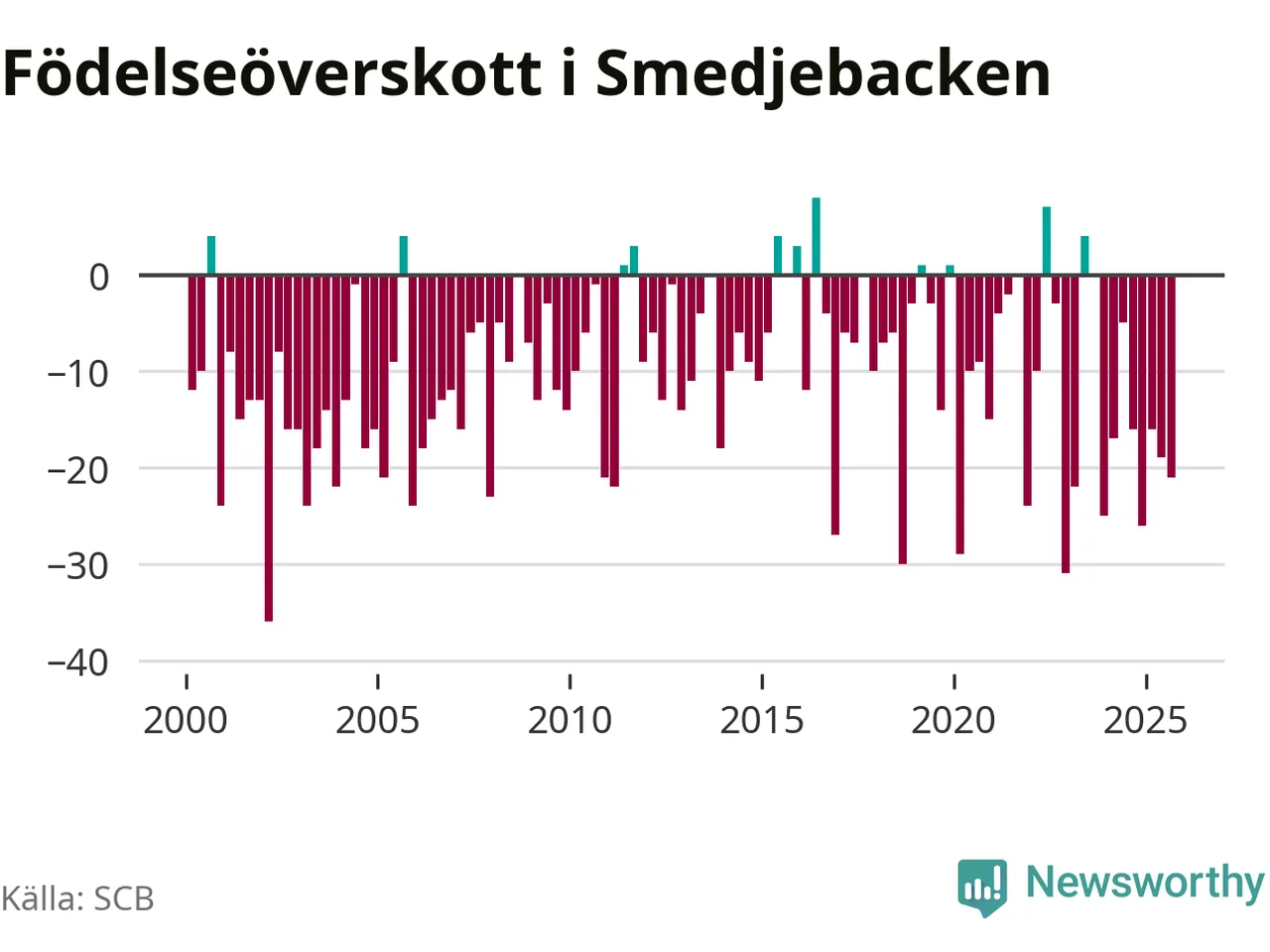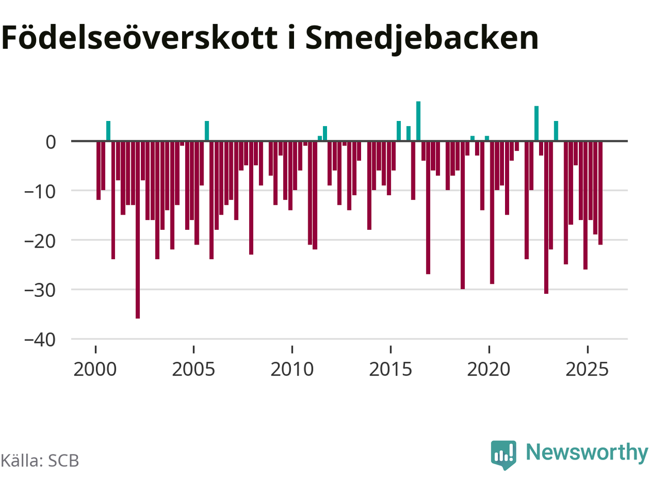 Enligt SCB:s siffror föddes nio barn i Smedjebacken under det senaste kvartalet. Samtidigt avled 30 personer. Smedjebacken hade alltså ett negativt födelsenetto, vilket kommunen historiskt sett oftast har haft.
