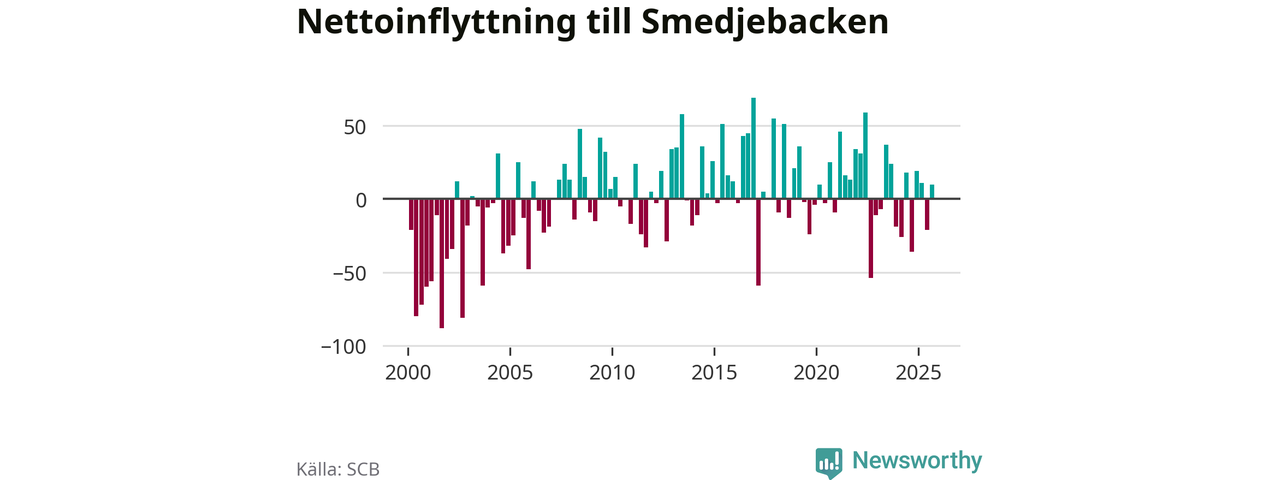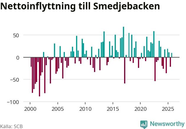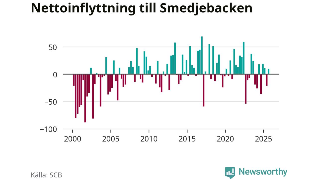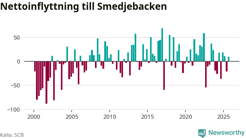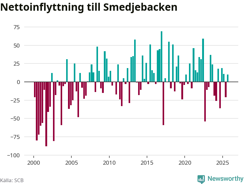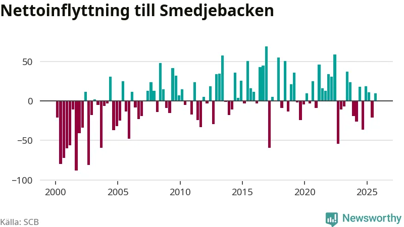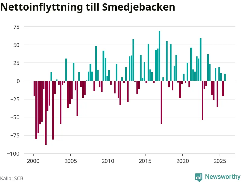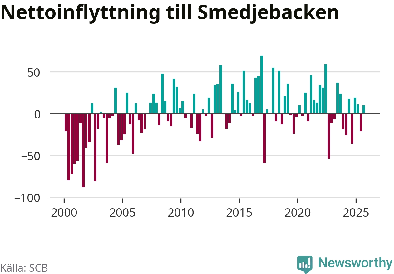 Under tredje kvartalet 2025 flyttade 178 personer till kommunen medan 168 personer flyttade därifrån. Det är historiskt sett en stor inflyttning under ett kvartal. Skillnaden mellan antalet in- och utflyttade är så liten att den lika gärna kan bero på SCB:s slumpmässiga brus. Sedan seklets början har Smedjebacken oftast haft ett positivt flyttnetto.