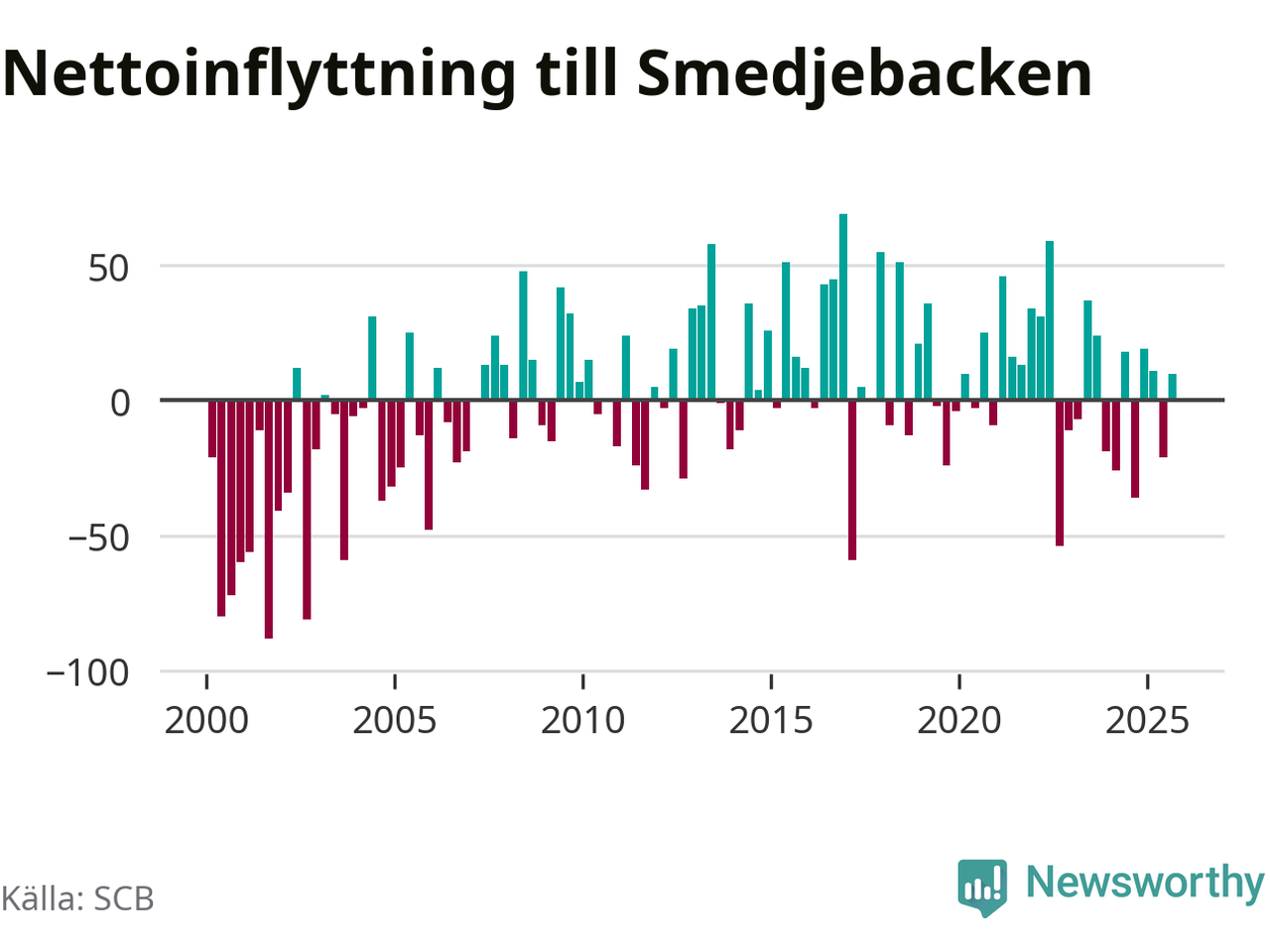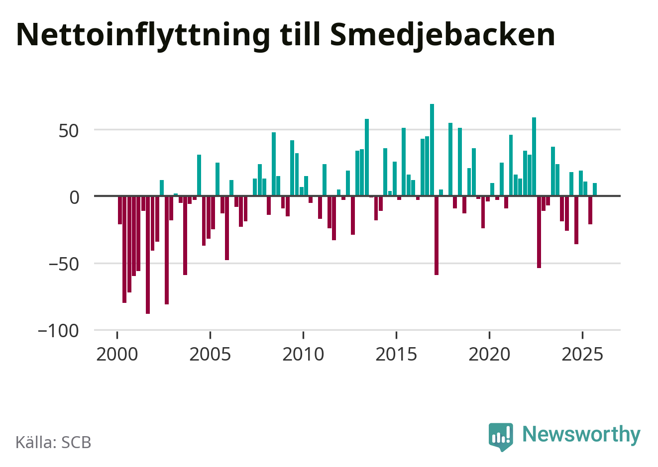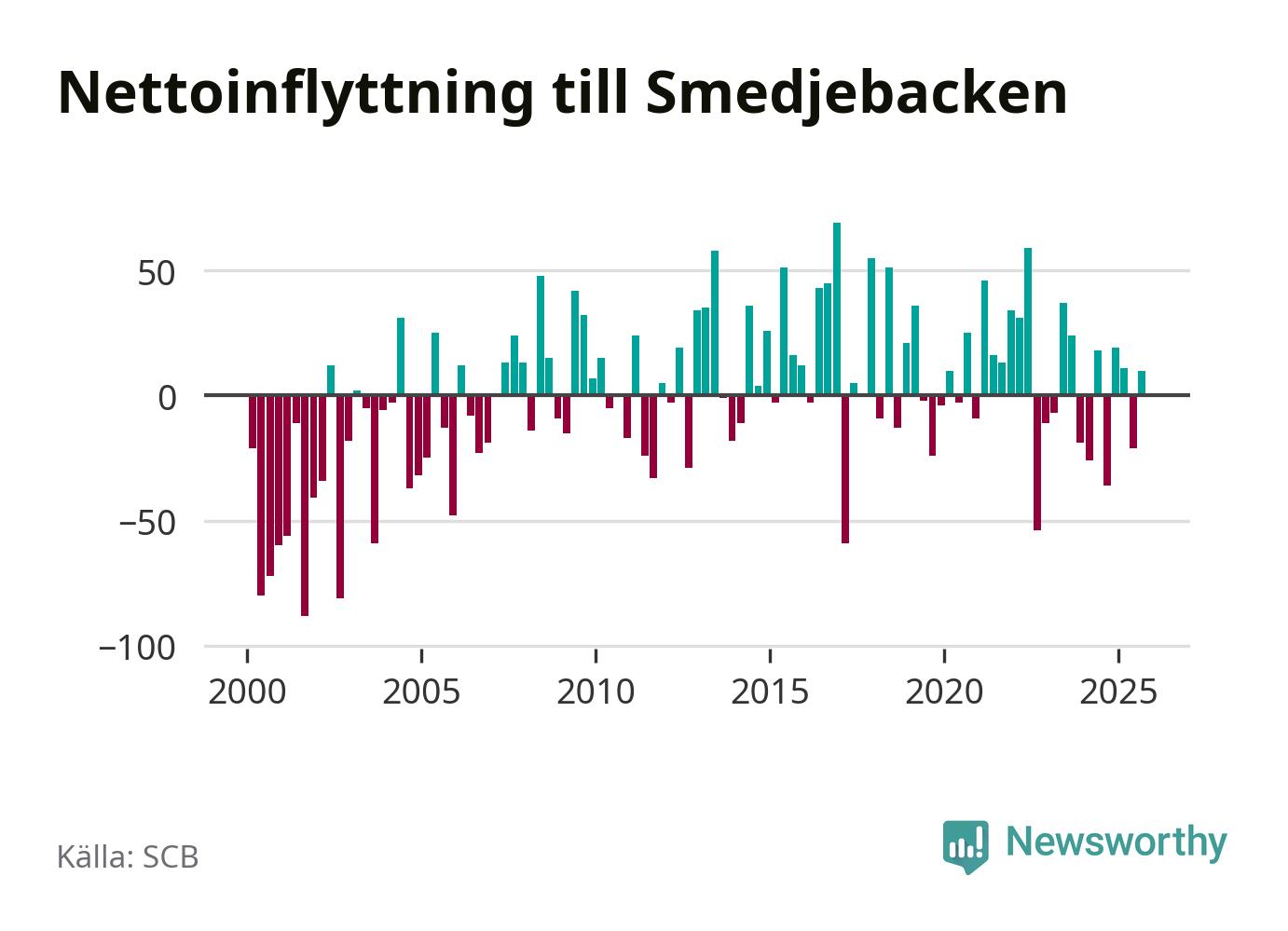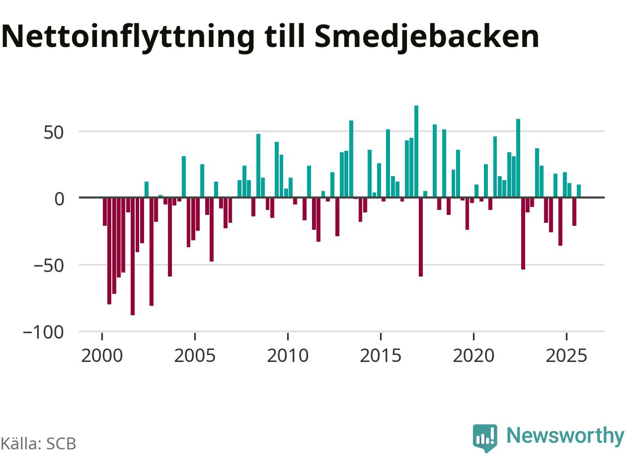 Under tredje kvartalet 2025 flyttade 178 personer till kommunen medan 168 personer flyttade därifrån. Det är historiskt sett en stor inflyttning under ett kvartal. Skillnaden mellan antalet in- och utflyttade är så liten att den lika gärna kan bero på SCB:s slumpmässiga brus. Sedan seklets början har Smedjebacken oftast haft ett positivt flyttnetto.