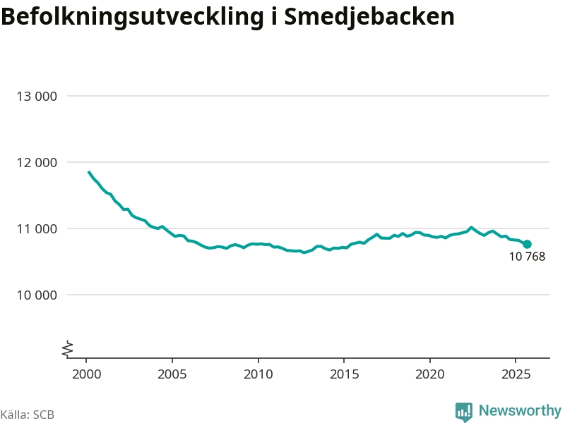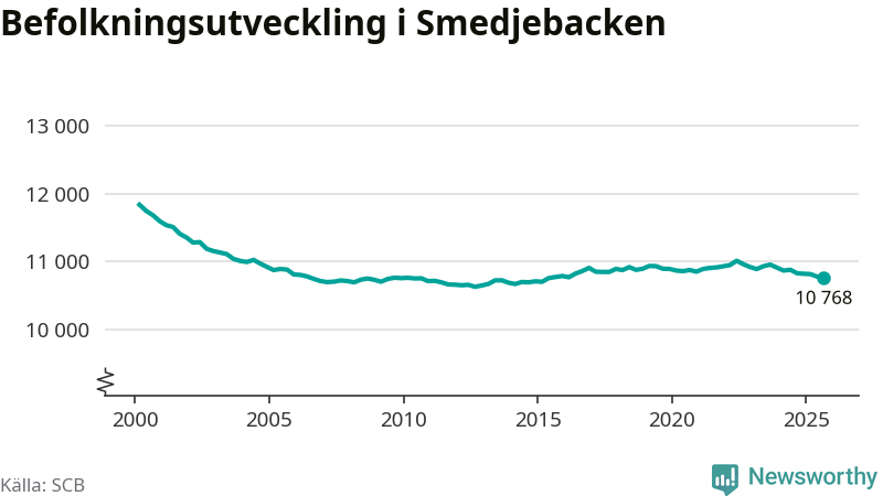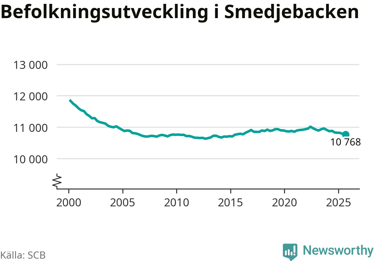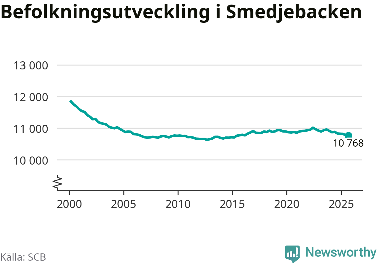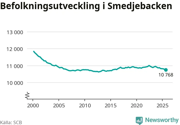 Jämfört med för ett år sedan har befolkningen i Smedjebacken minskat med drygt 60 personer – vilket motsvarar en nedgång på 0,6 procent. Sedan millennieskiftet har folkmängden minskat med runt 1 070 personer, eller 9 procent.