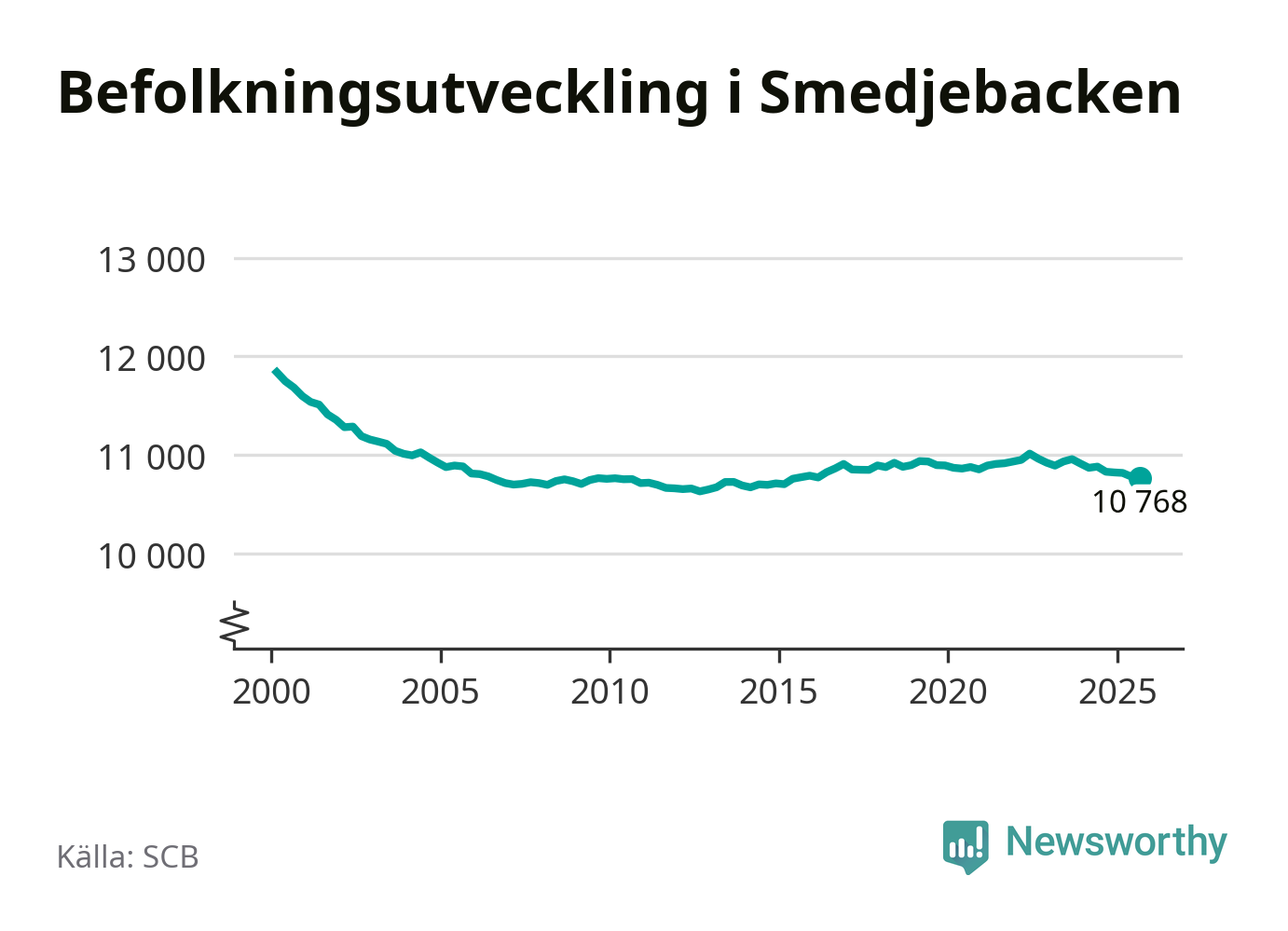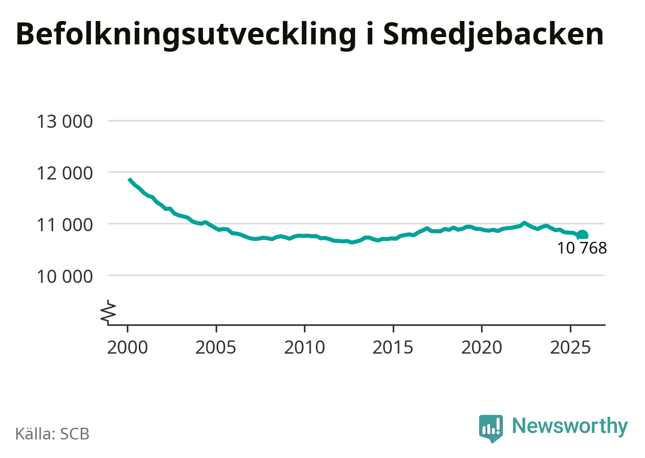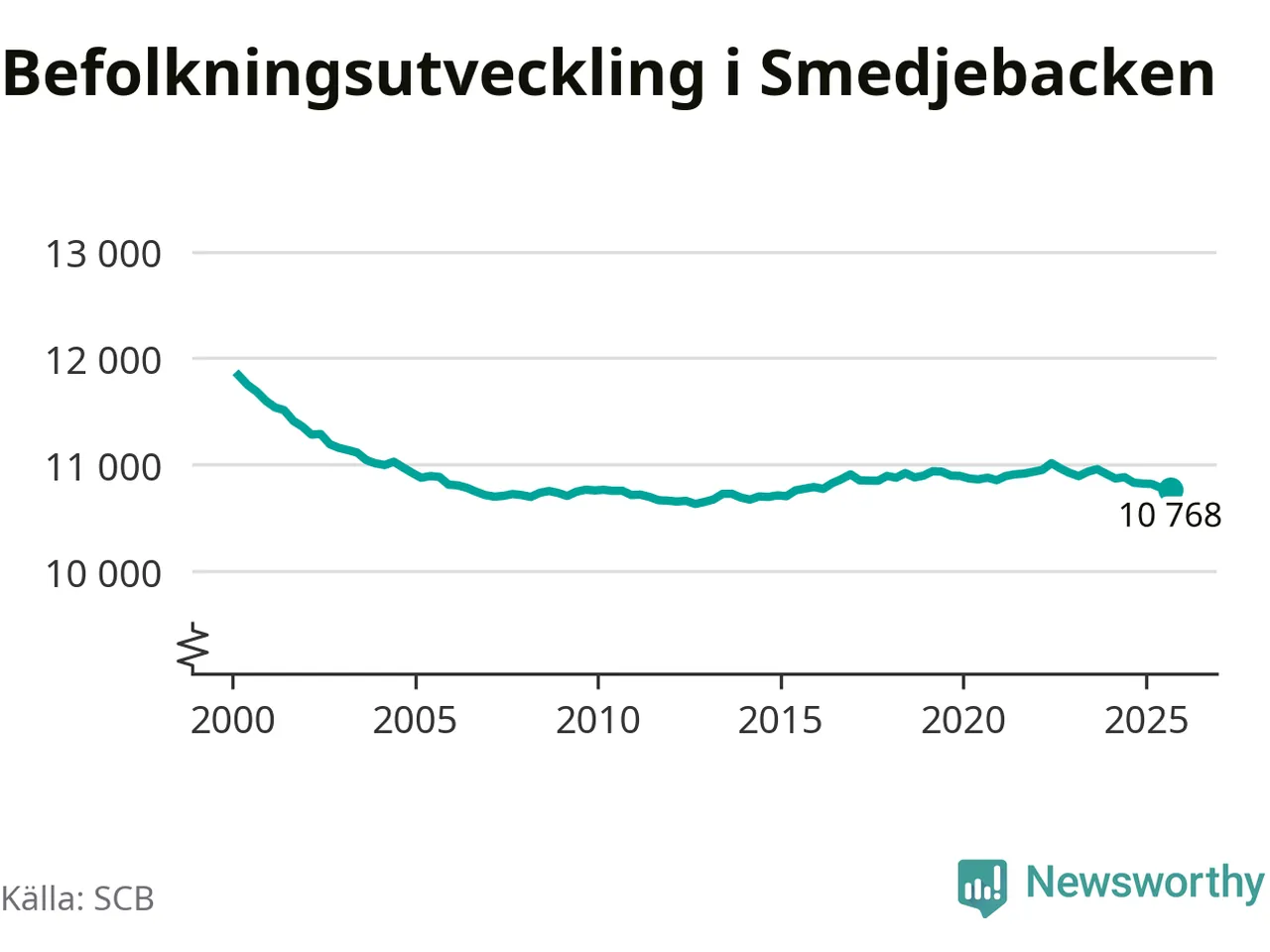 Jämfört med för ett år sedan har befolkningen i Smedjebacken minskat med drygt 60 personer – vilket motsvarar en nedgång på 0,6 procent. Sedan millennieskiftet har folkmängden minskat med runt 1 070 personer, eller 9 procent.