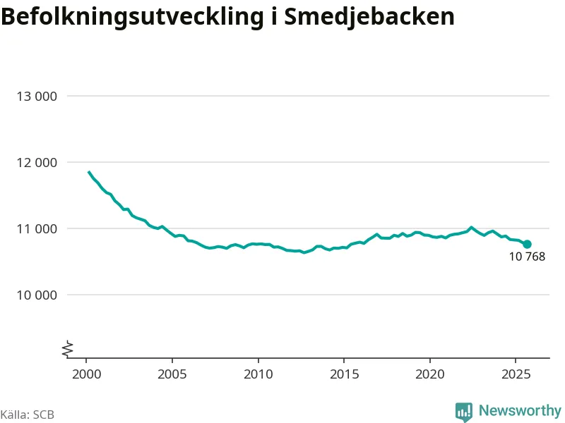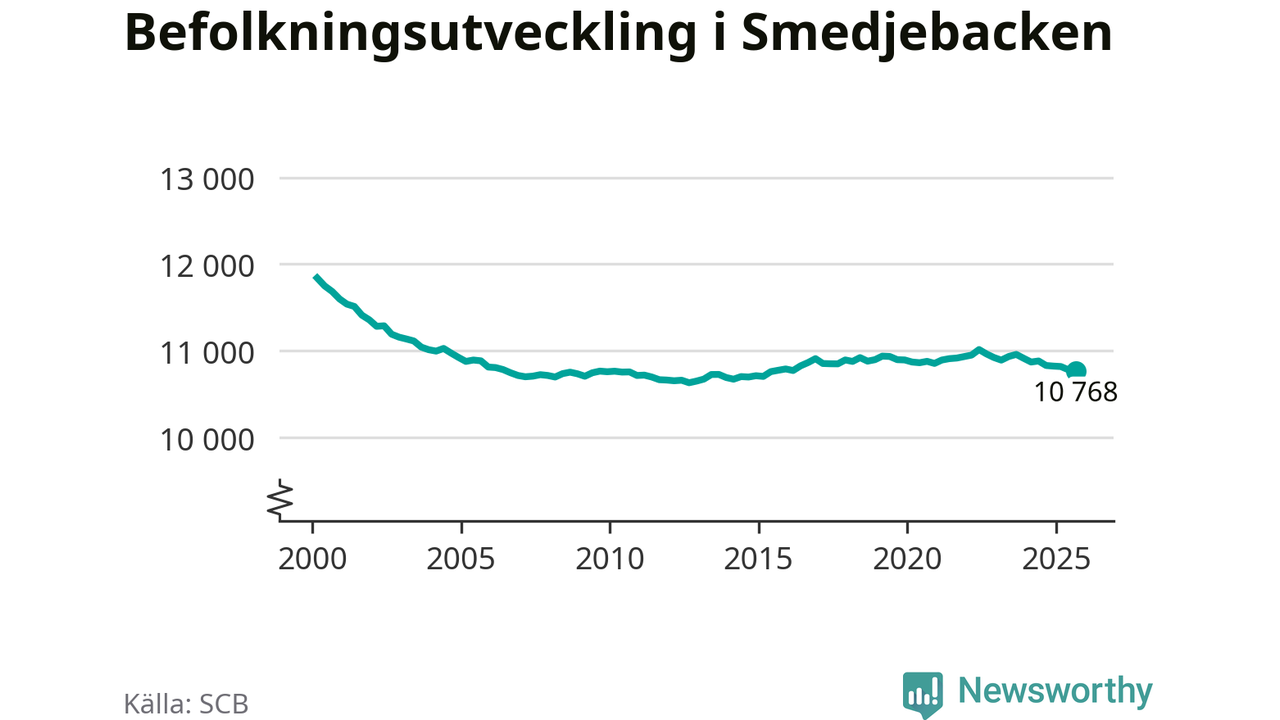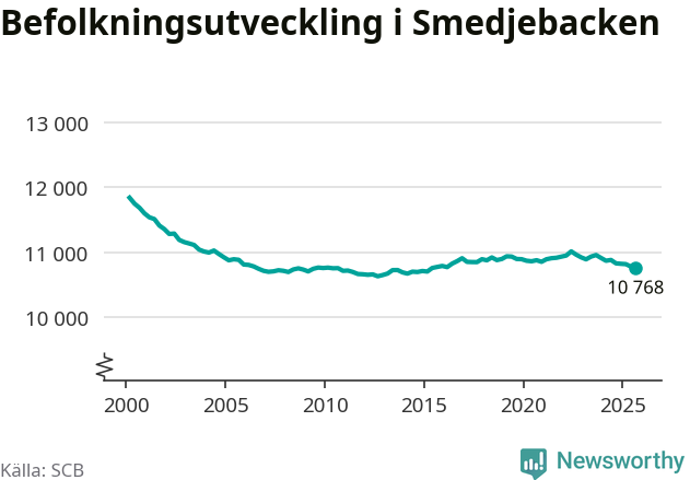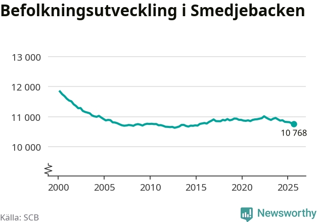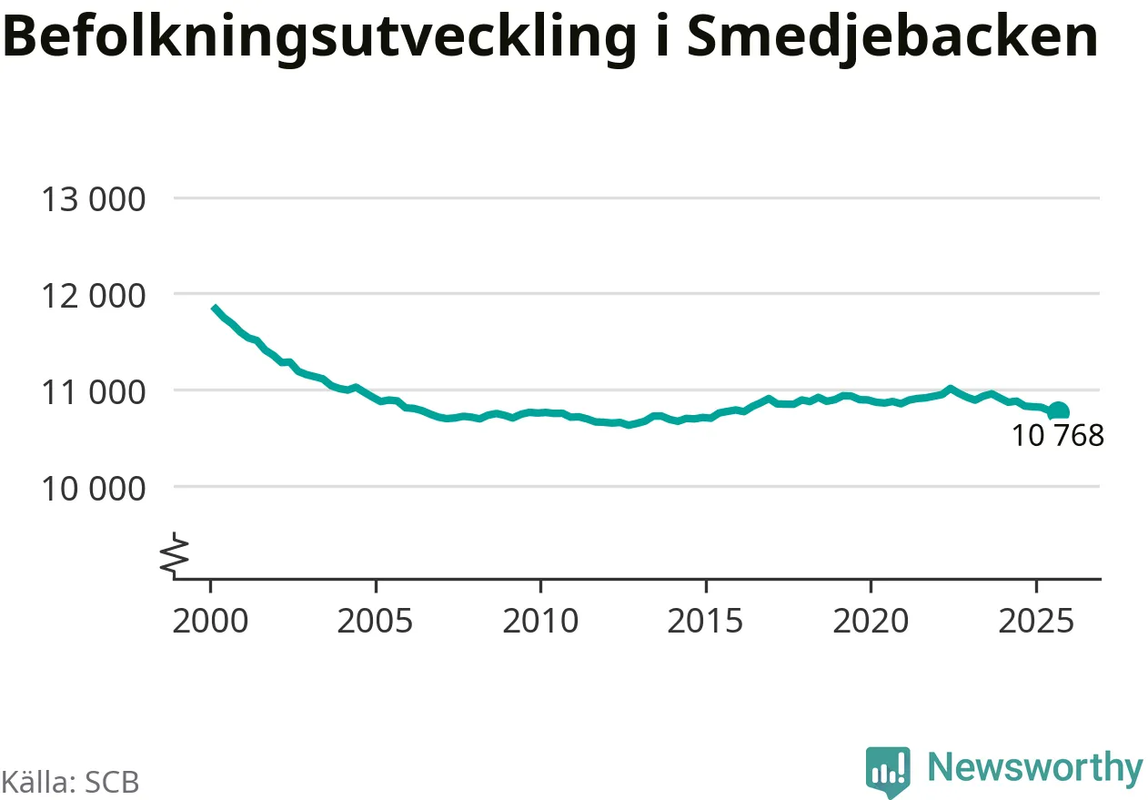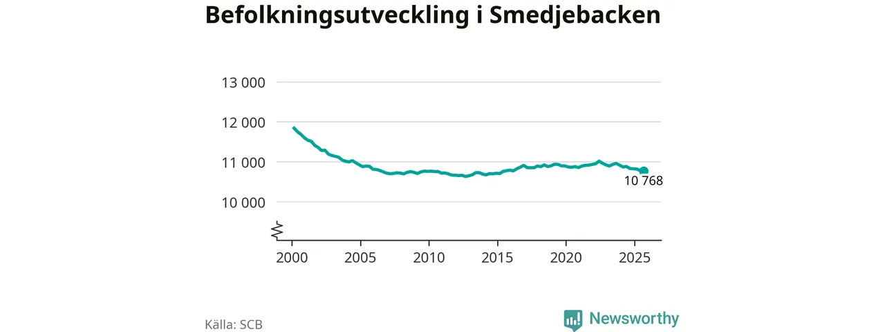 Befolkningen minskade i Smedjebackens kommun under det tredje kvartalet 2025. Den 30 september bodde enligt SCB:s senaste siffror 10 768 personer i kommunen, vilket är 13 färre än i slutet av andra kvartalet.