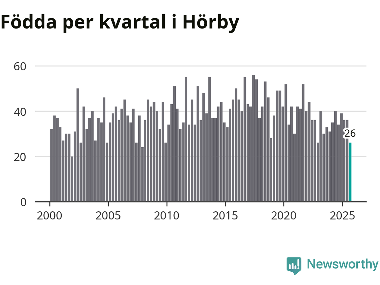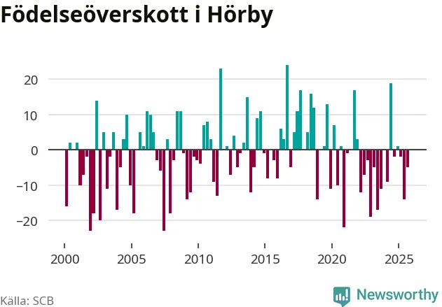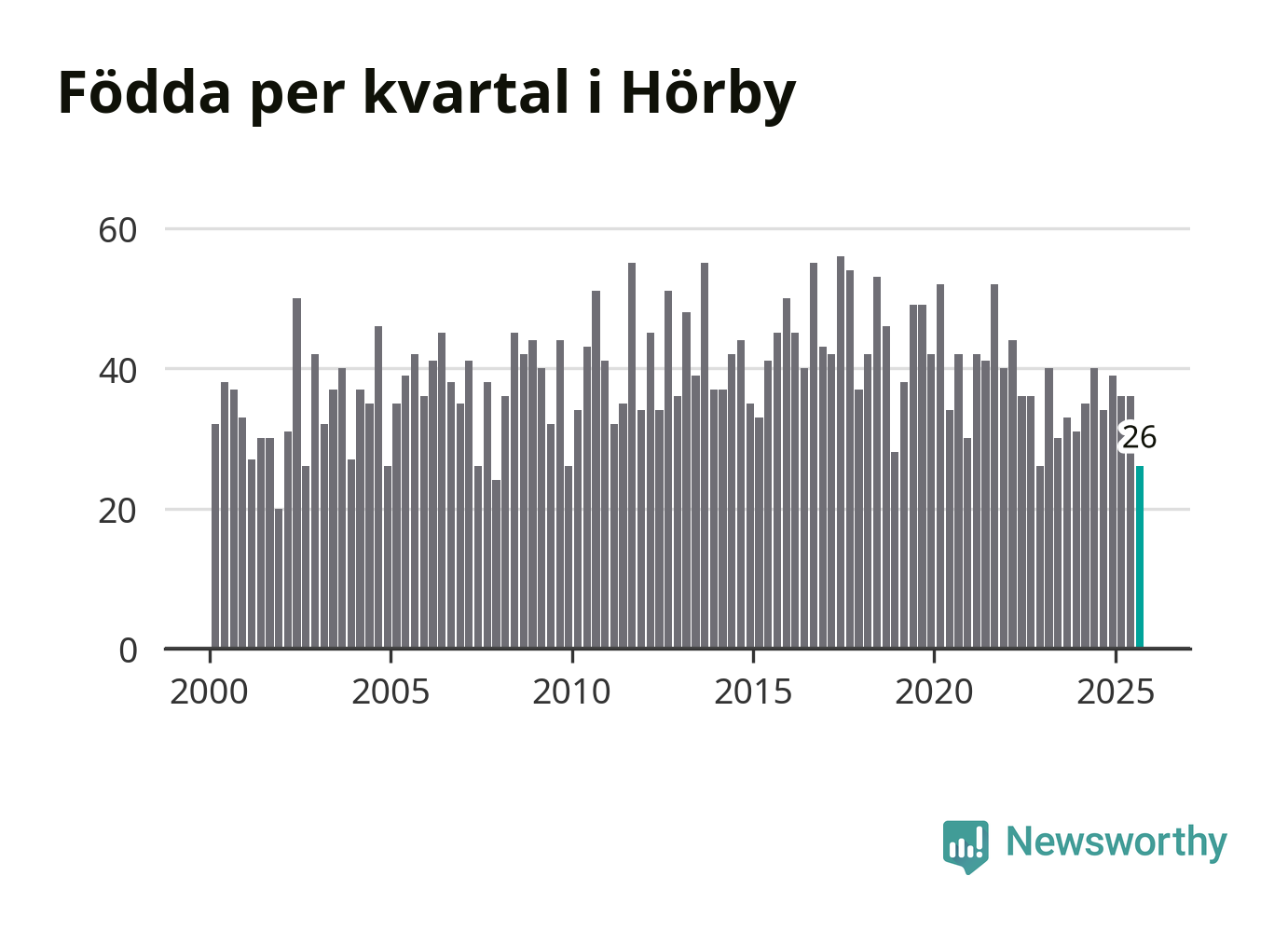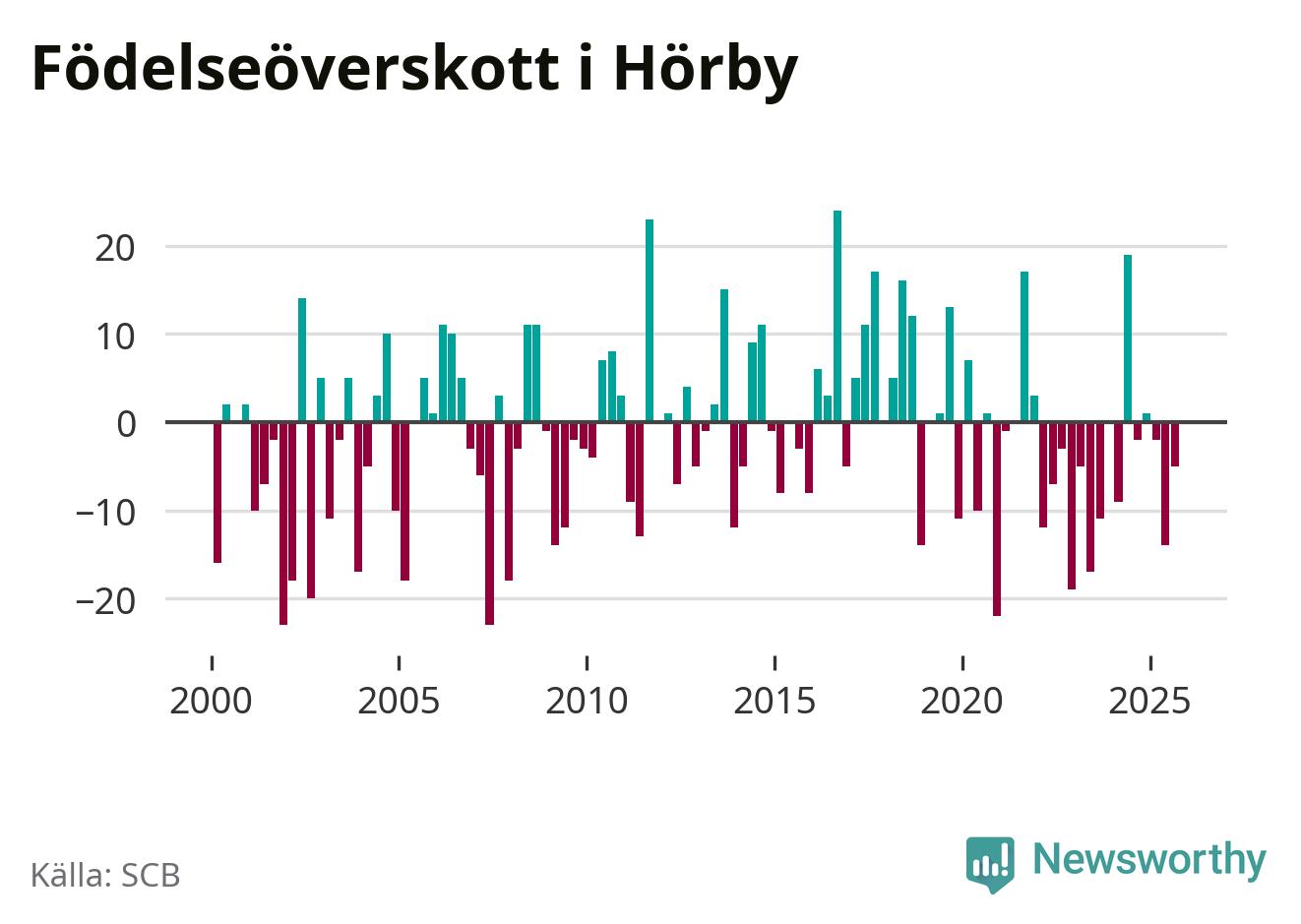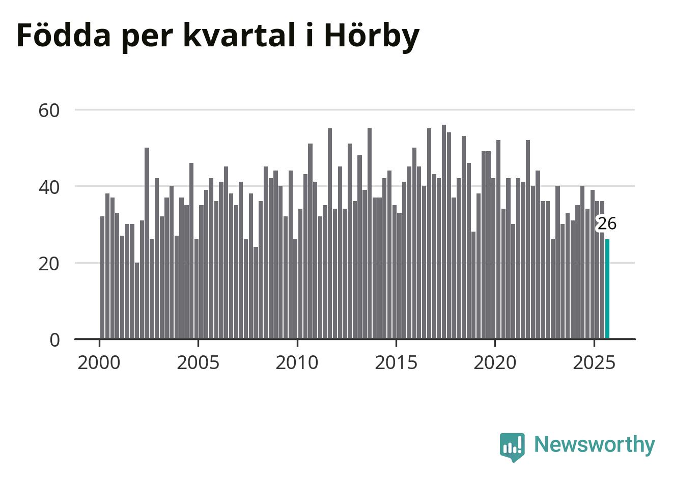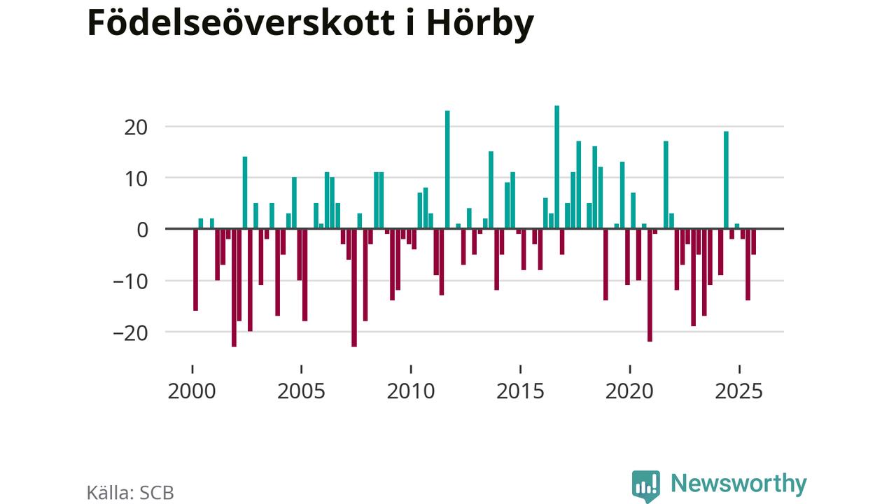 Enligt SCB:s siffror föddes 26 barn i Hörby under det senaste kvartalet. Samtidigt avled 31 personer. Skillnaden mellan antal födda och döda är så liten att det inte går att säga om det beror på något annat än SCB:s röjandeskydd. Kommunen har historiskt sett haft ungefär lika många kvartal med positivt födelsenetto som negativt.