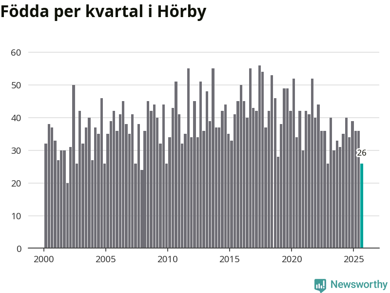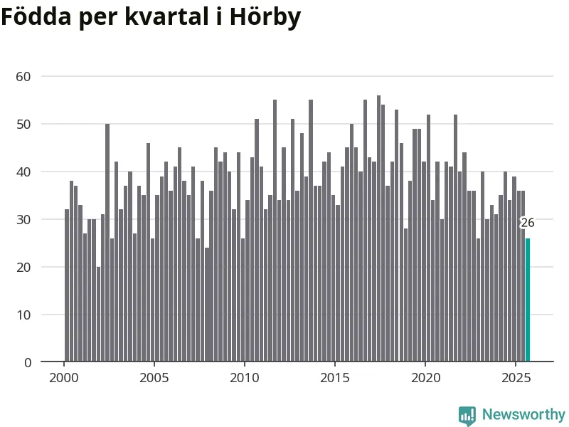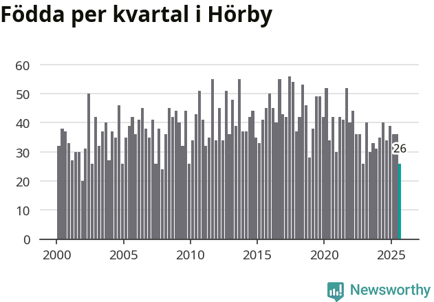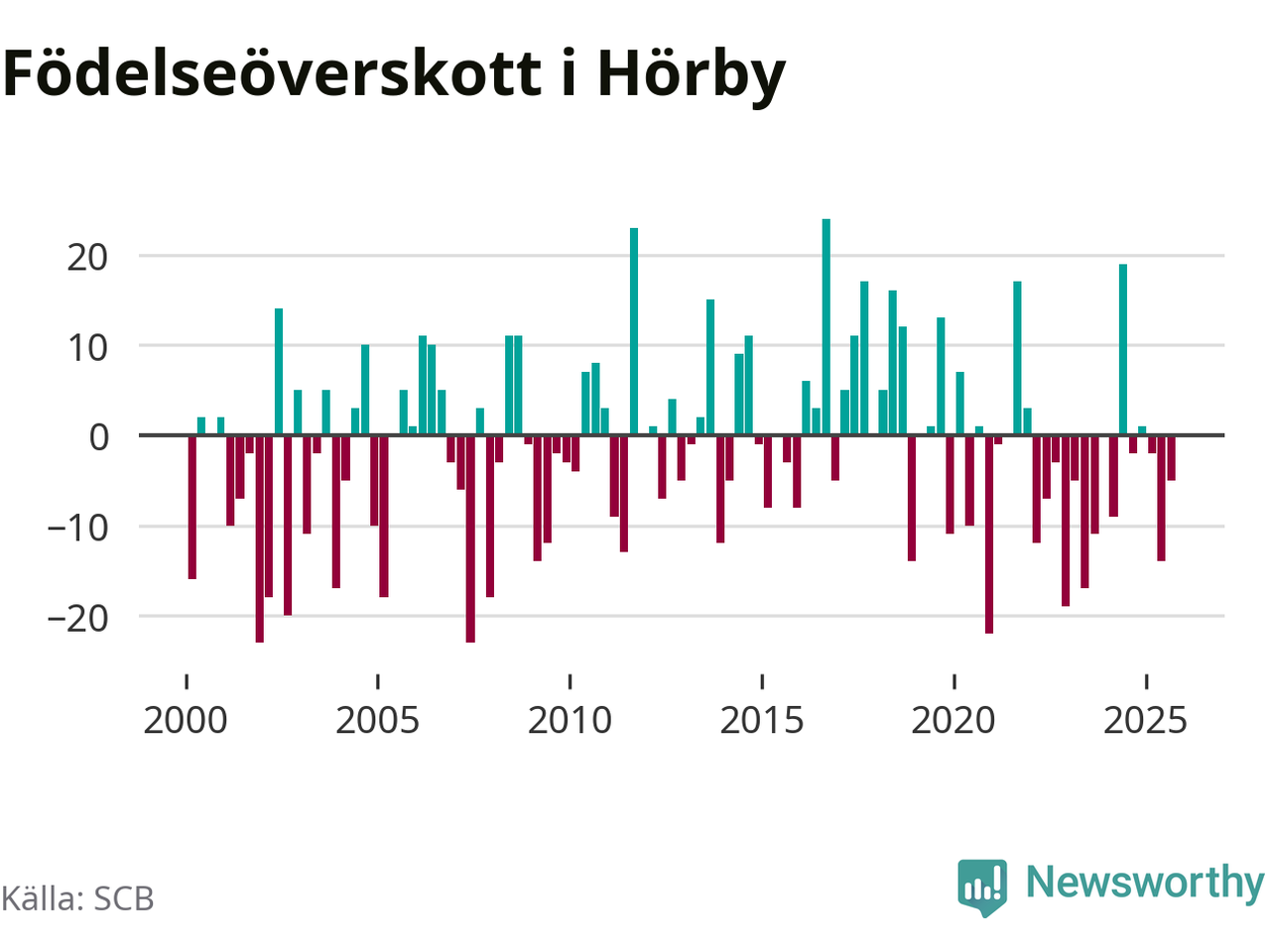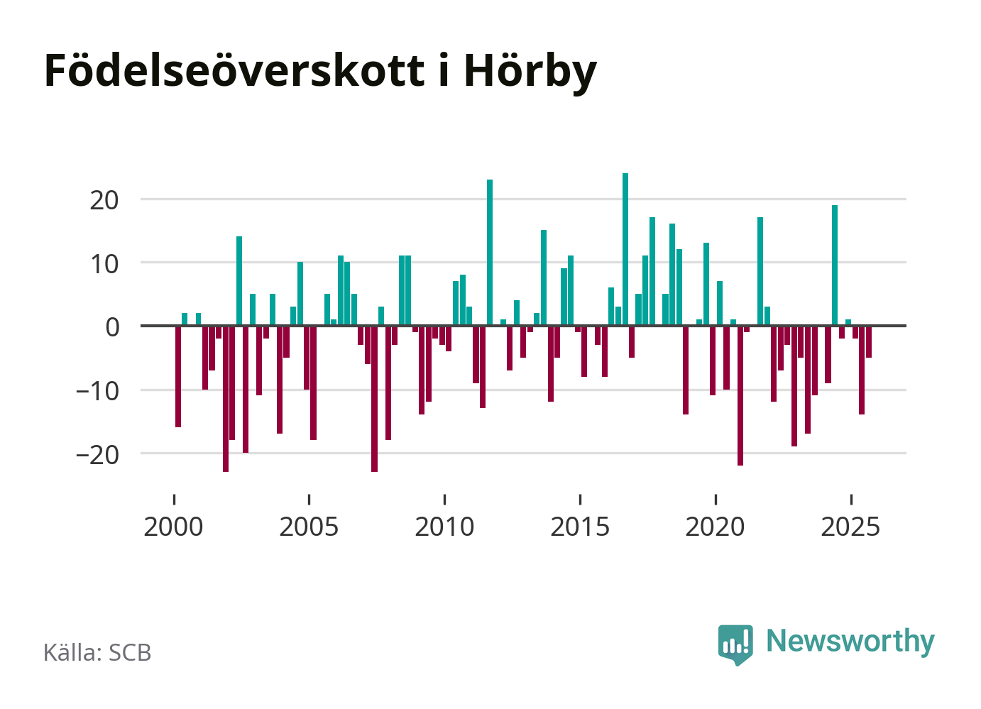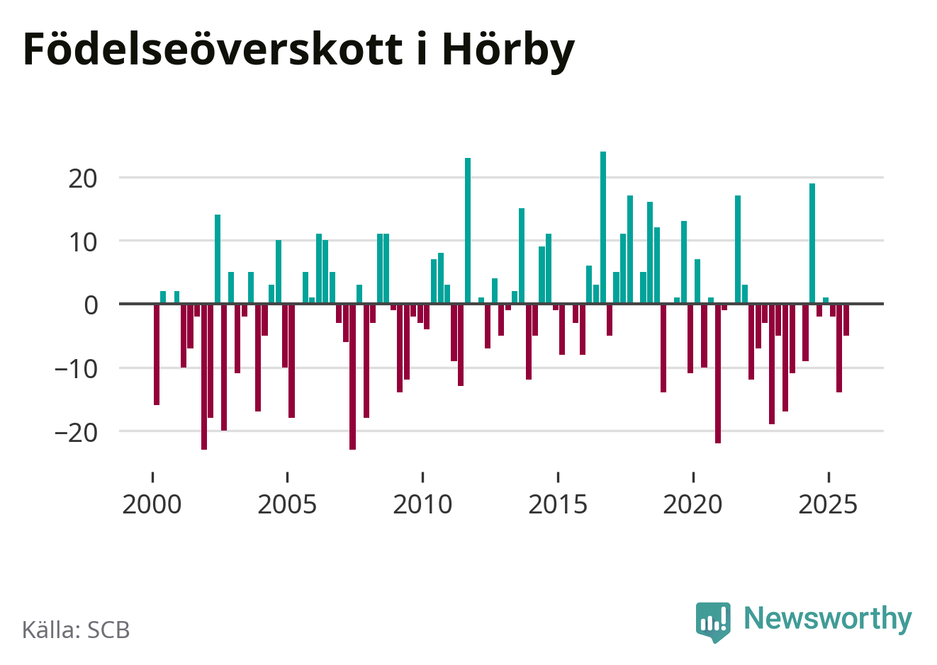 Enligt SCB:s siffror föddes 26 barn i Hörby under det senaste kvartalet. Samtidigt avled 31 personer. Skillnaden mellan antal födda och döda är så liten att det inte går att säga om det beror på något annat än SCB:s röjandeskydd. Kommunen har historiskt sett haft ungefär lika många kvartal med positivt födelsenetto som negativt.