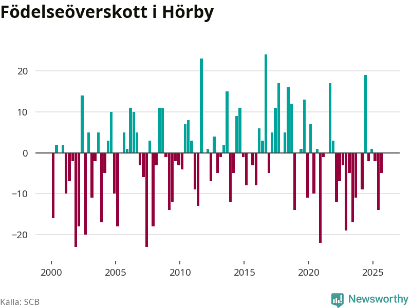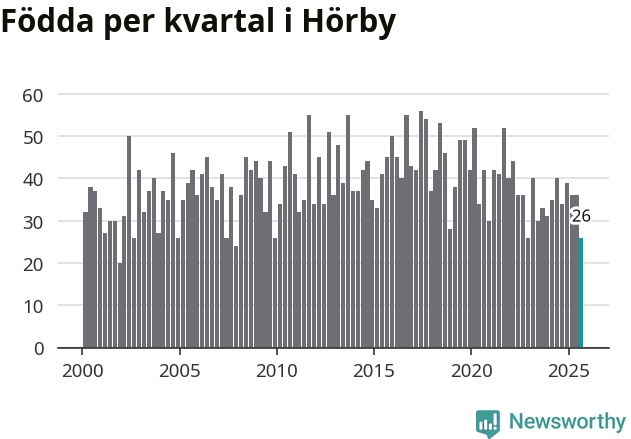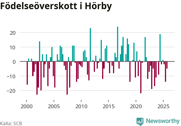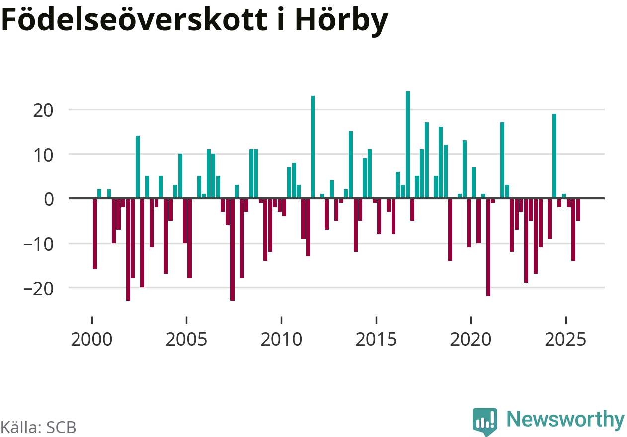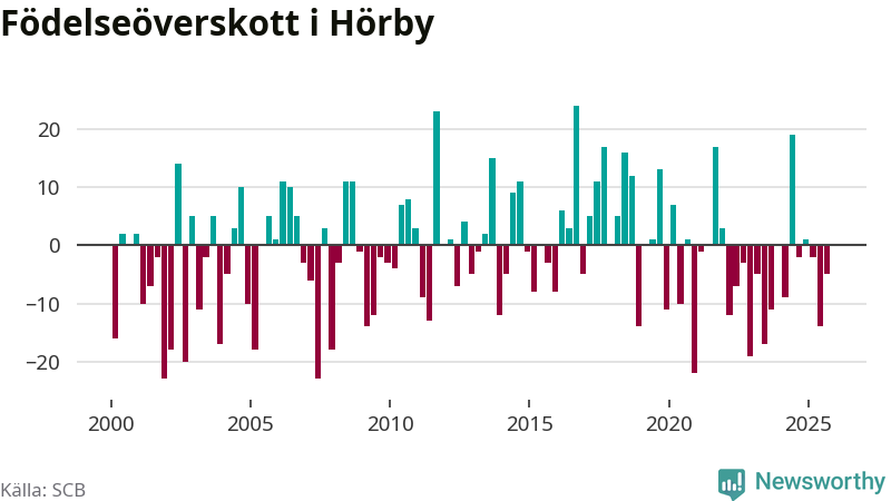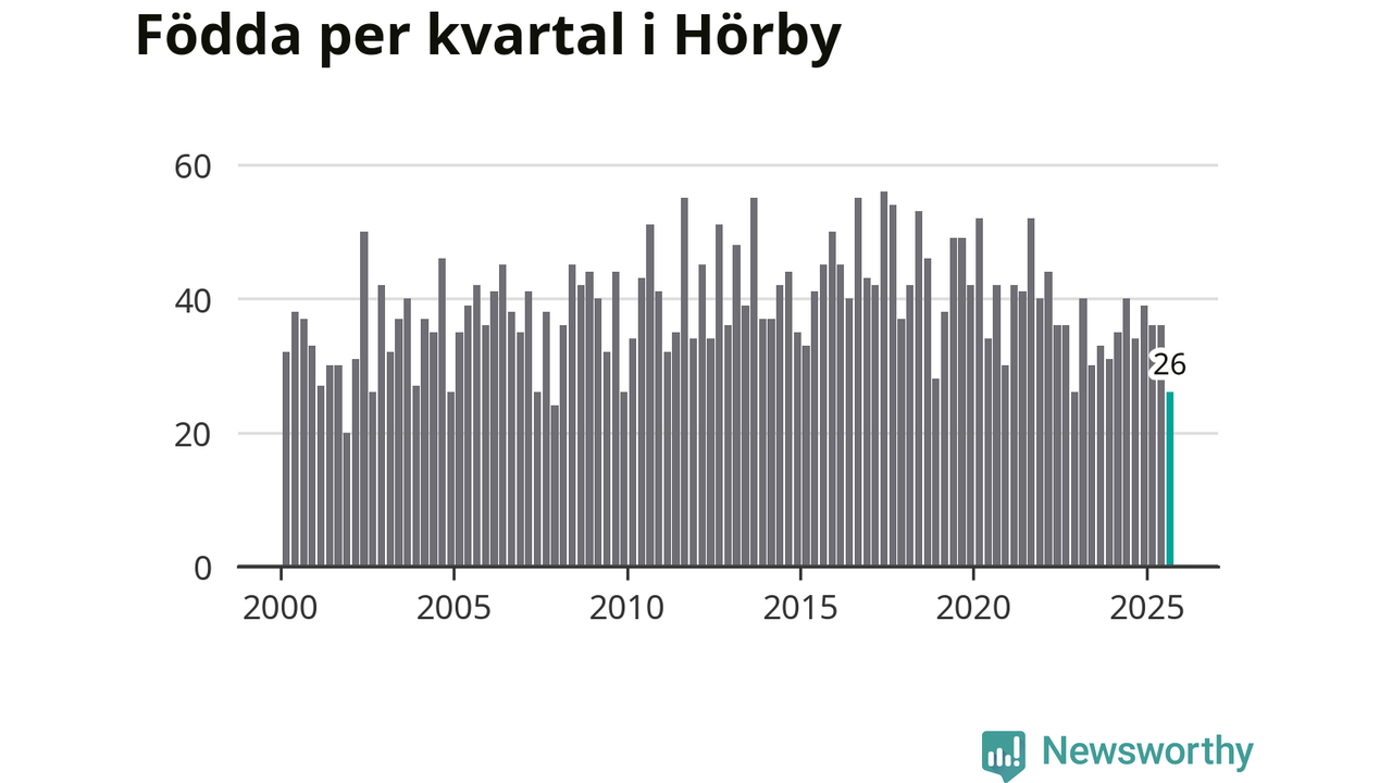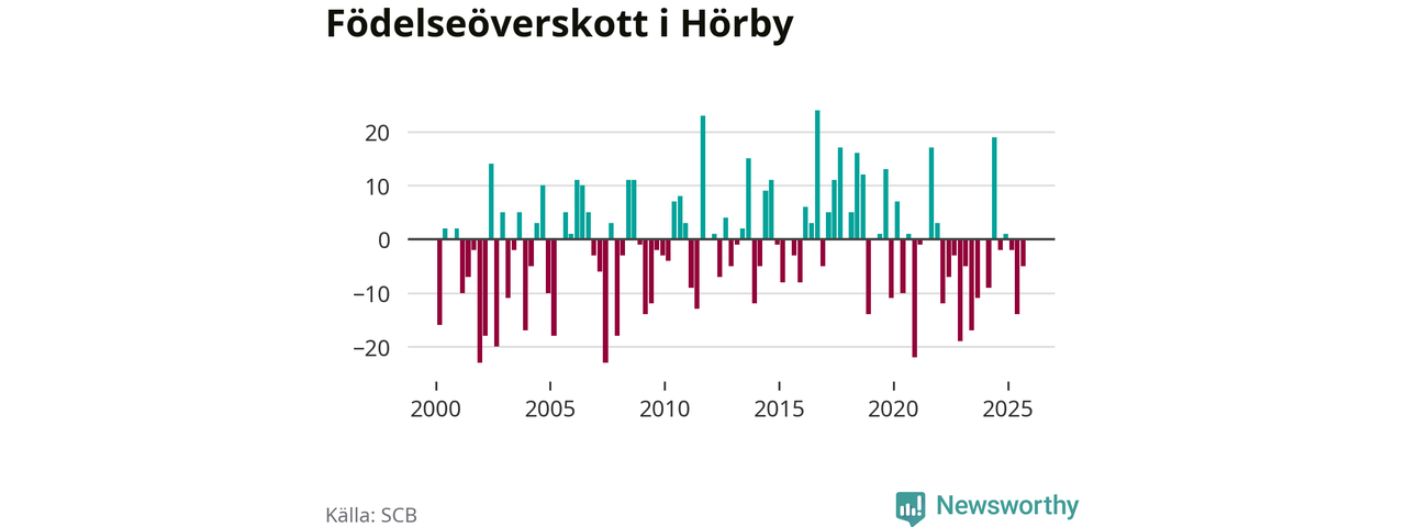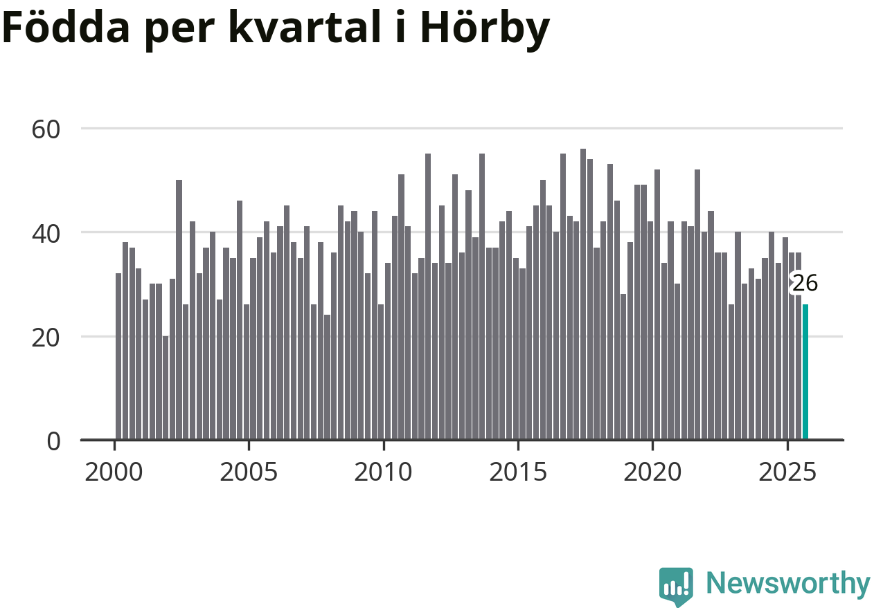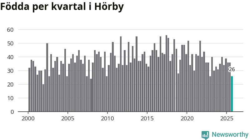 Enligt SCB:s siffror föddes 26 barn i Hörby under det senaste kvartalet. Samtidigt avled 31 personer. Skillnaden mellan antal födda och döda är så liten att det inte går att säga om det beror på något annat än SCB:s röjandeskydd. Kommunen har historiskt sett haft ungefär lika många kvartal med positivt födelsenetto som negativt.