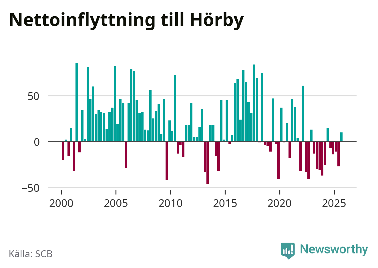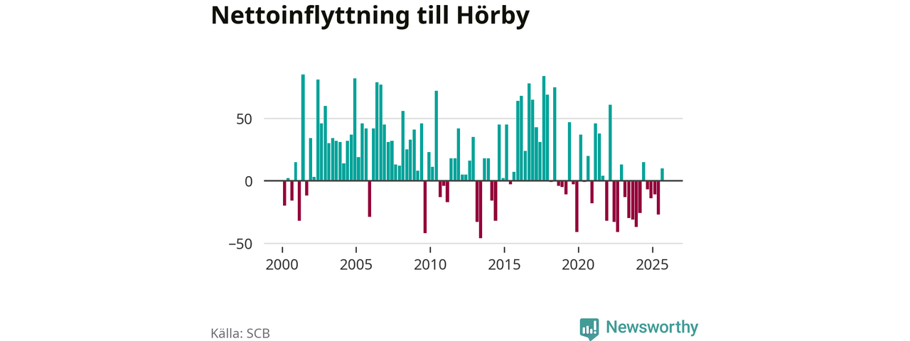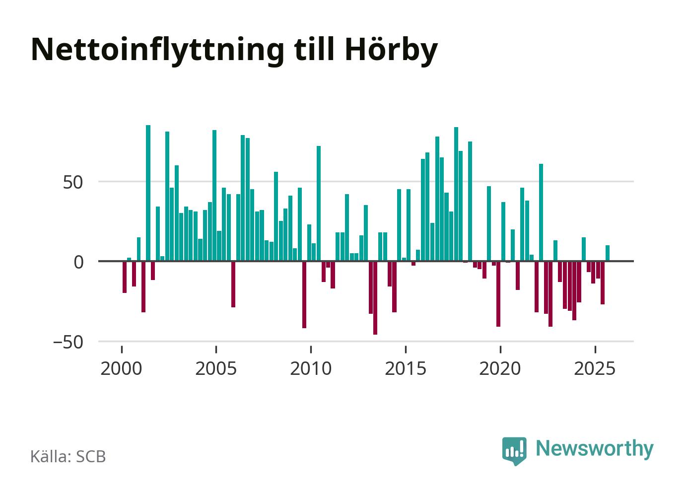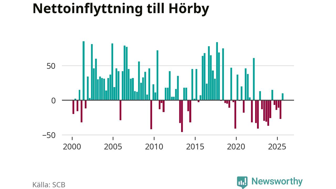 Under tredje kvartalet 2025 flyttade 259 personer till kommunen medan 249 personer flyttade därifrån. Skillnaden mellan antalet in- och utflyttade är så liten att den lika gärna kan bero på SCB:s slumpmässiga brus. Sedan seklets början har Hörby haft ungefär lika många kvartal med positivt flyttnetto som negativt.