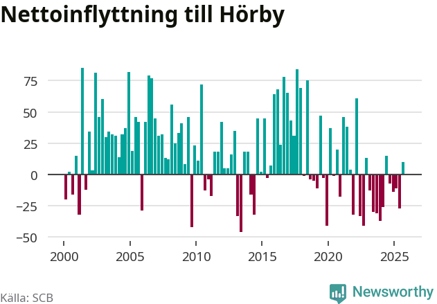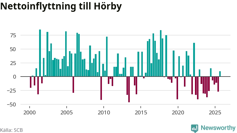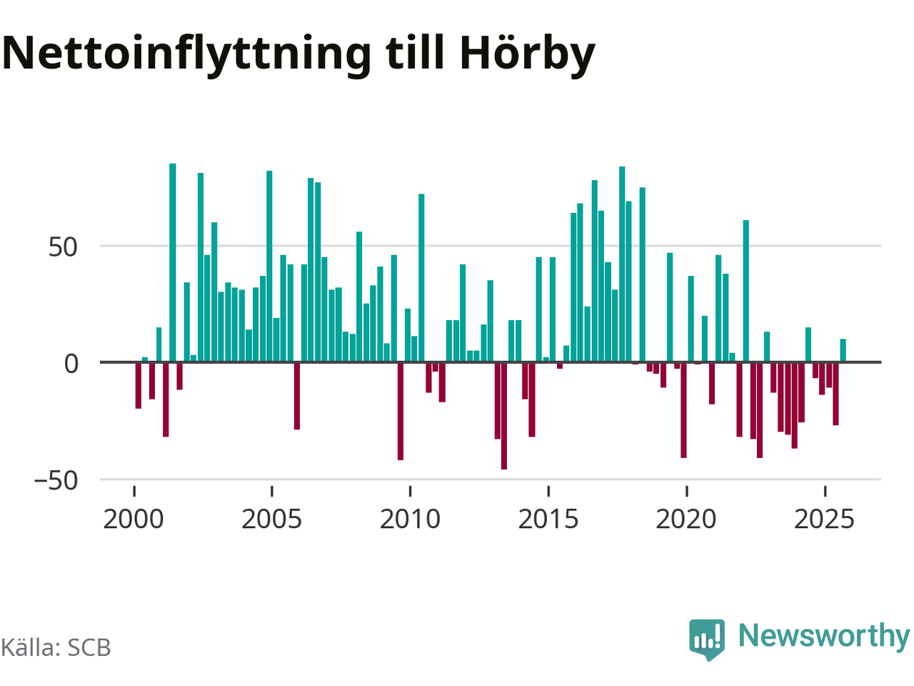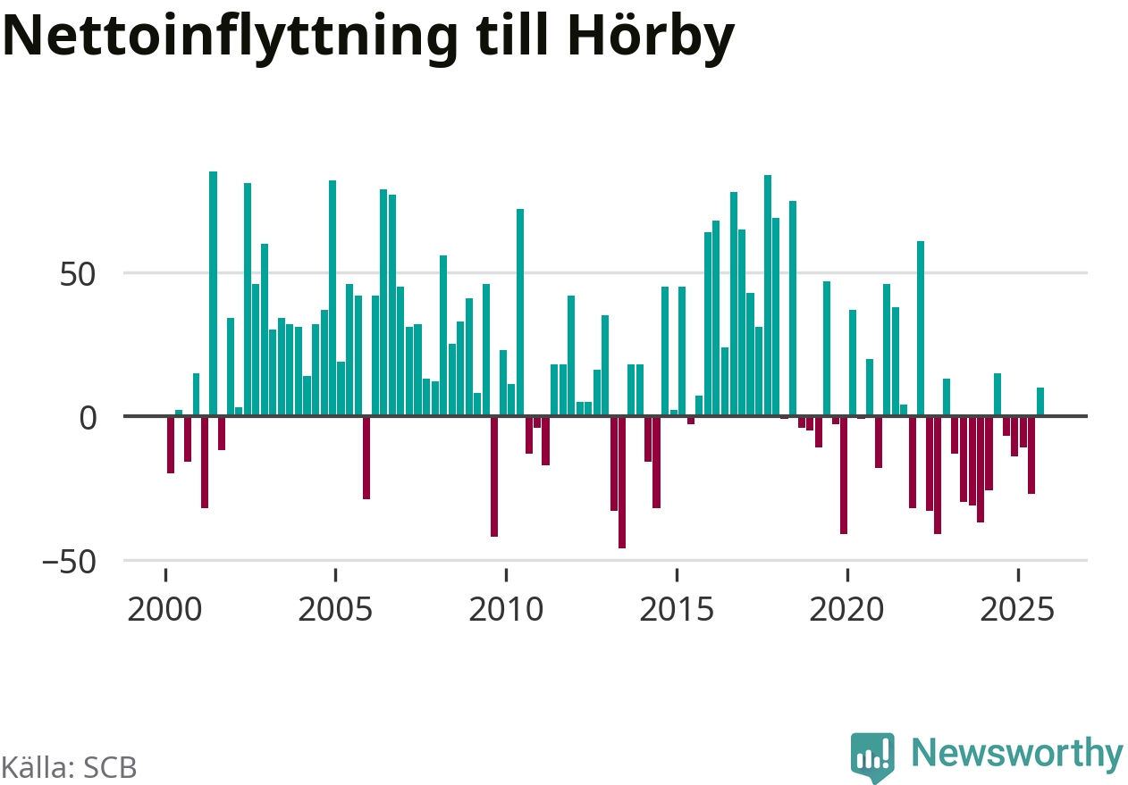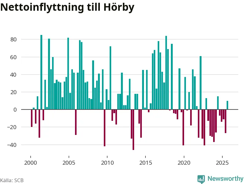 Under tredje kvartalet 2025 flyttade 259 personer till kommunen medan 249 personer flyttade därifrån. Skillnaden mellan antalet in- och utflyttade är så liten att den lika gärna kan bero på SCB:s slumpmässiga brus. Sedan seklets början har Hörby haft ungefär lika många kvartal med positivt flyttnetto som negativt.