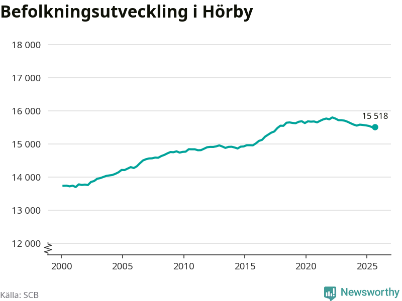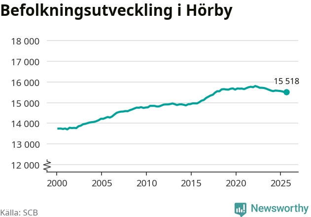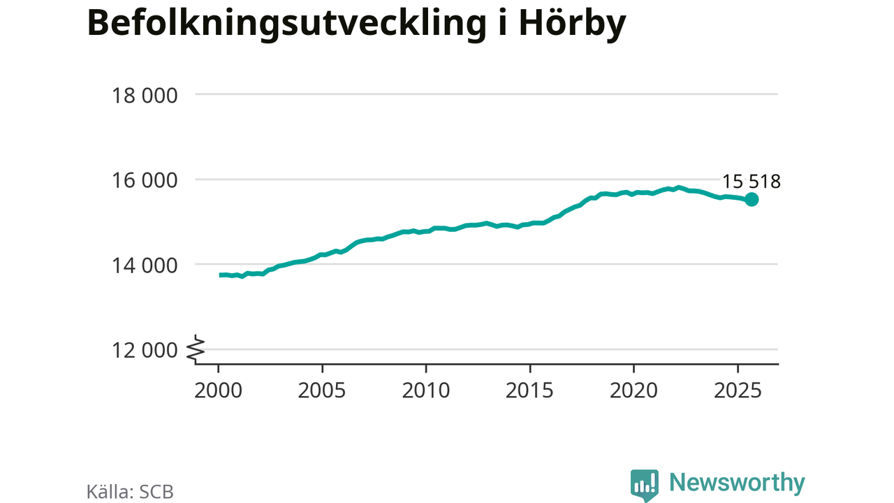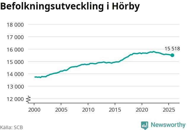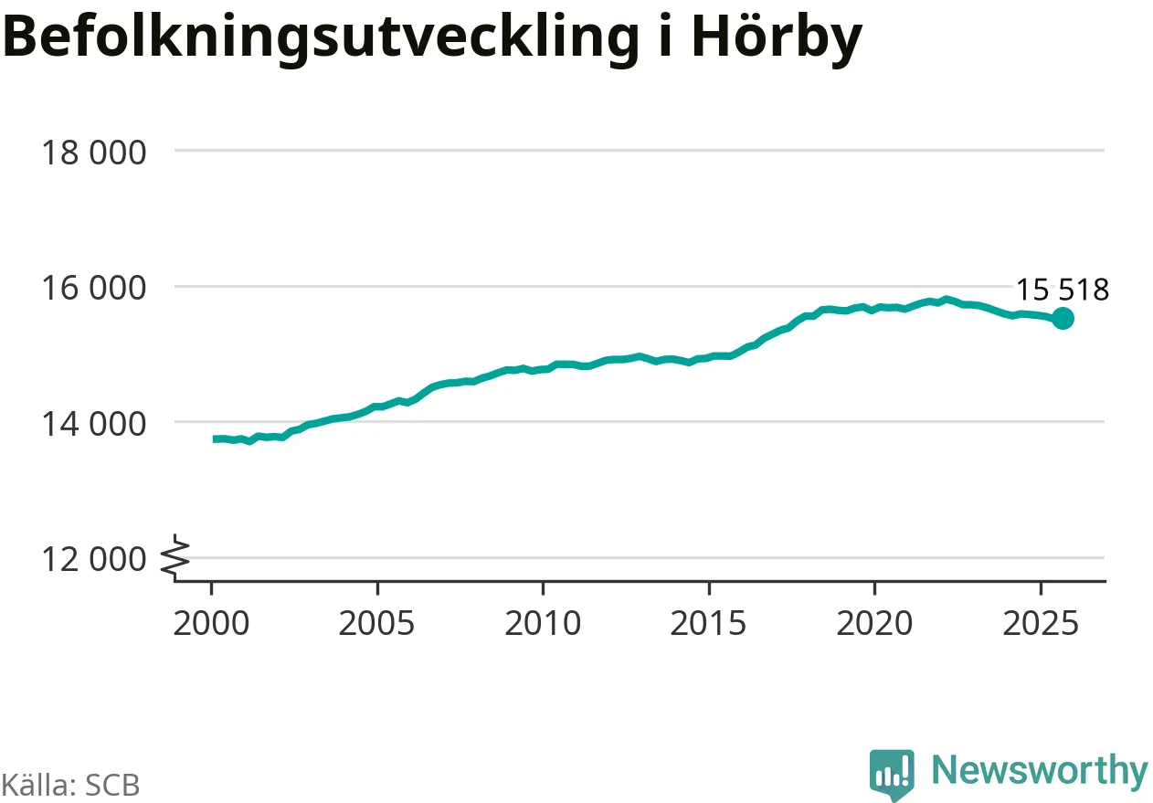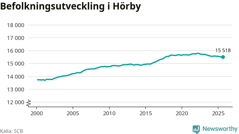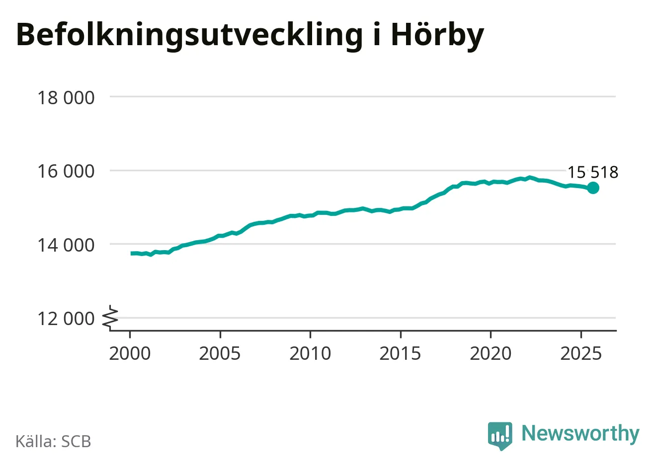 I slutet av tredje kvartalet 2025 bodde 15 518 personer i Hörby kommun, enligt SCB:s senaste siffror. Det är knappt 60 personer färre än vid samma tidpunkt förra året.