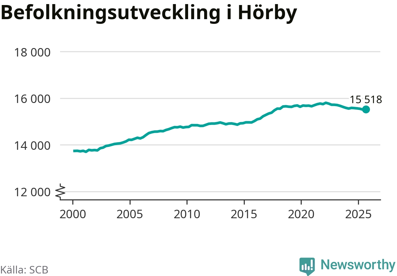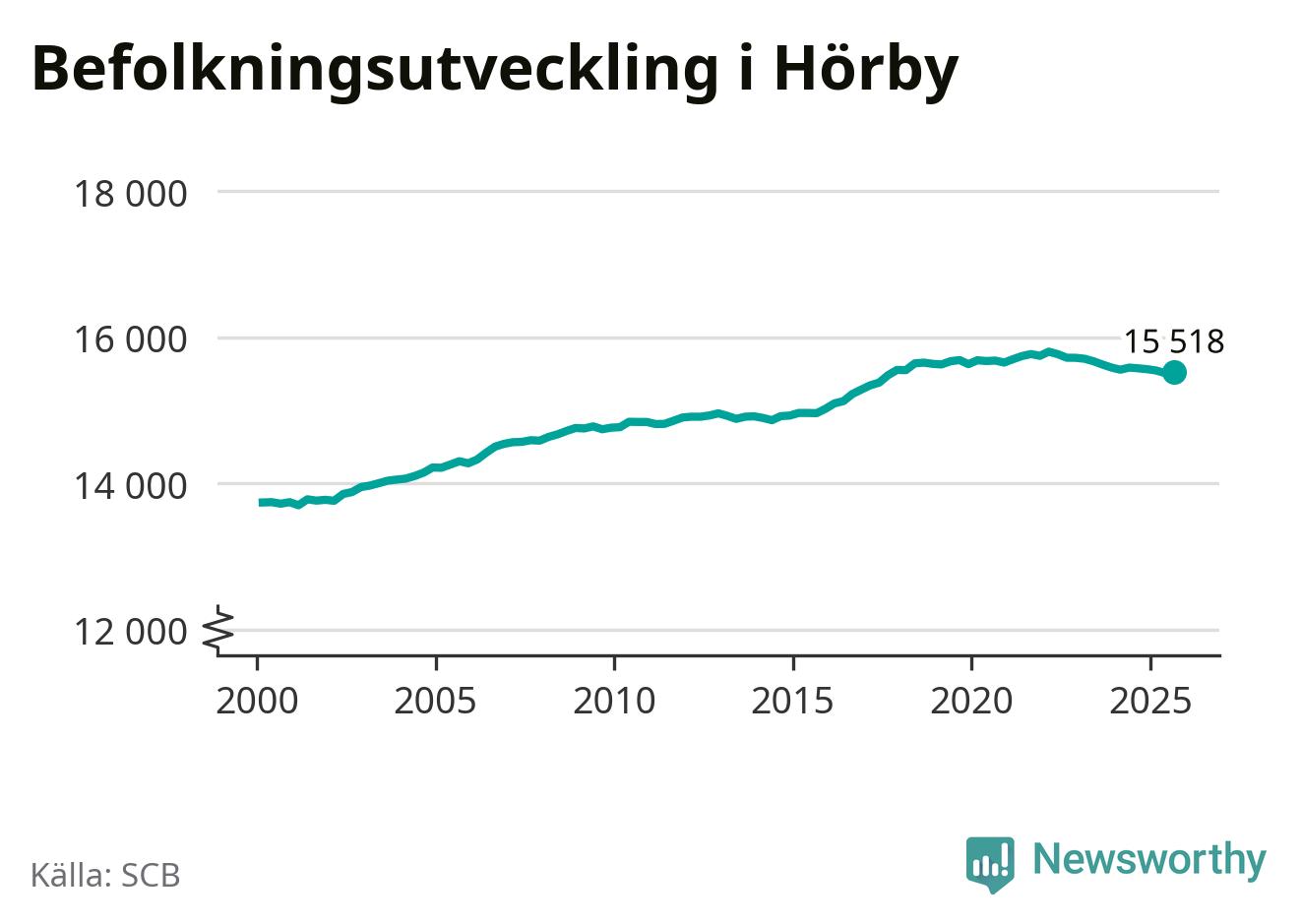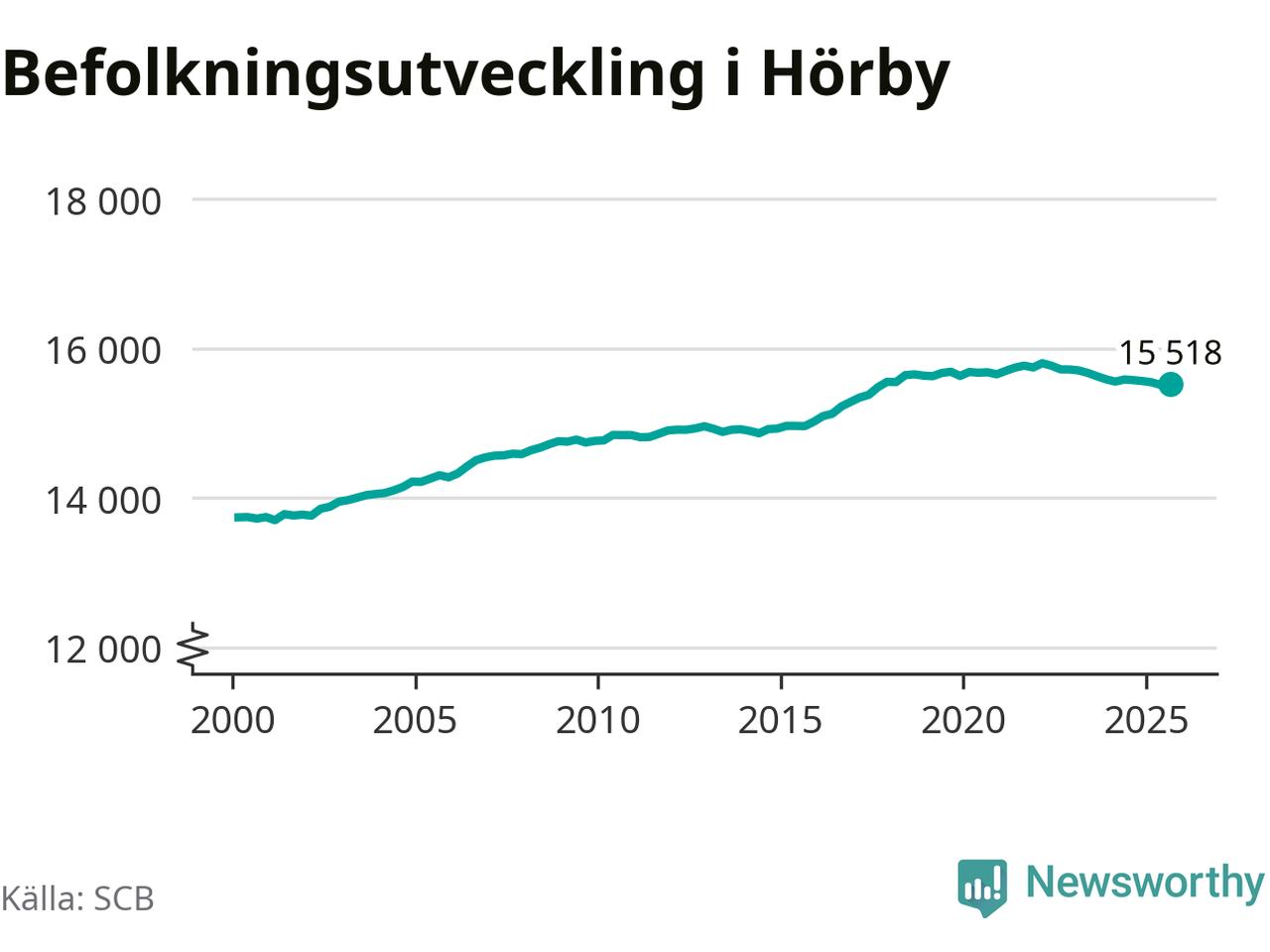 Jämfört med för ett år sedan har befolkningen i Hörby minskat med knappt 60 personer. Sedan millennieskiftet har folkmängden ökat med 1 780 personer, eller 13 procent.