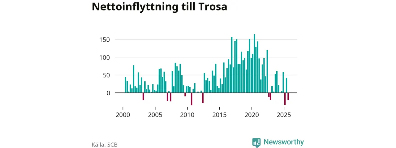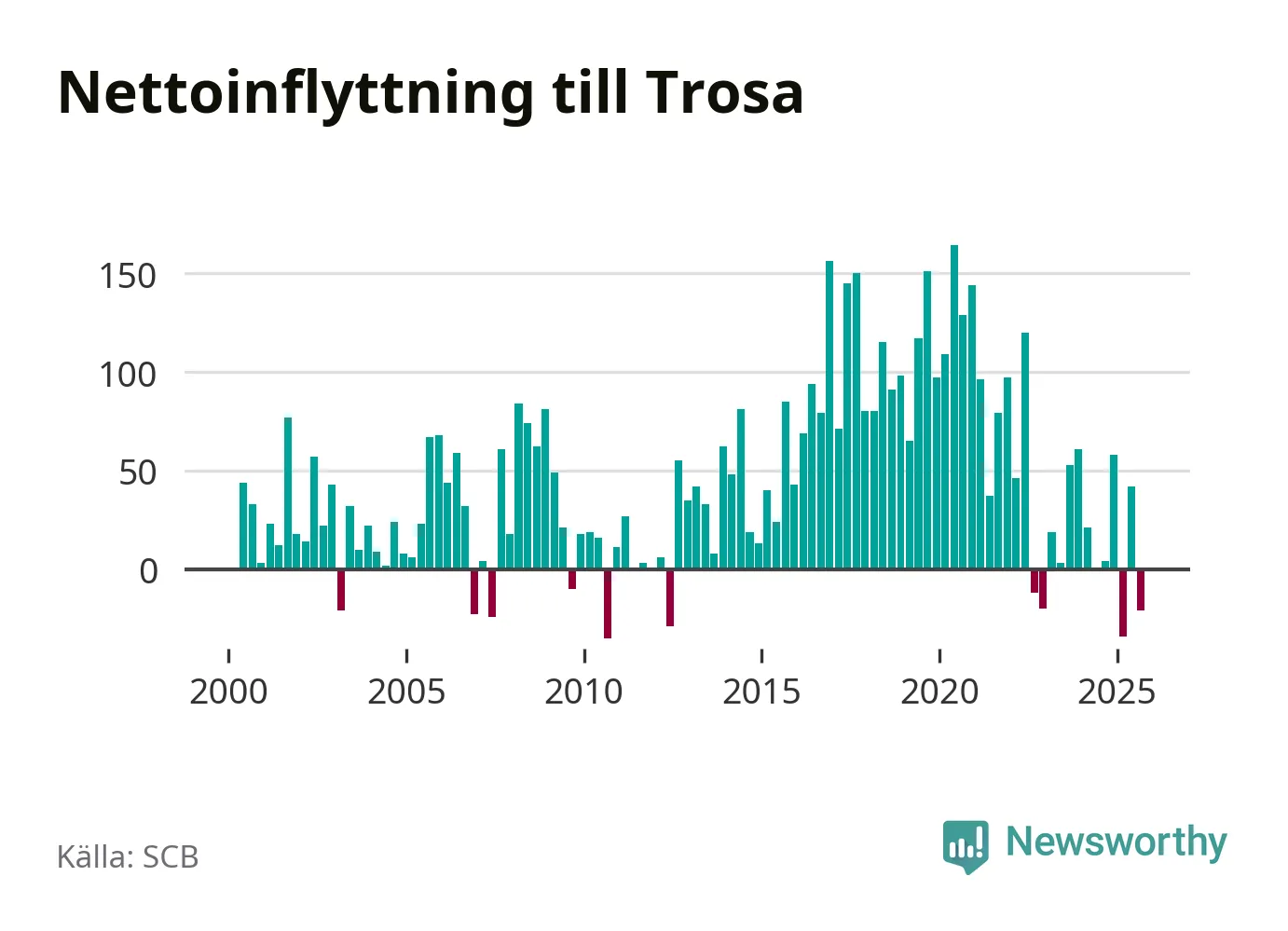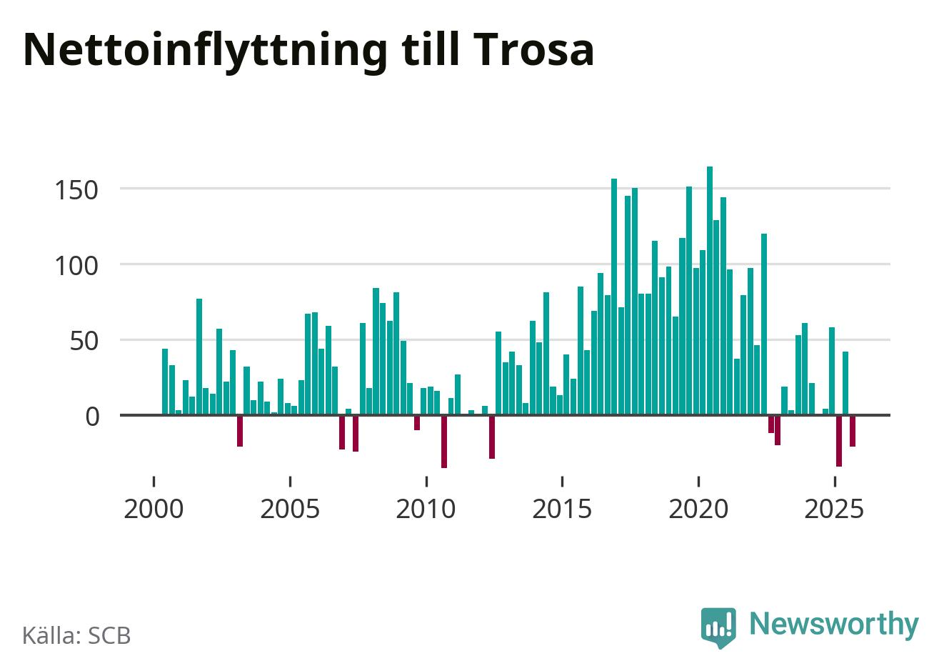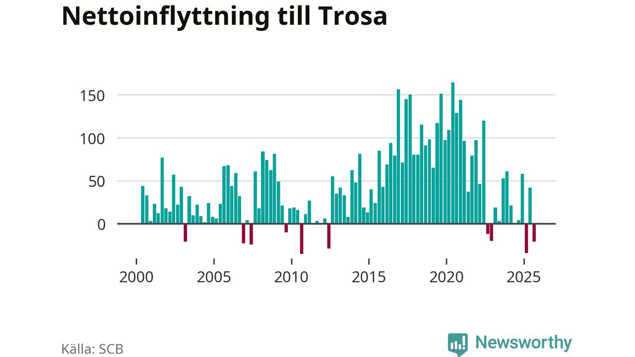Under tredje kvartalet 2025 flyttade 232 personer till kommunen medan 253 personer flyttade därifrån. Det är historiskt sett en stor utflyttning under ett kvartal. Sedan seklets början har Trosa haft ett positivt flyttnetto under nästan alla kvartal.
