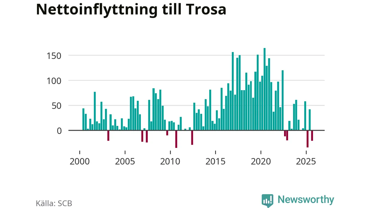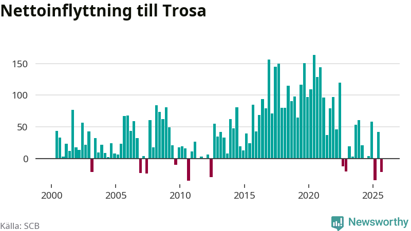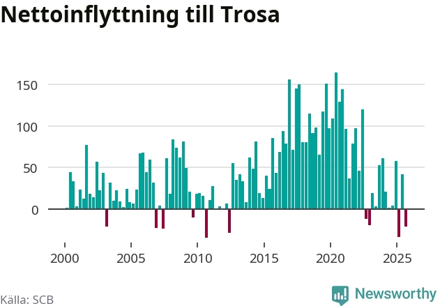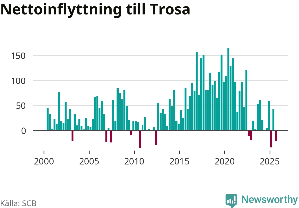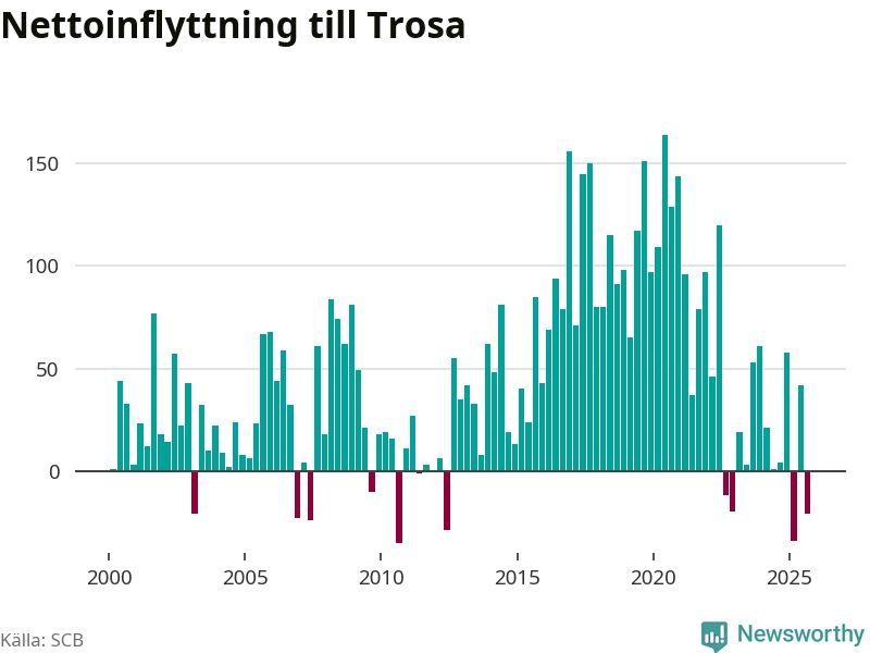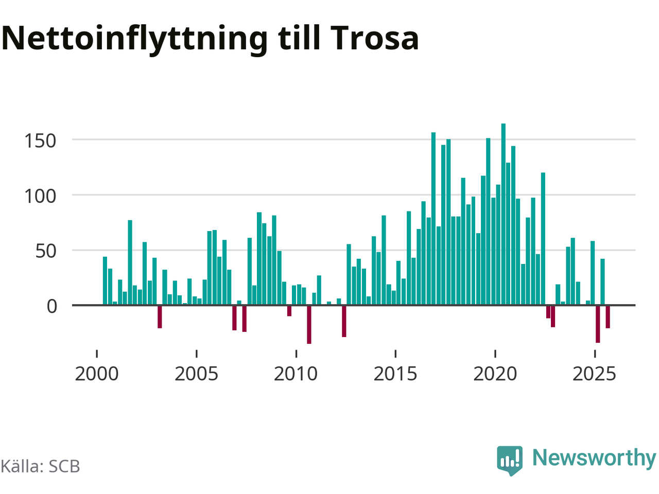 Under tredje kvartalet 2025 flyttade 232 personer till kommunen medan 253 personer flyttade därifrån. Det är historiskt sett en stor utflyttning under ett kvartal. Sedan seklets början har Trosa haft ett positivt flyttnetto under nästan alla kvartal.