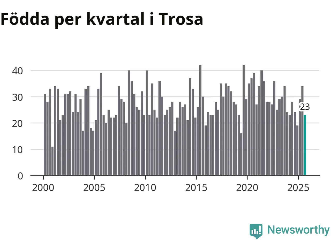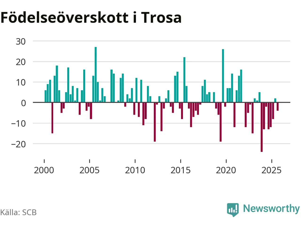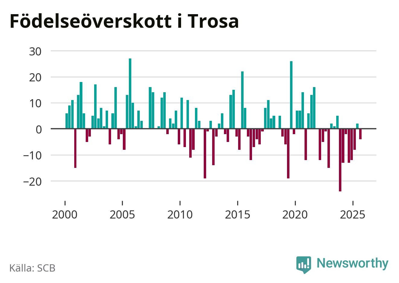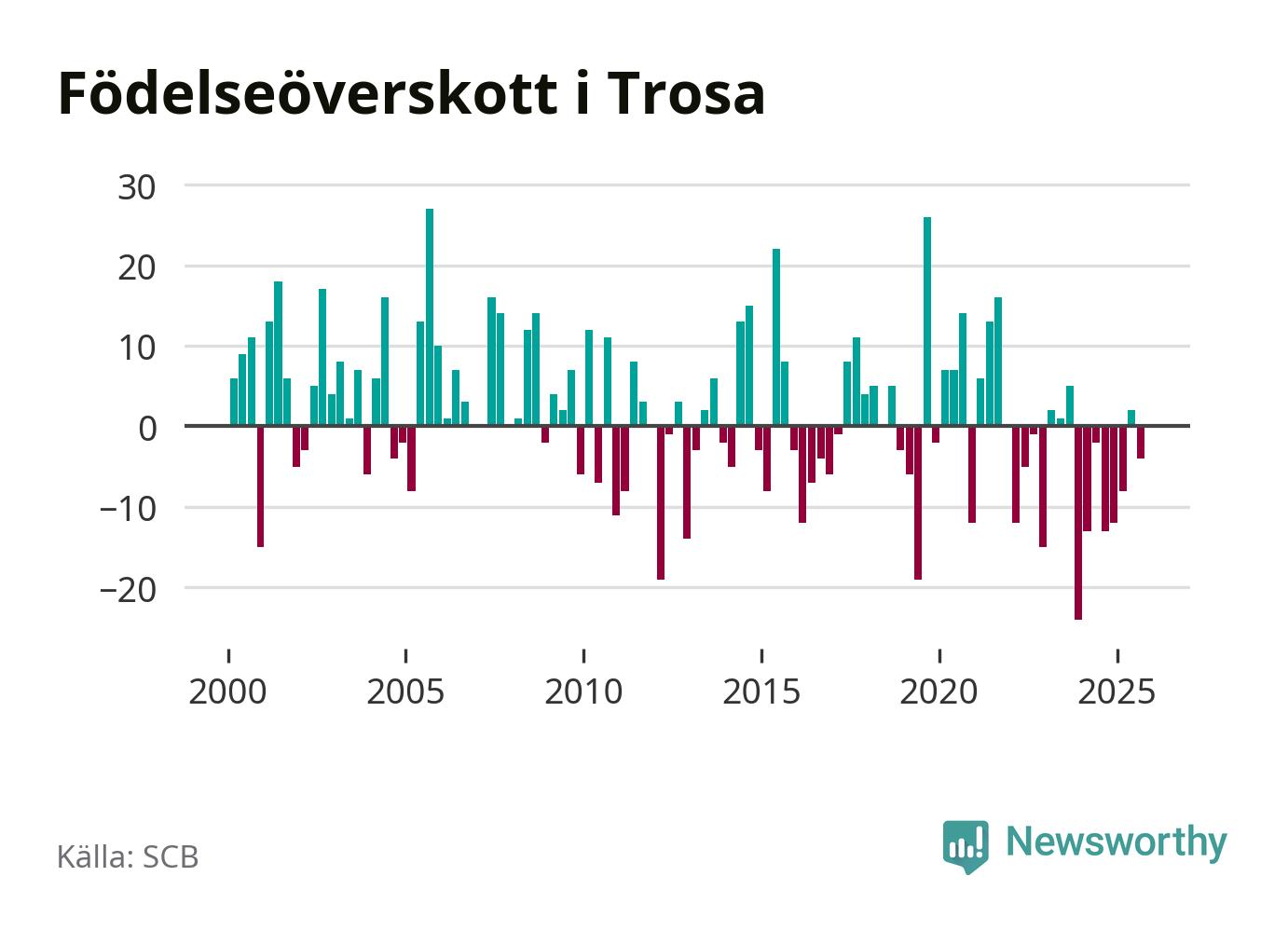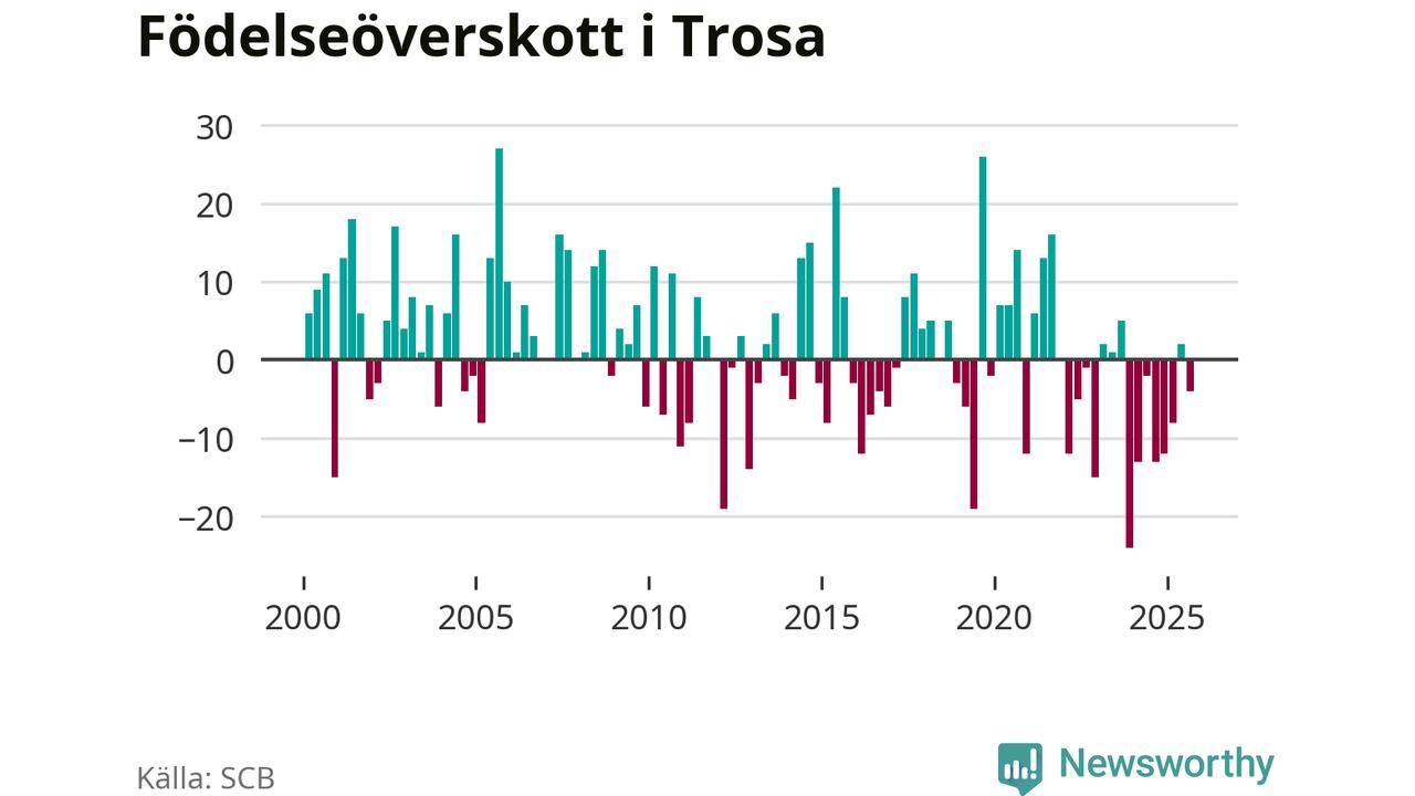 Enligt SCB:s siffror föddes 23 barn i Trosa under det senaste kvartalet. Samtidigt avled 27 personer. Skillnaden mellan antal födda och döda är så liten att det inte går att säga om det beror på något annat än SCB:s röjandeskydd. Kommunen har historiskt sett haft ungefär lika många kvartal med positivt födelsenetto som negativt.