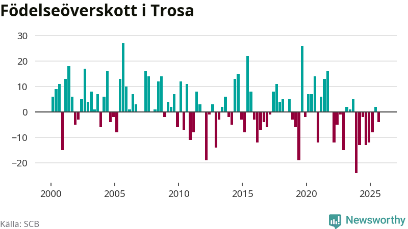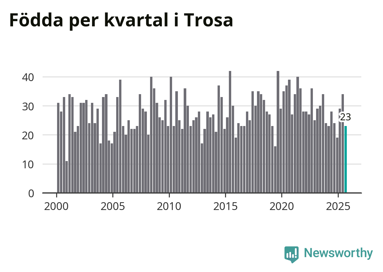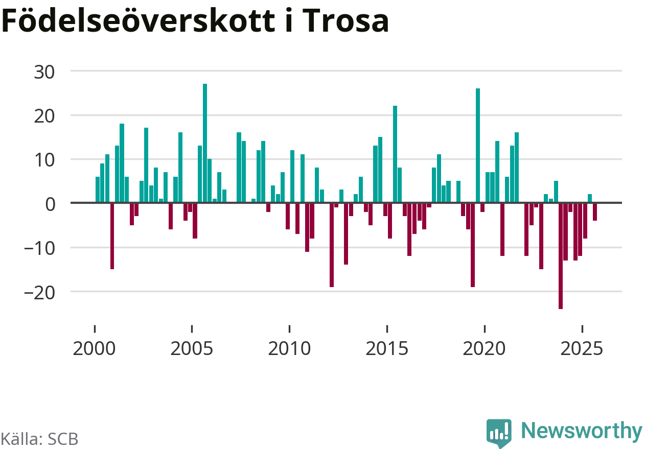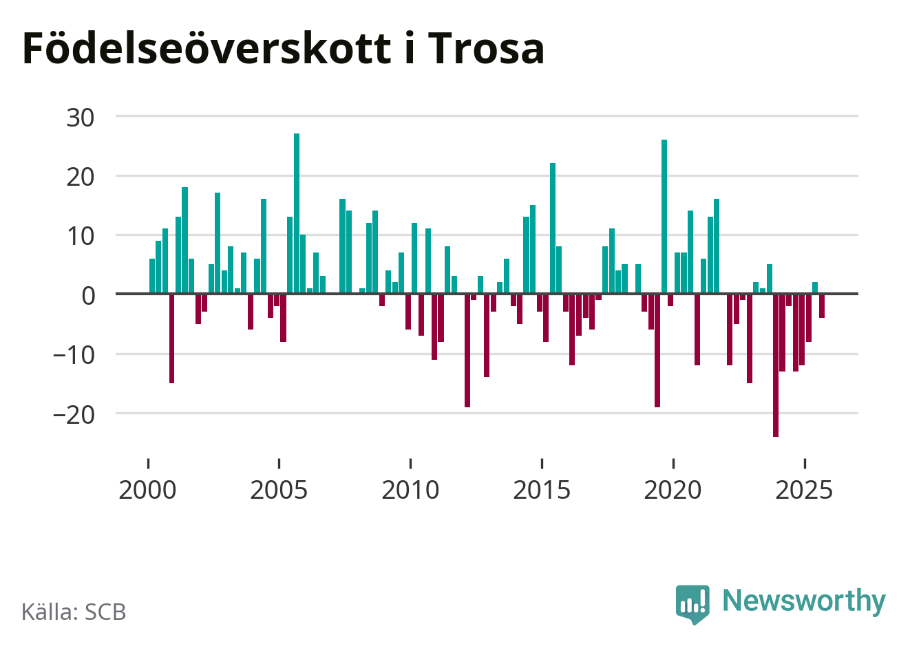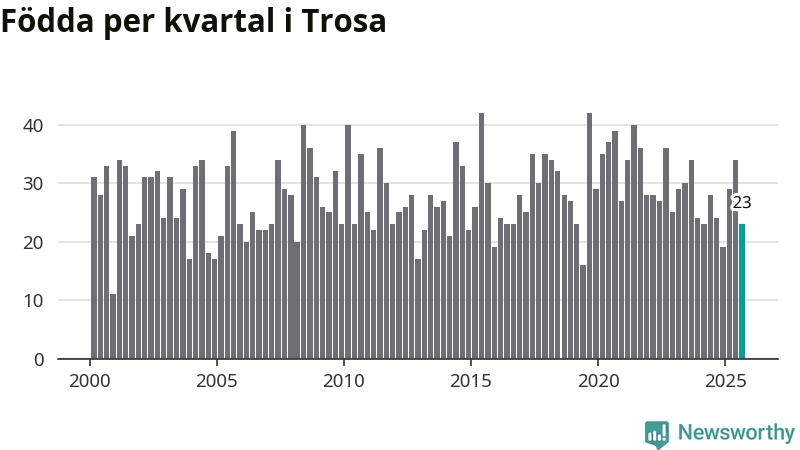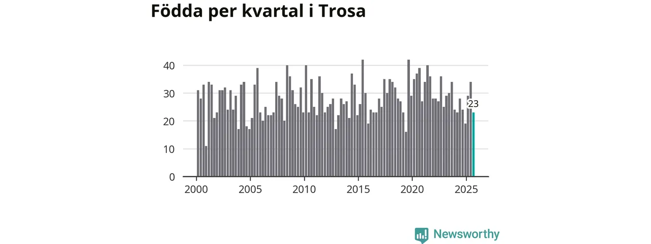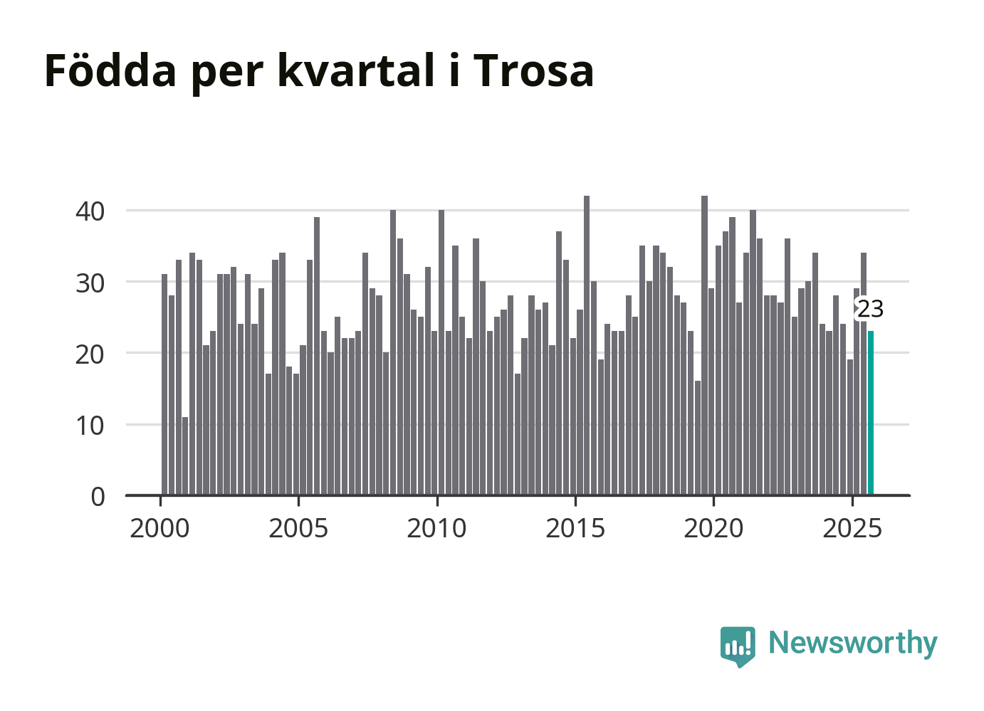 Enligt SCB:s siffror föddes 23 barn i Trosa under det senaste kvartalet. Samtidigt avled 27 personer. Skillnaden mellan antal födda och döda är så liten att det inte går att säga om det beror på något annat än SCB:s röjandeskydd. Kommunen har historiskt sett haft ungefär lika många kvartal med positivt födelsenetto som negativt.