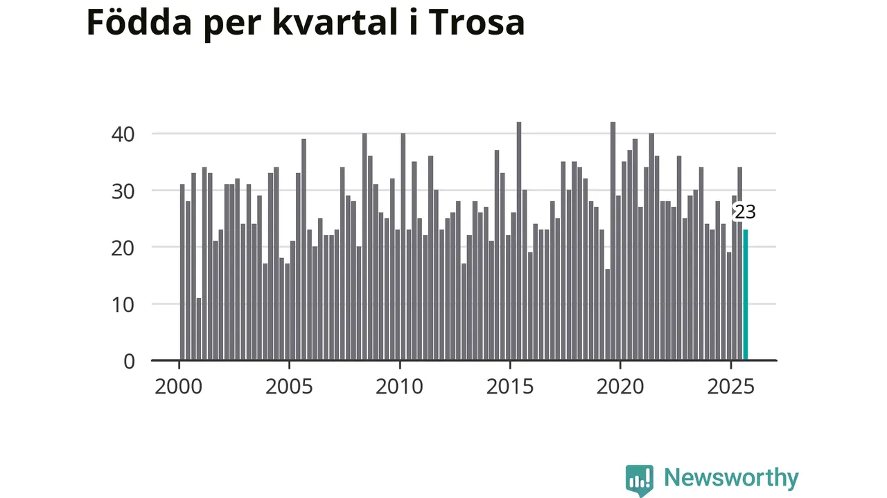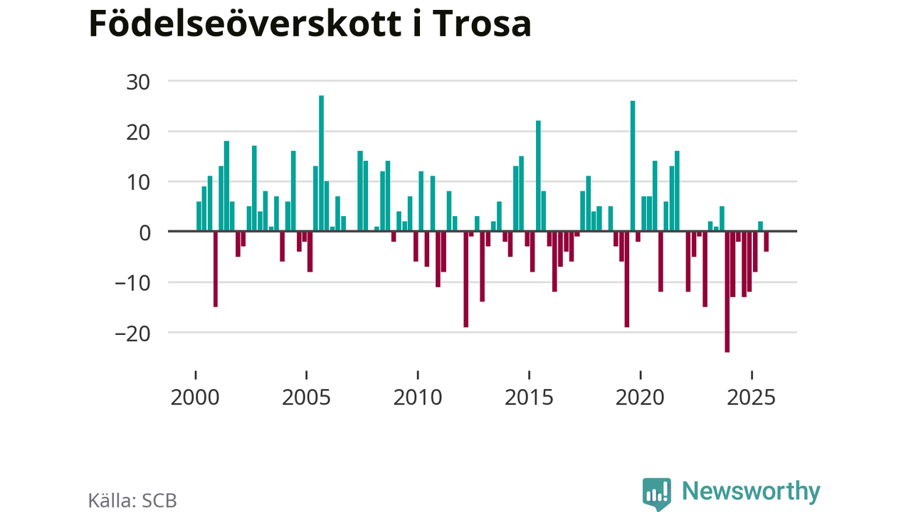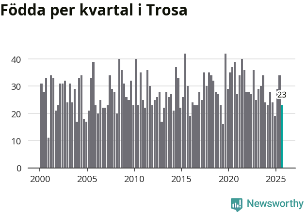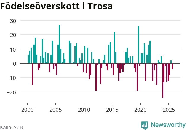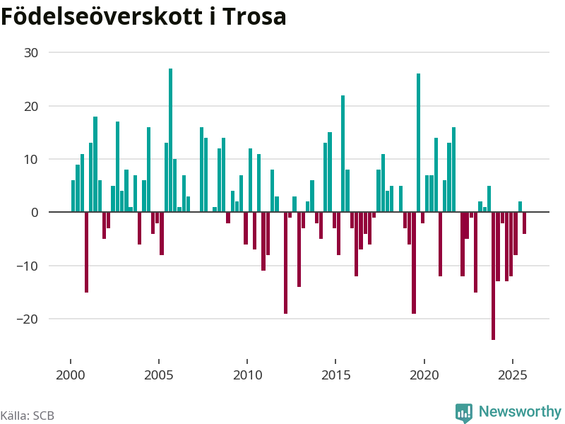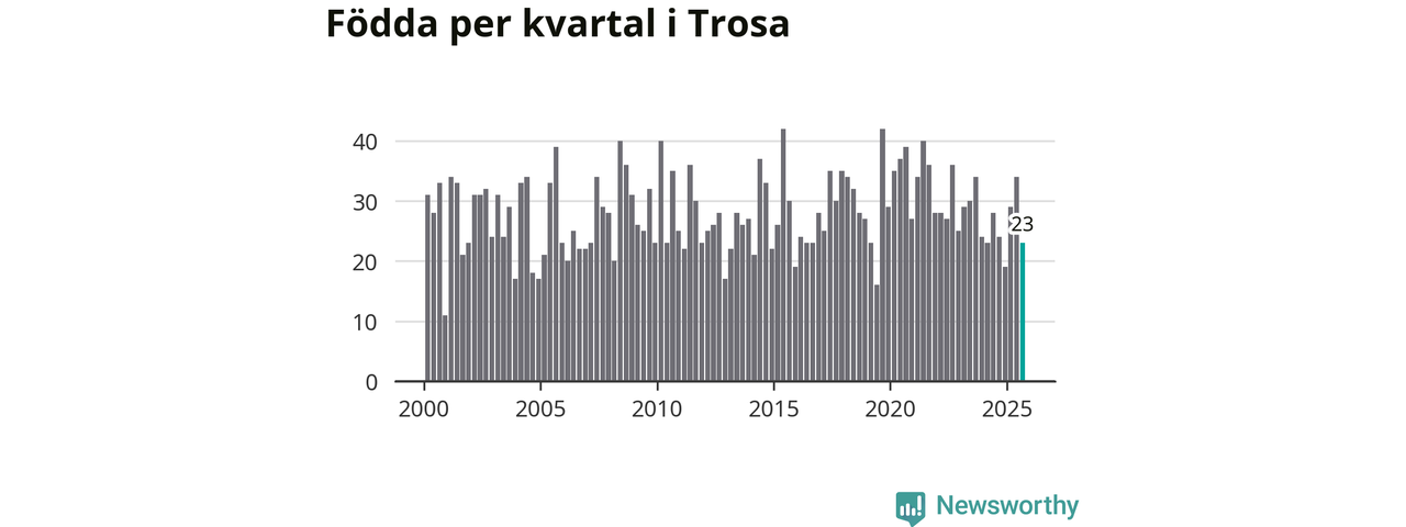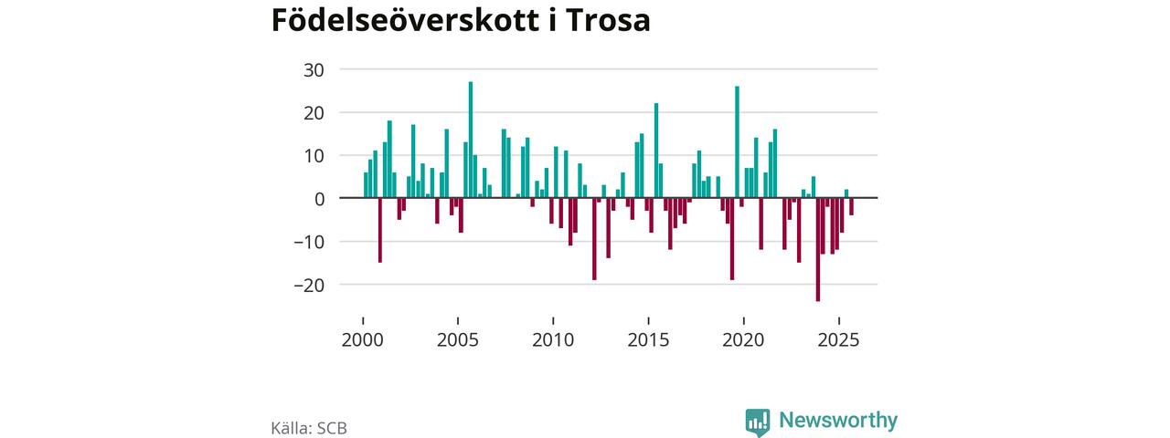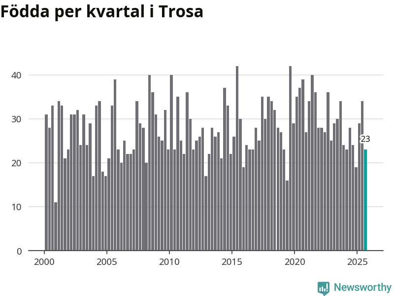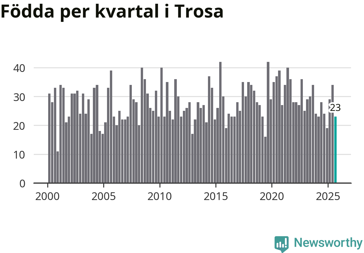 Enligt SCB:s siffror föddes 23 barn i Trosa under det senaste kvartalet. Samtidigt avled 27 personer. Skillnaden mellan antal födda och döda är så liten att det inte går att säga om det beror på något annat än SCB:s röjandeskydd. Kommunen har historiskt sett haft ungefär lika många kvartal med positivt födelsenetto som negativt.